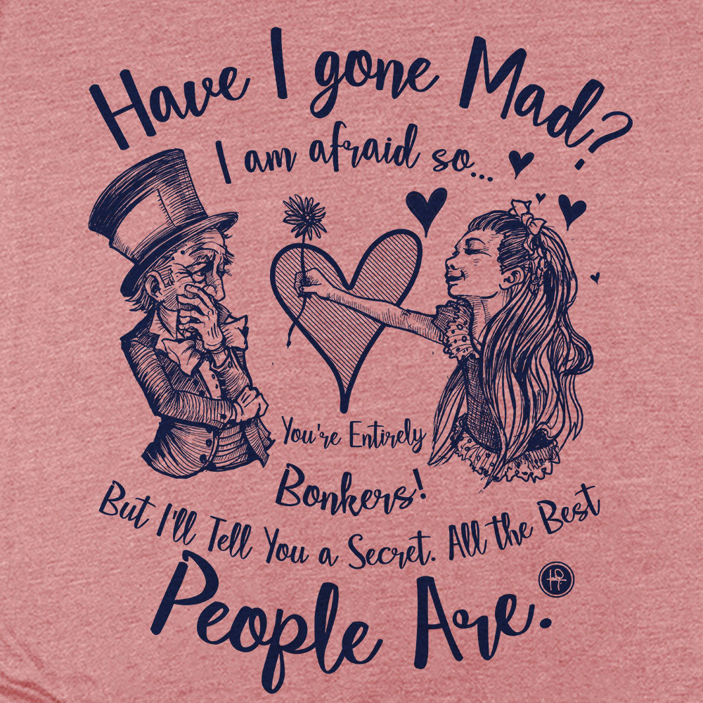 Enter the whimsical world of Alice in Wonderland with our enchanting "Have I Gone Mad?" design, capturing a poignant moment from the classic tale. One of Fab's earliest creations, the inking style pays homage to the original illustrator, John Tenniel. A key challenge of this design was the placement of the quote.