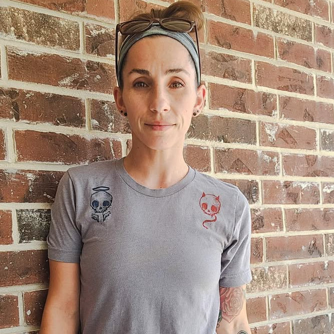 Explore our "Angels & Devils On Your Shoulders: Seductive Temptations" design. This artwork features small skulls representing good and evil, portrayed with thick line work and expressive halftone shading, embodying a blend of temptation and moral struggle.