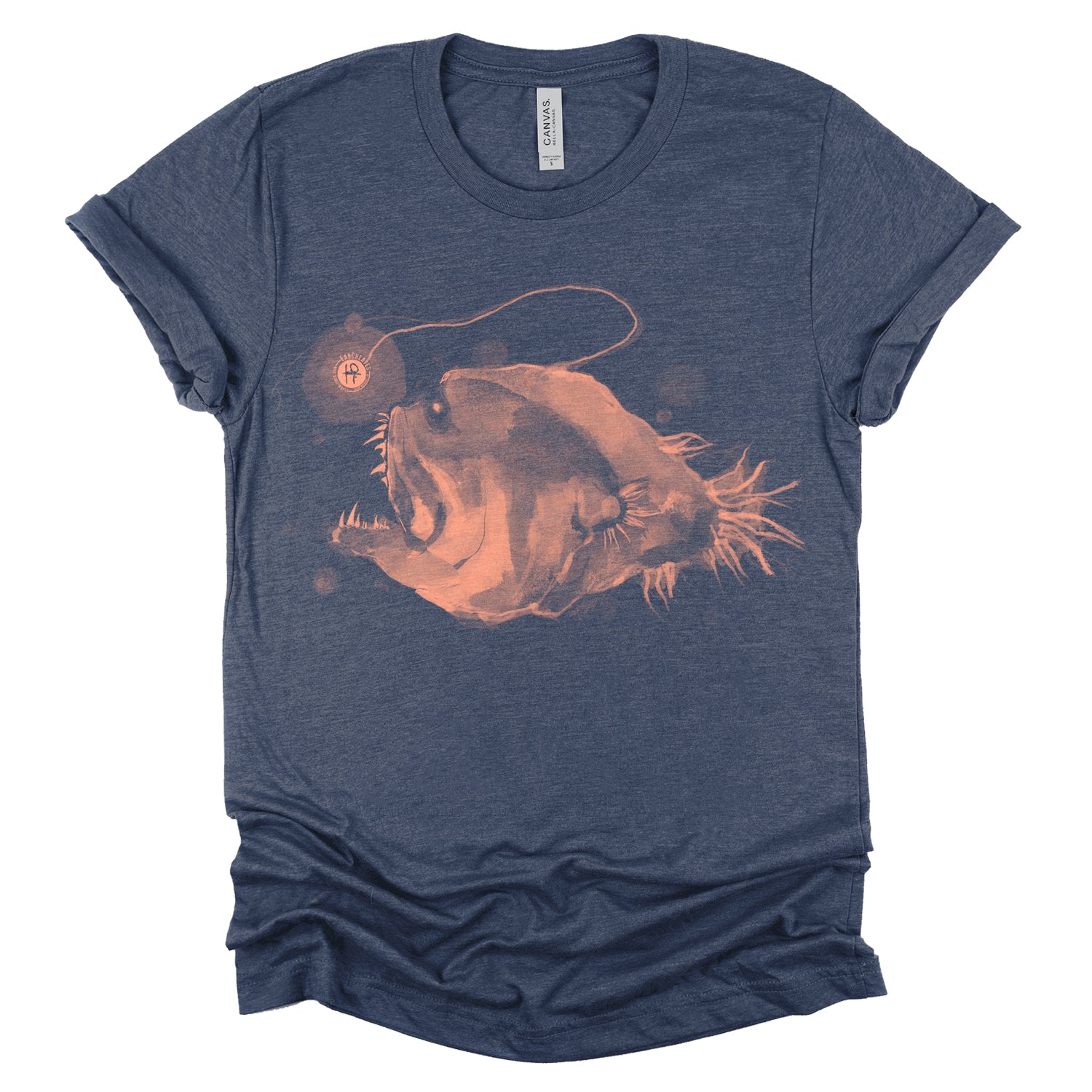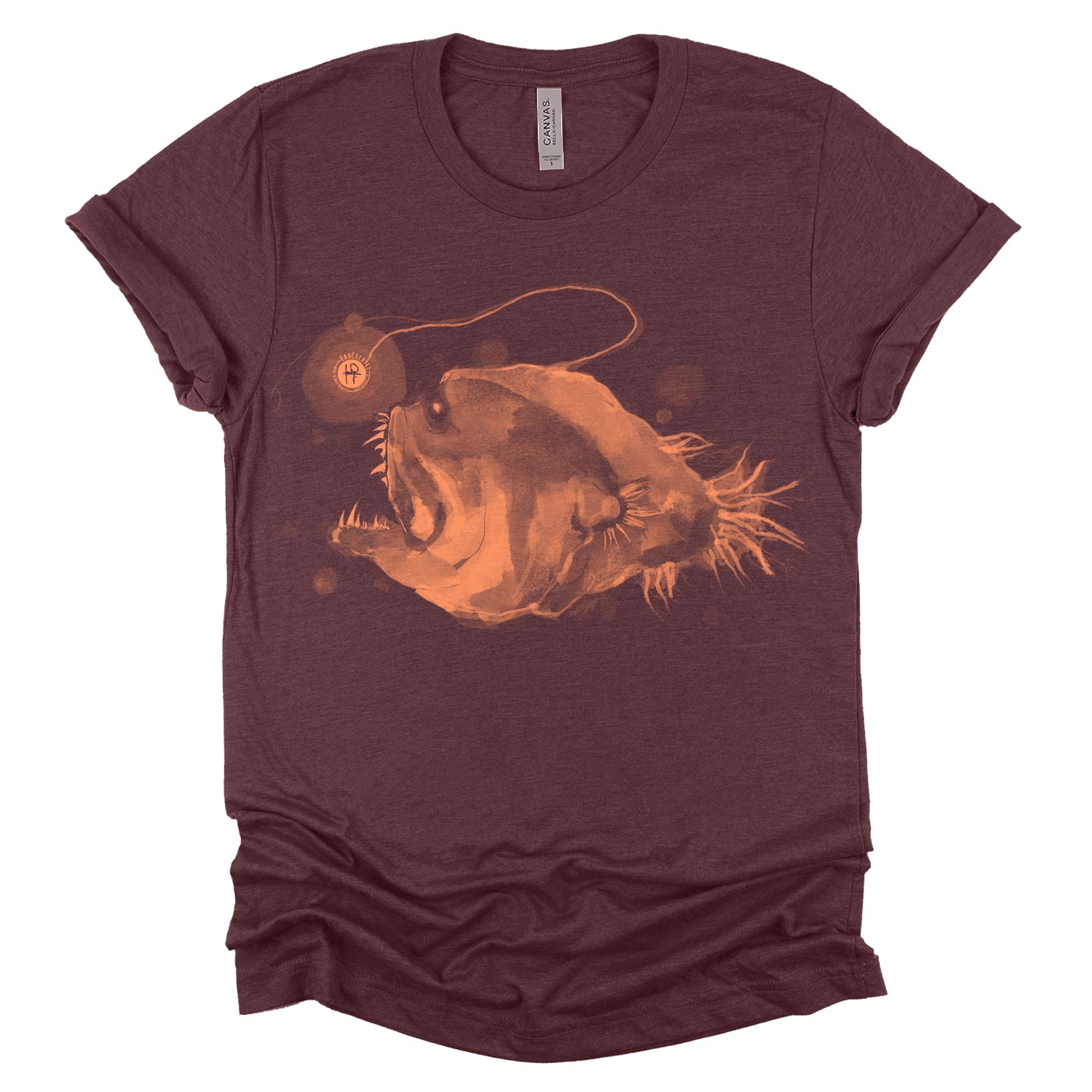 Introducing our "Angler Fish: Depths of Deception" design, showcasing a grotesque angler fish emerging from the shadows. Fab employs heavy, fluid halftone patterns to create a watercolor-like feel while maintaining an eerie atmosphere.