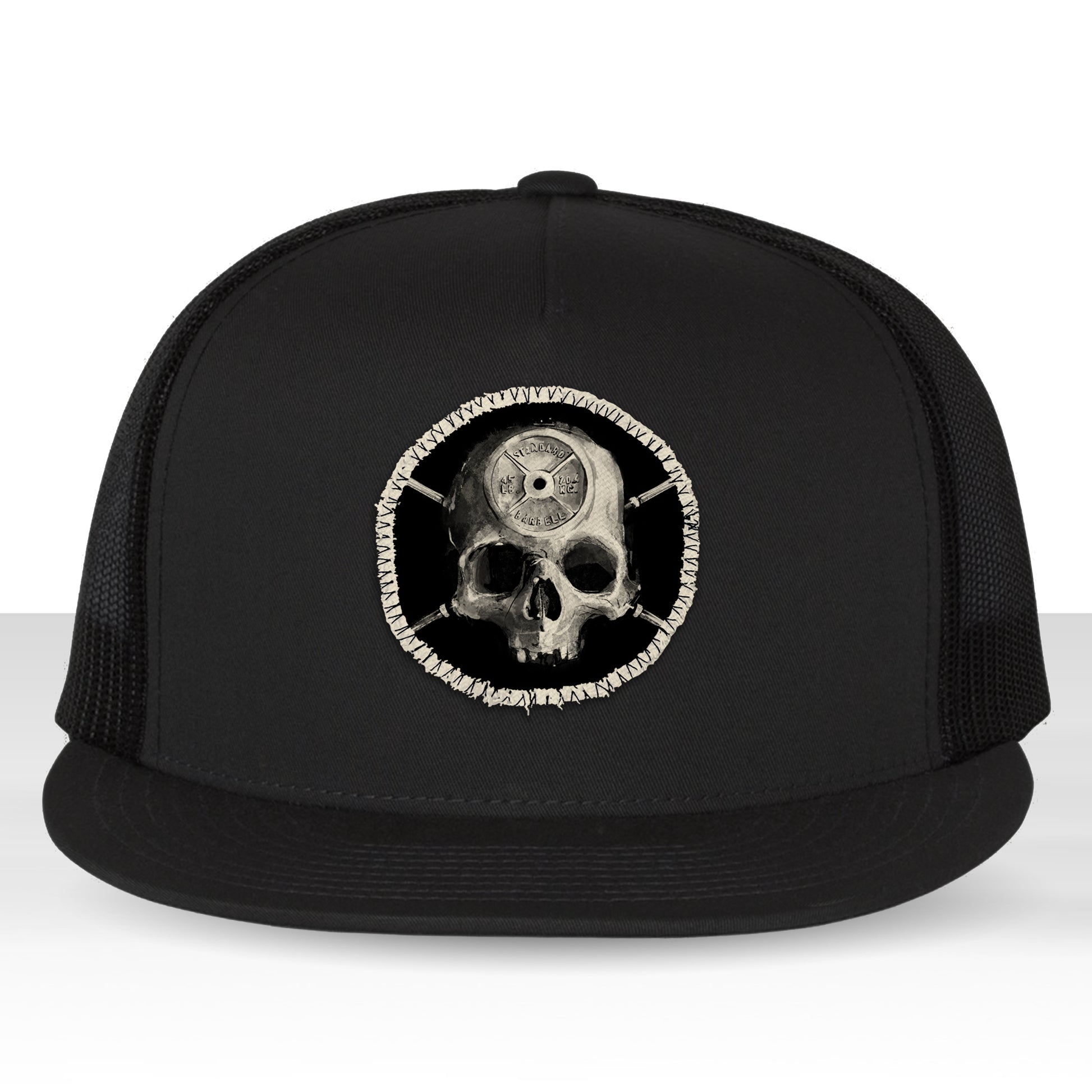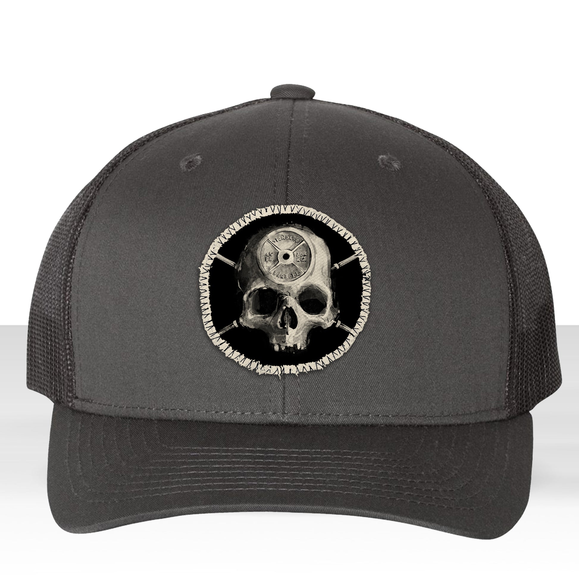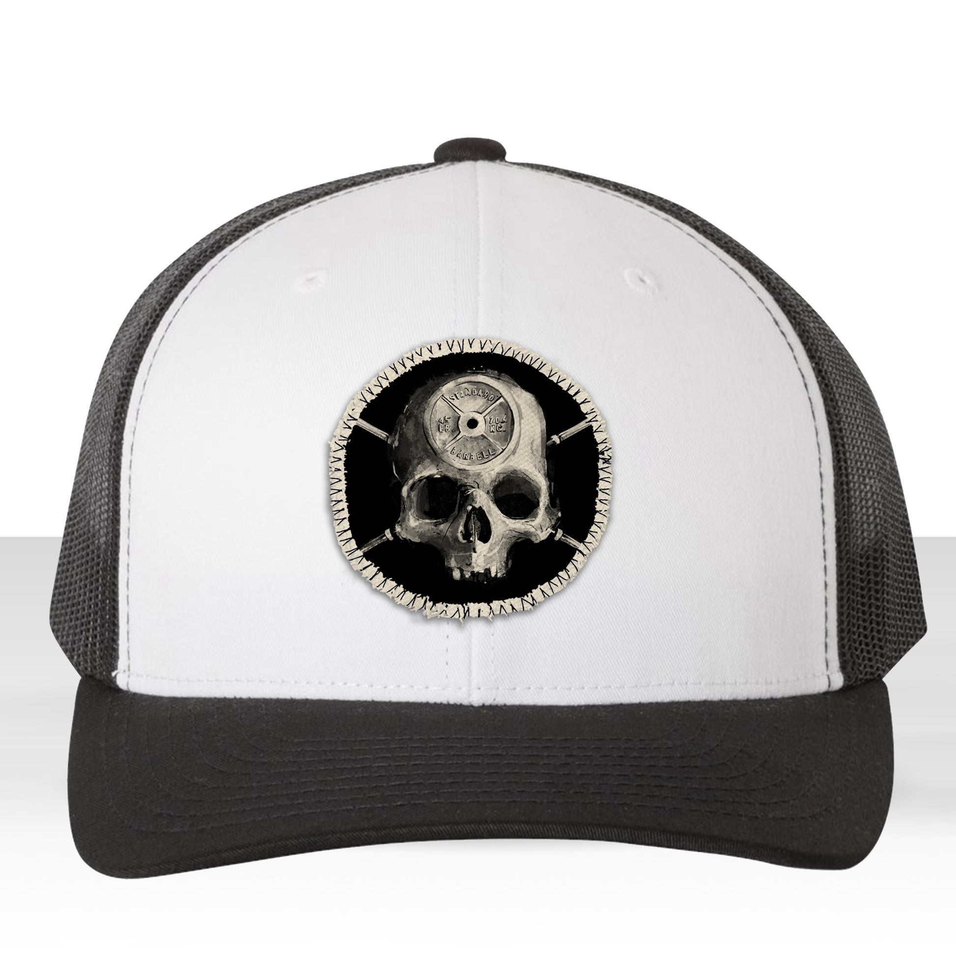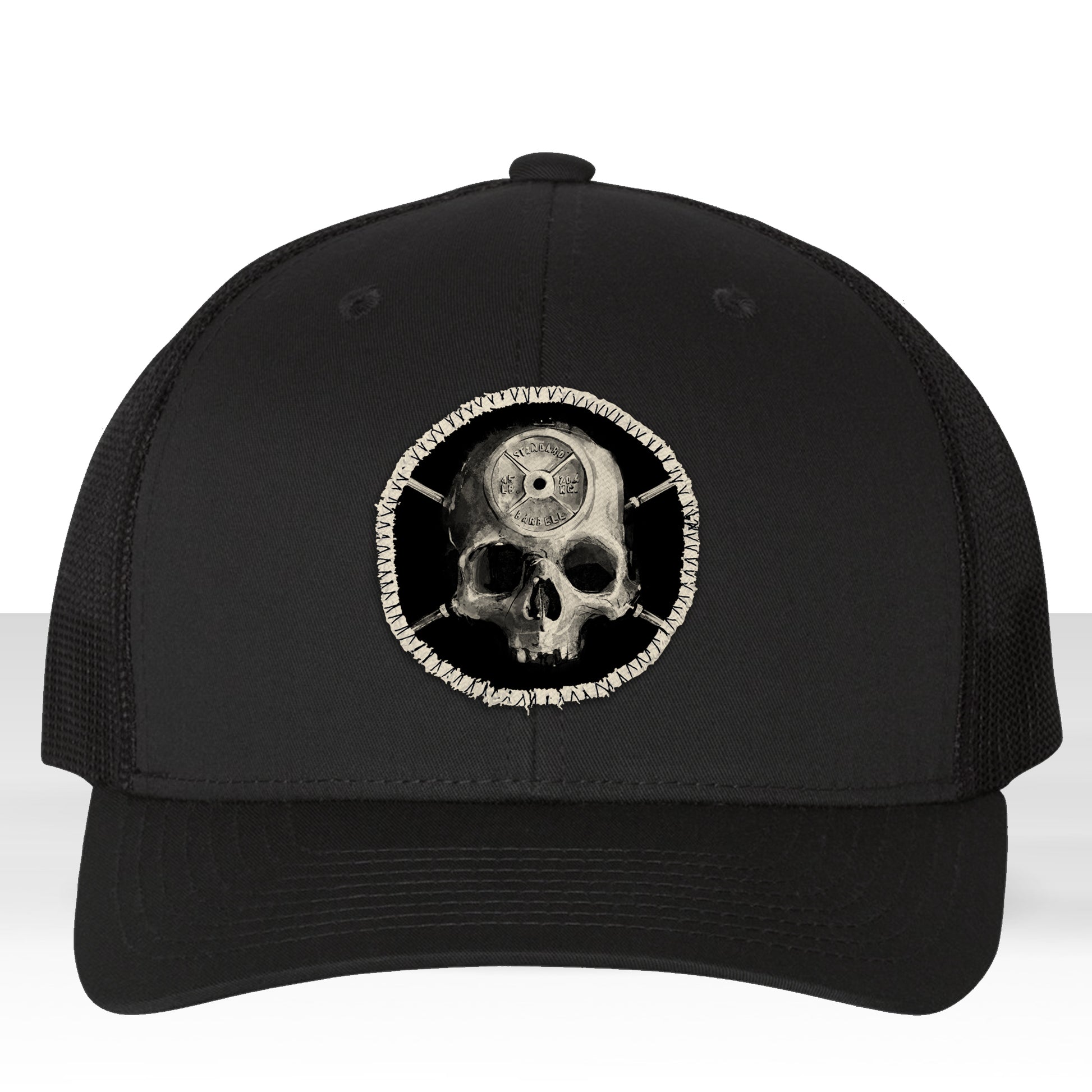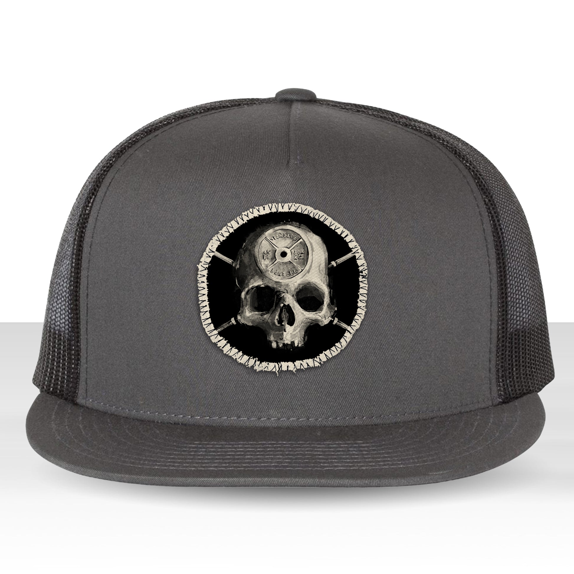 Introducing "Barbell Head: Skulls and Iron" design, featuring a skull adorned with a carved 45 plate in its forehead and Olympic barbell bars as crossbones. The disorganized use of Fab's shading and textures gives this piece a vintage, worn-out look, adding character and depth to its bold symbolism.