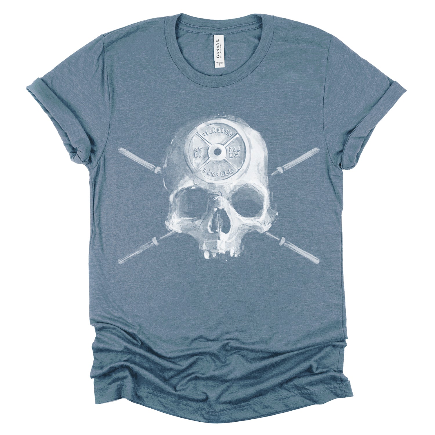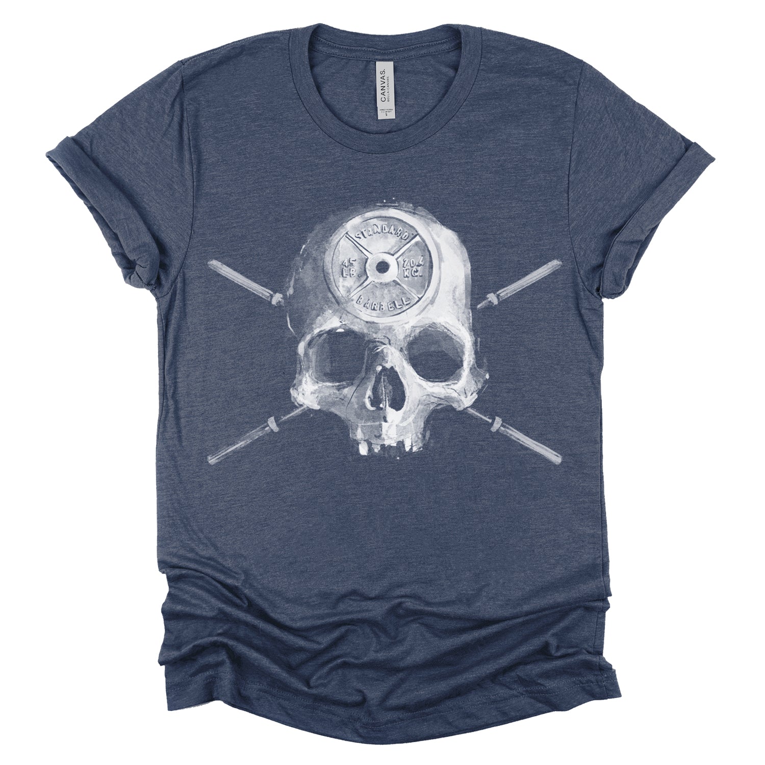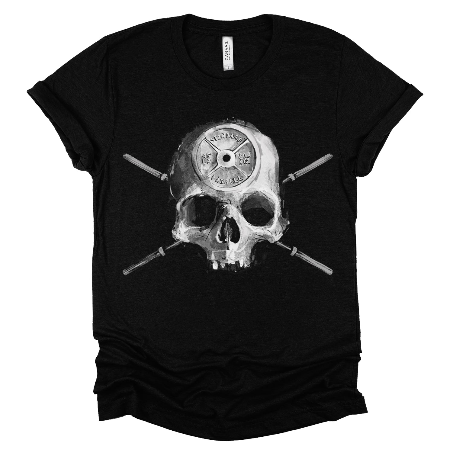 Introducing "Barbell Head: Skulls and Iron" design, featuring a skull adorned with a carved 45 plate in its forehead and Olympic barbell bars as crossbones. The disorganized use of Fab's shading and textures gives this piece a vintage, worn-out look, adding character and depth to its bold symbolism.