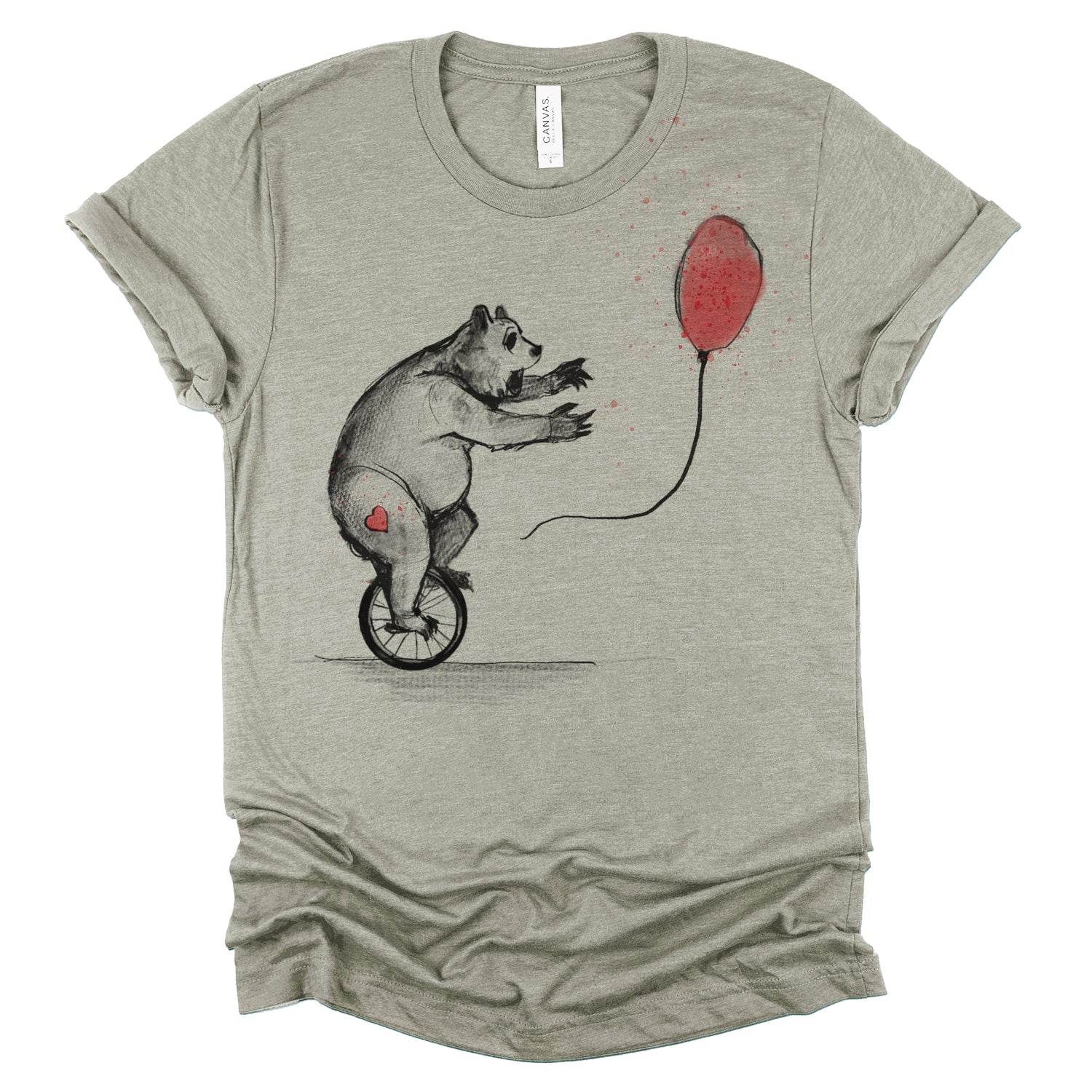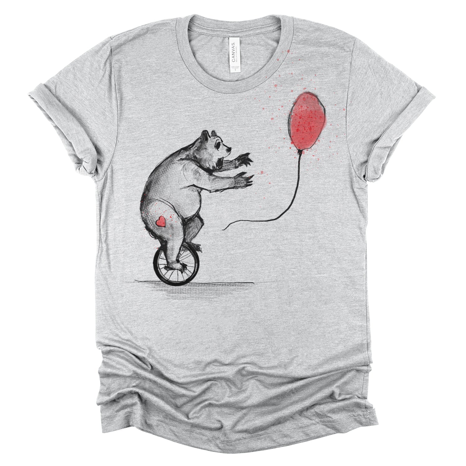 Join the whimsical adventure with our "Bear in His Unicycle: Balloon Chase" design. Watch as this determined bear pedals furiously, trying to catch its elusive balloon. This piece evokes vintage illustrations from tale and fable books, rendered in a sketchy style with Fab's signature red wash and splatters, adding depth and character to the scene.