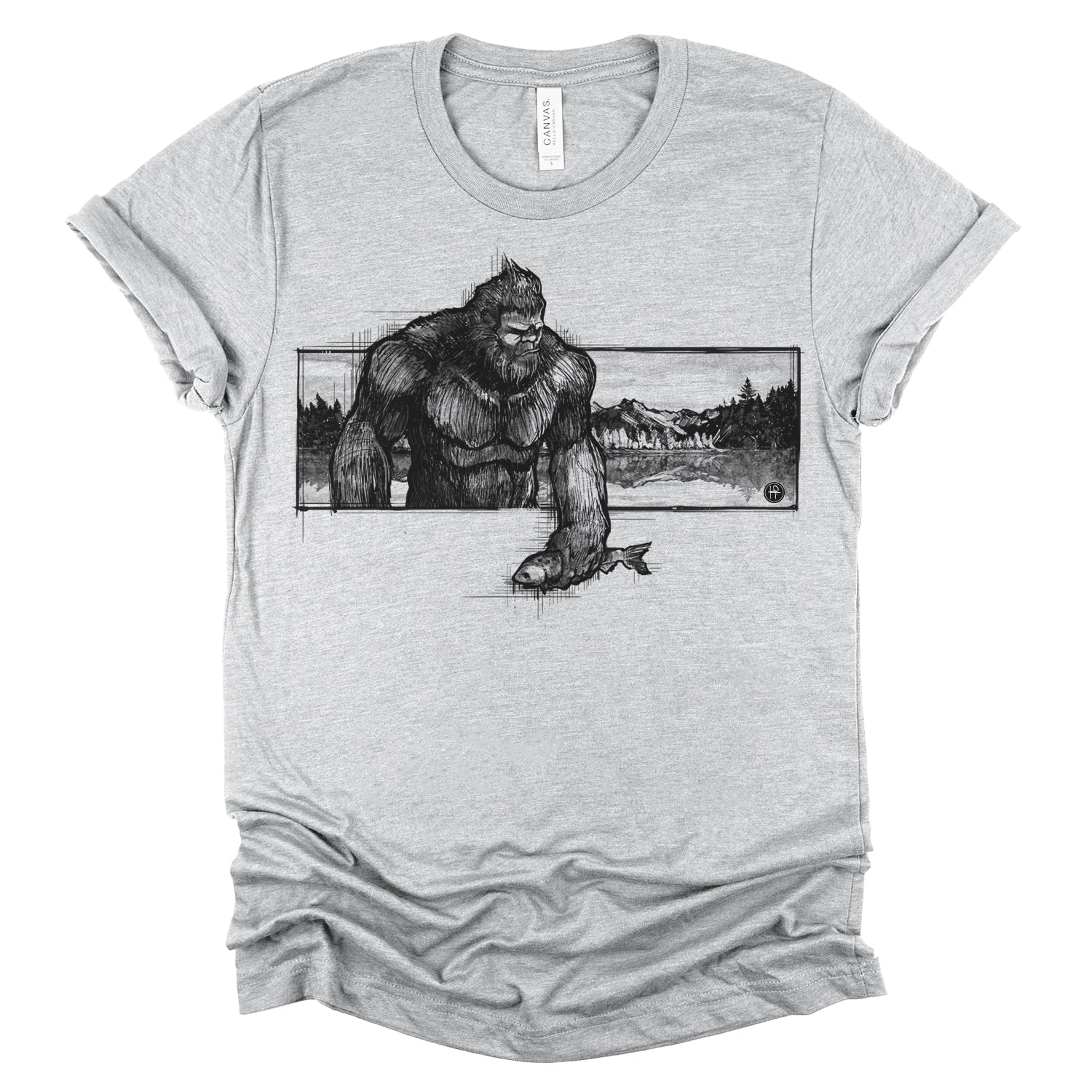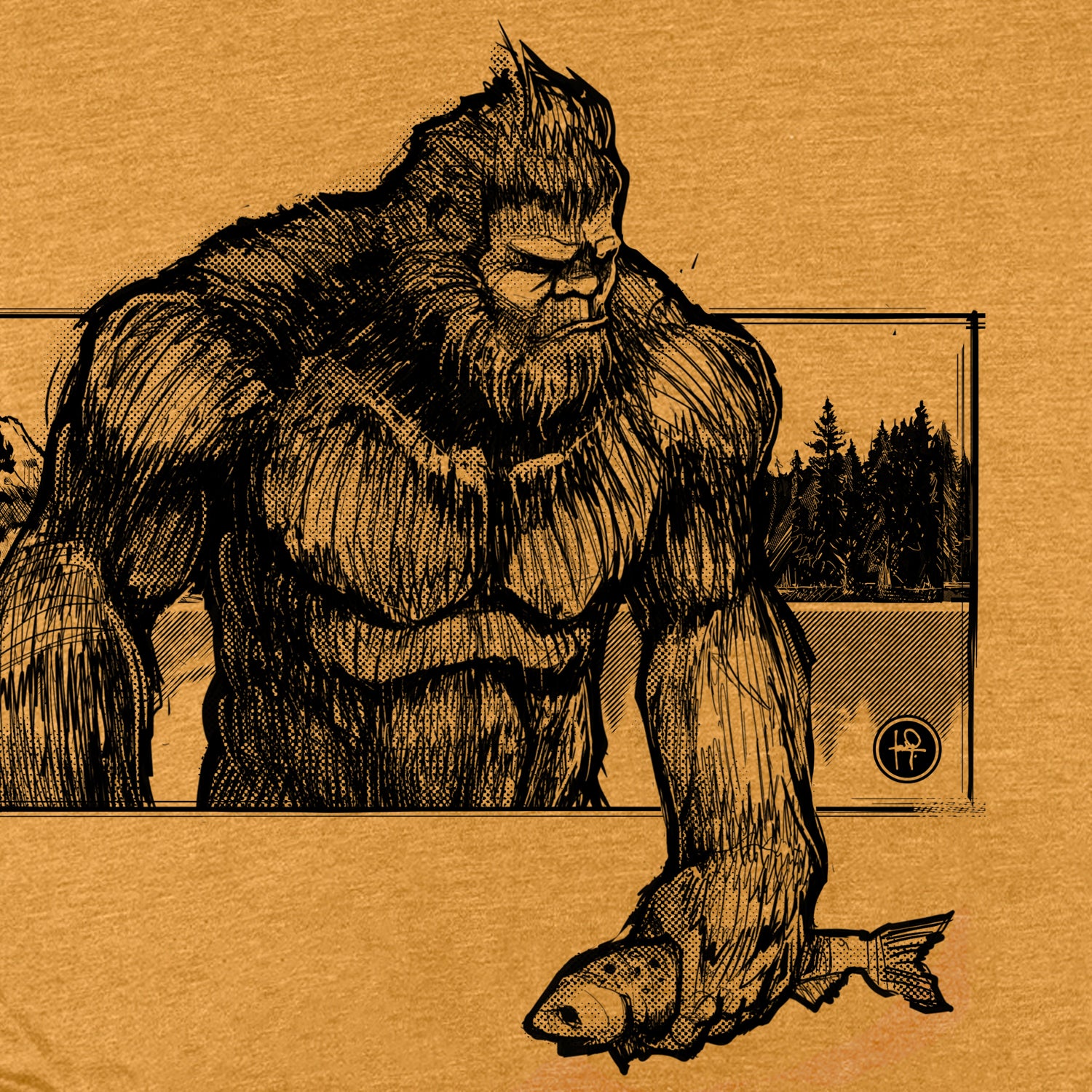 Explore with our "Bigfoot with Fish: Wyoming Wilderness" design. In this piece, Bigfoot proudly holds his catch of the day amidst the Wyoming wilderness. Fab employs extensive crosshatching to render the creature and uses a panoramic style for the background, capturing the essence of this mysterious and rugged landscape.