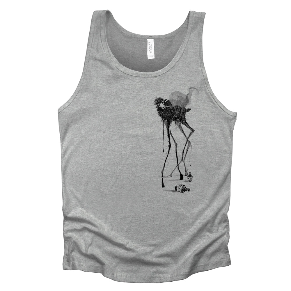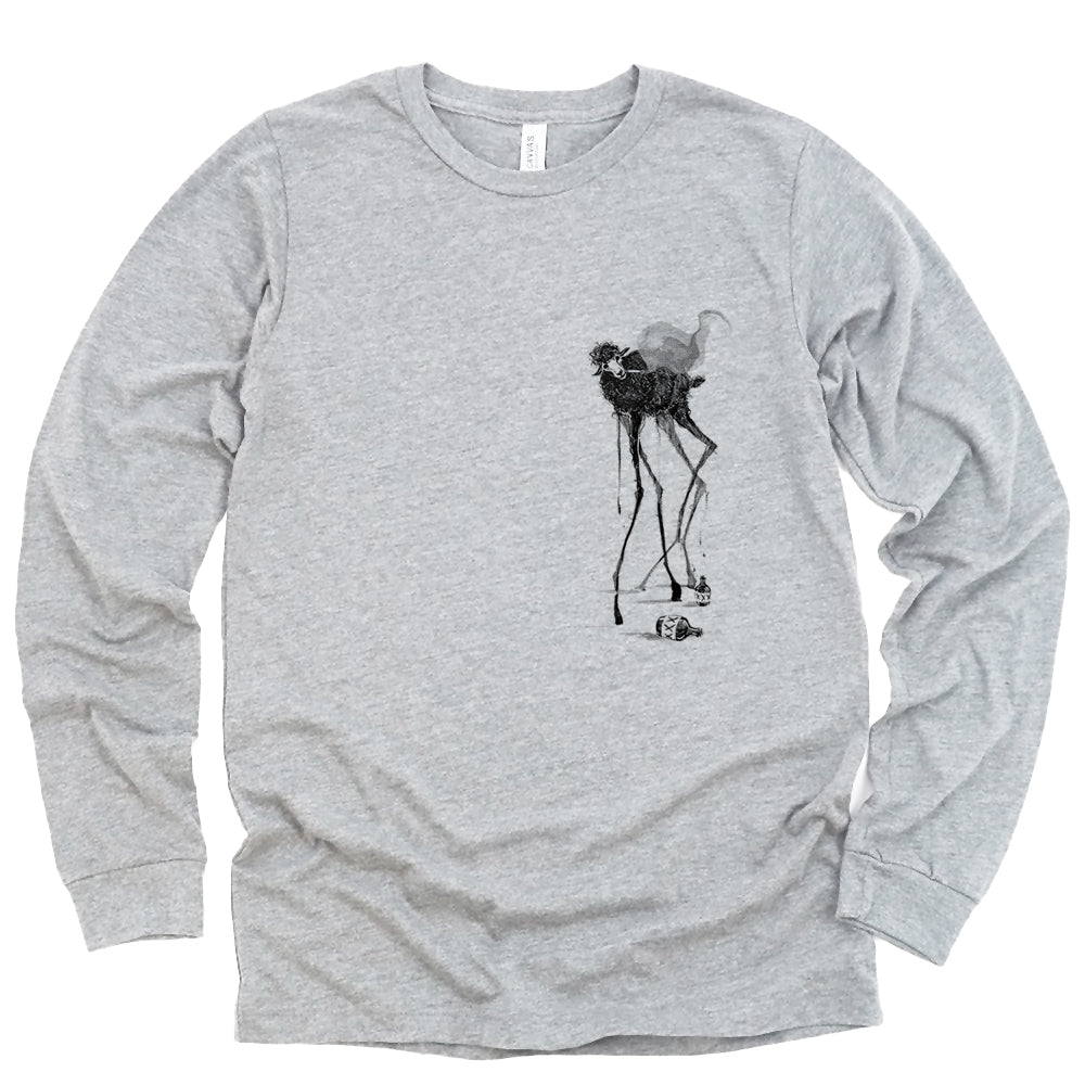 This eerie yet whimsical pocket design features a creepy black sheep with elongated, Dali-inspired legs, casually smoking and drinking. A bold blend of surrealism and rebellion, it’s the ultimate statement piece for those who embrace the peculiar. Simple, striking, and full of character.