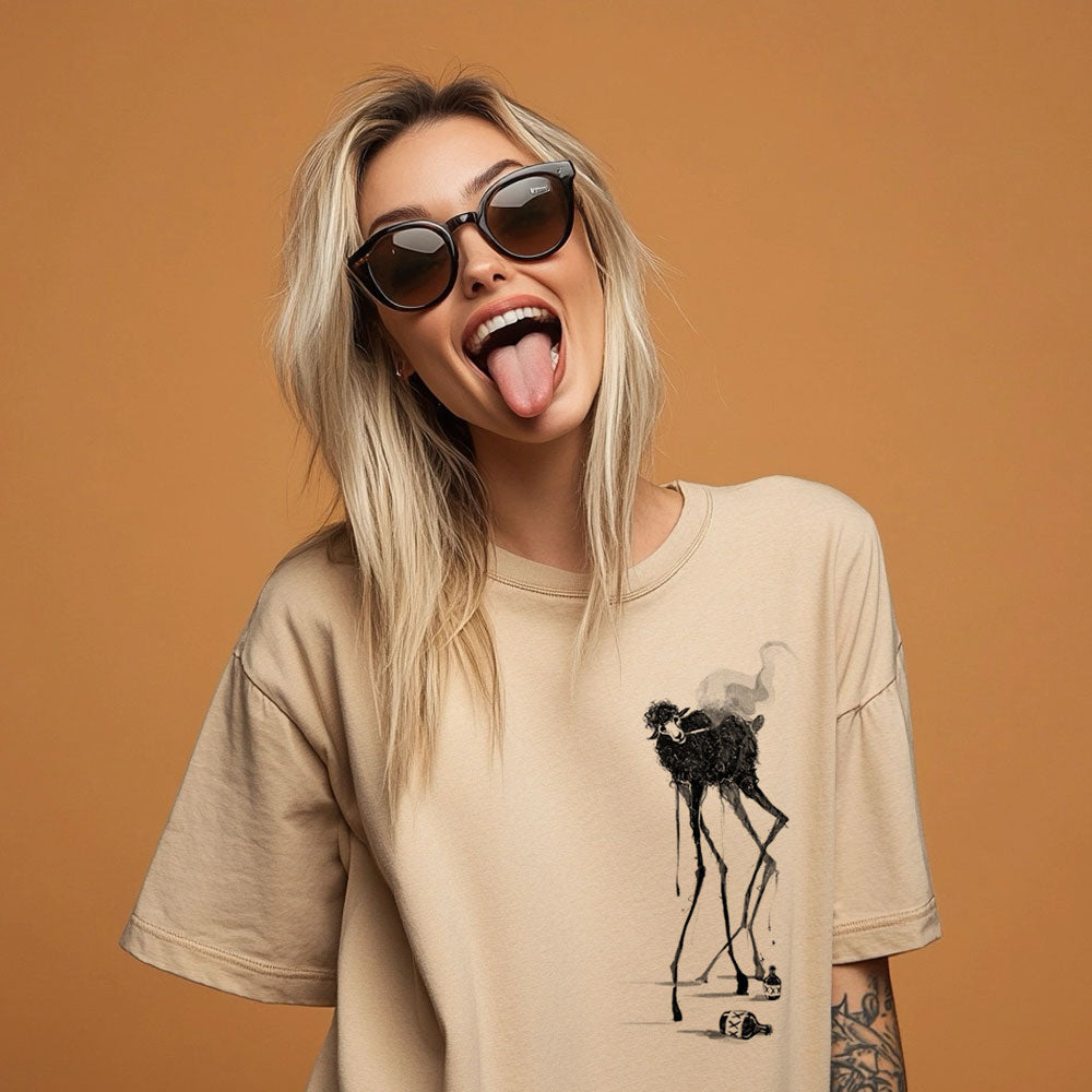 This eerie yet whimsical pocket design features a creepy black sheep with elongated, Dali-inspired legs, casually smoking and drinking. A bold blend of surrealism and rebellion, it’s the ultimate statement piece for those who embrace the peculiar. Simple, striking, and full of character.