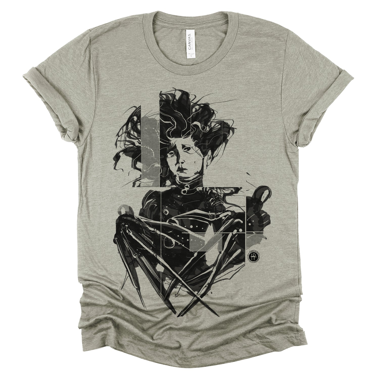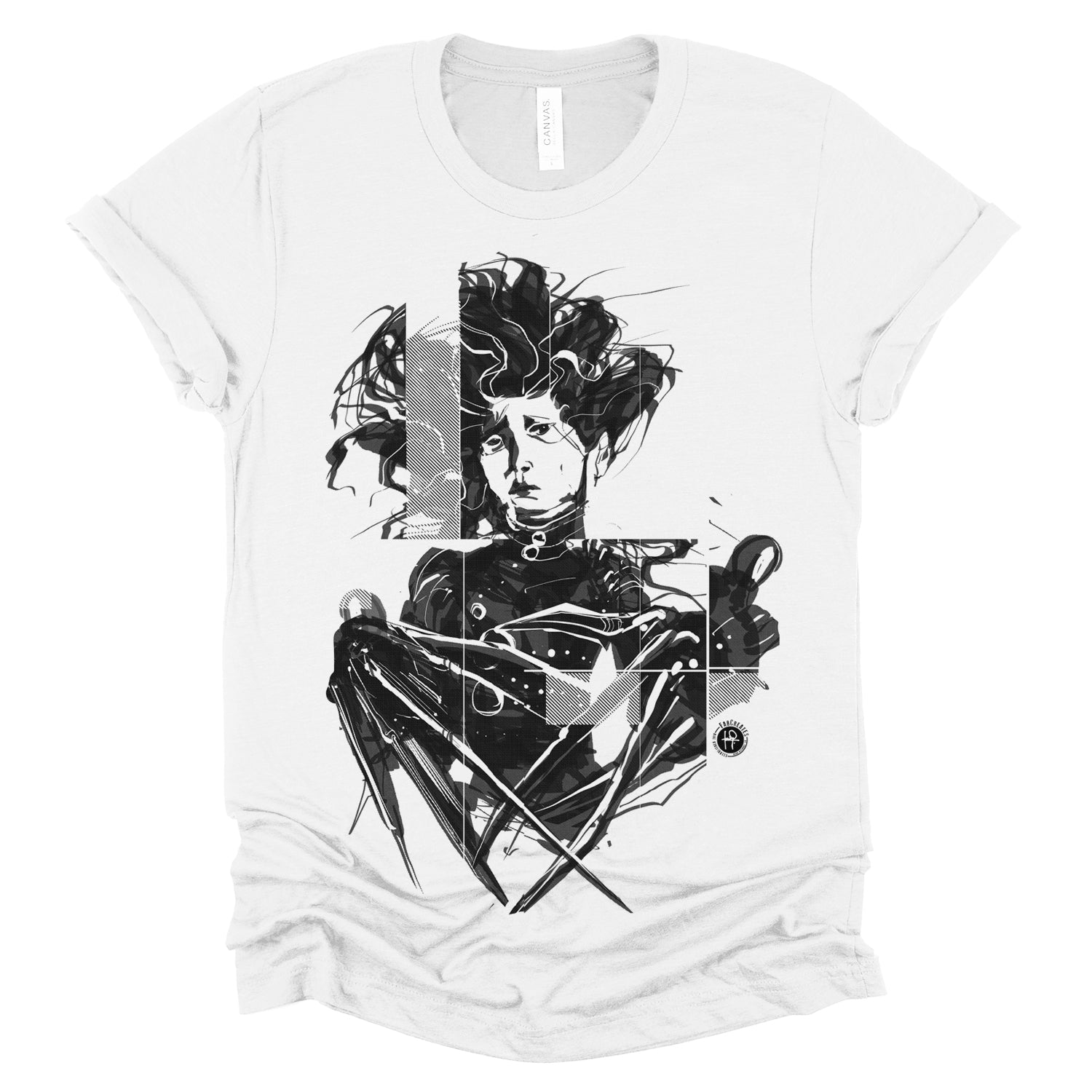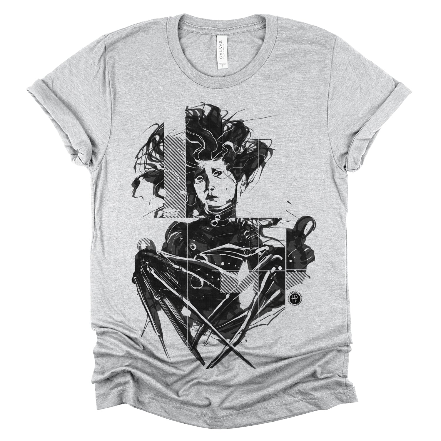Celebrate the whimsical world of Tim Burton with our "Crazy Scissors Hands" design, paying homage to the iconic character Edward. With FabCreates' unique style and humor, this piece brings a touch of quirky charm to your wardrobe. Fab has captured Edward's sadness using a wet ink brush style, separating the whole piece into thick diagonal lines for screen-printing.