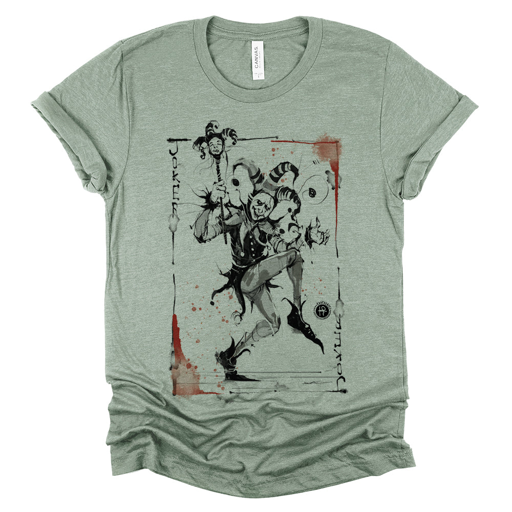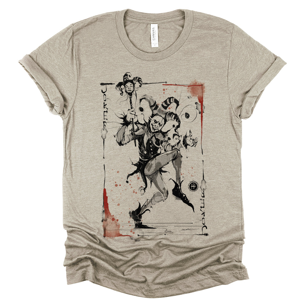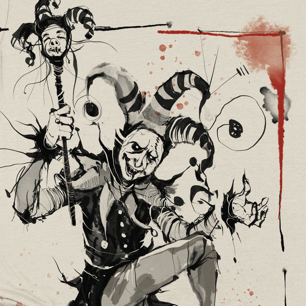 Step into the eerie medieval world with our "Dancing Joker: Shuffle Your Luck" print. This design features fluid, eerie lines and blotchy wet ink work, depicting a joker holding a shrunken head in a strange dance. Inspired by one of the earliest playing card illustrations, it reflects Fab's fascination with the haunting, pale figures of the Dark Ages.