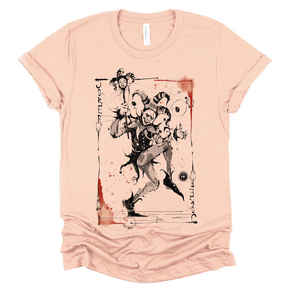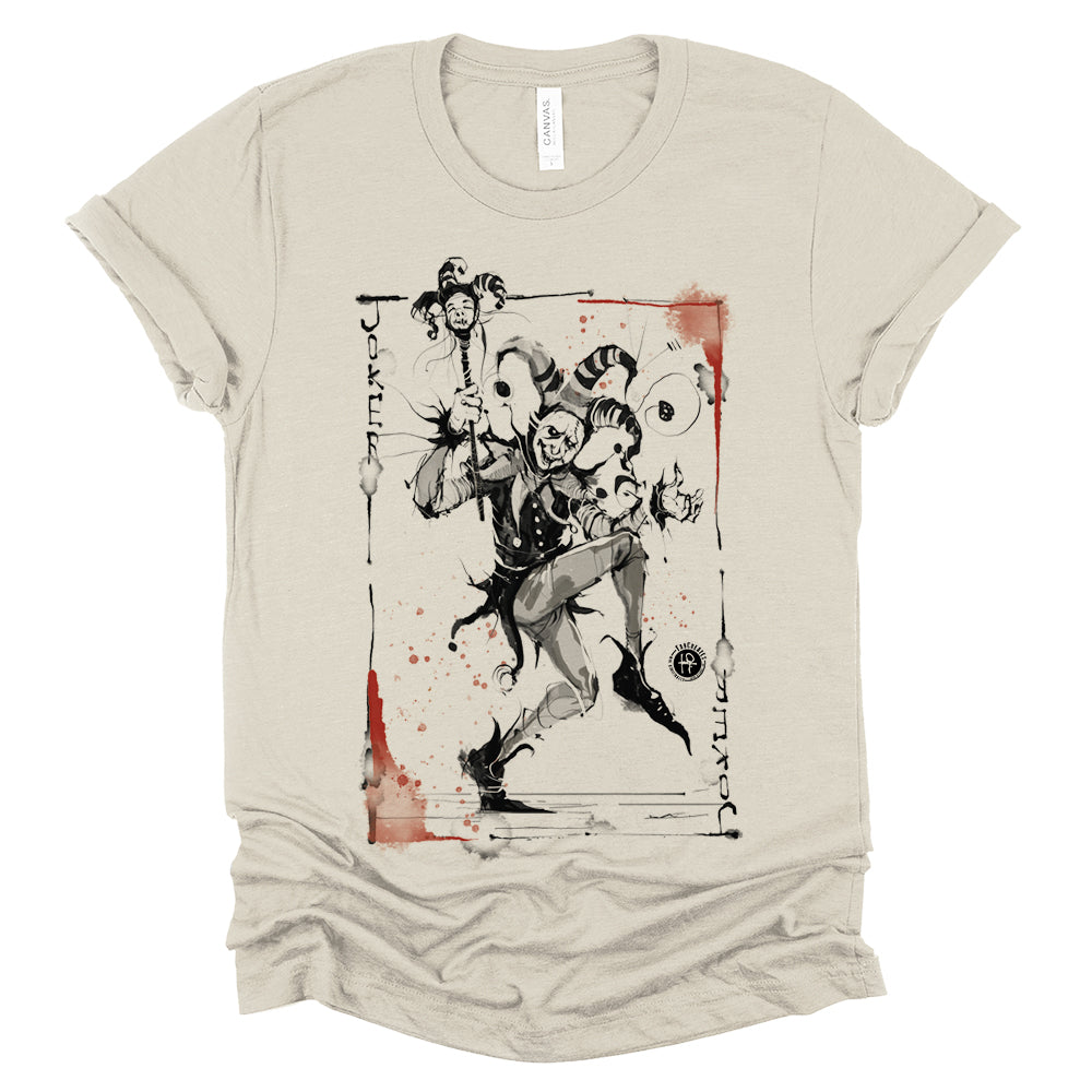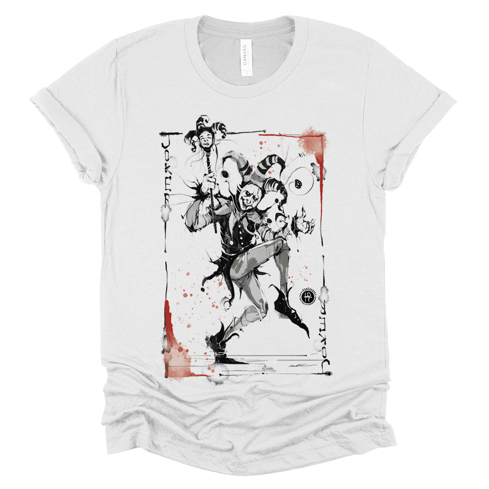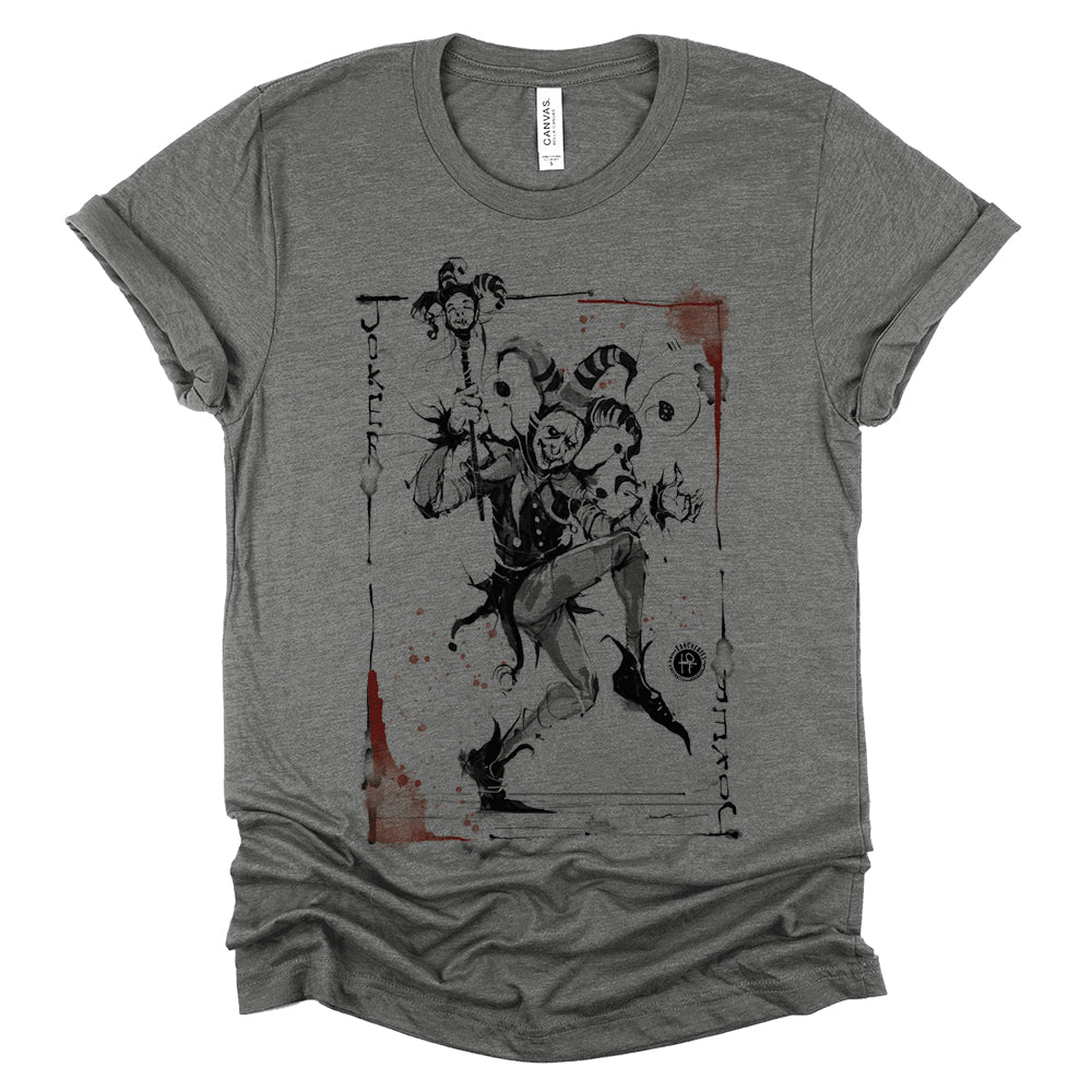 Step into the eerie medieval world with our "Dancing Joker: Shuffle Your Luck" print. This design features fluid, eerie lines and blotchy wet ink work, depicting a joker holding a shrunken head in a strange dance. Inspired by one of the earliest playing card illustrations, it reflects Fab's fascination with the haunting, pale figures of the Dark Ages.
