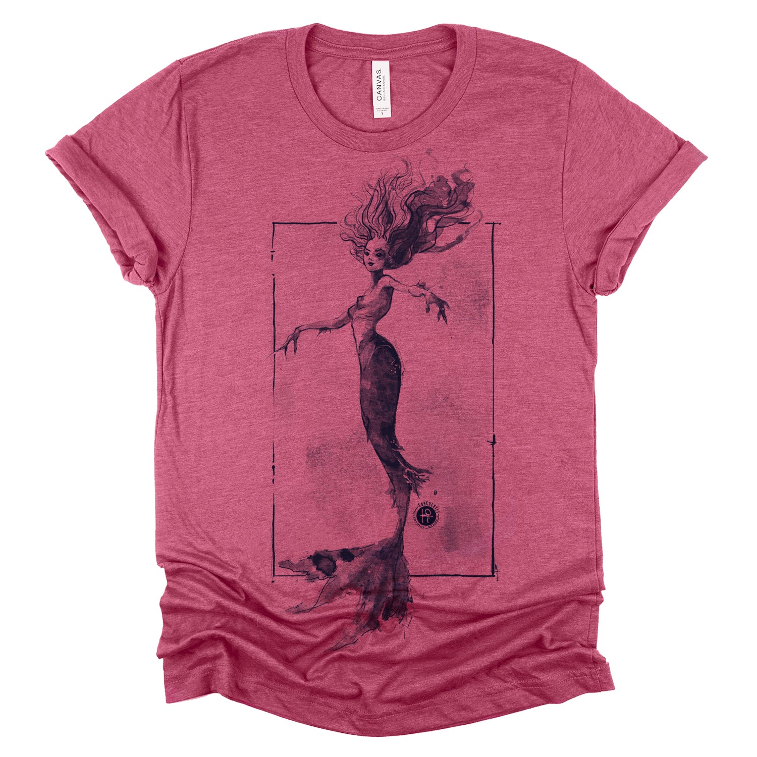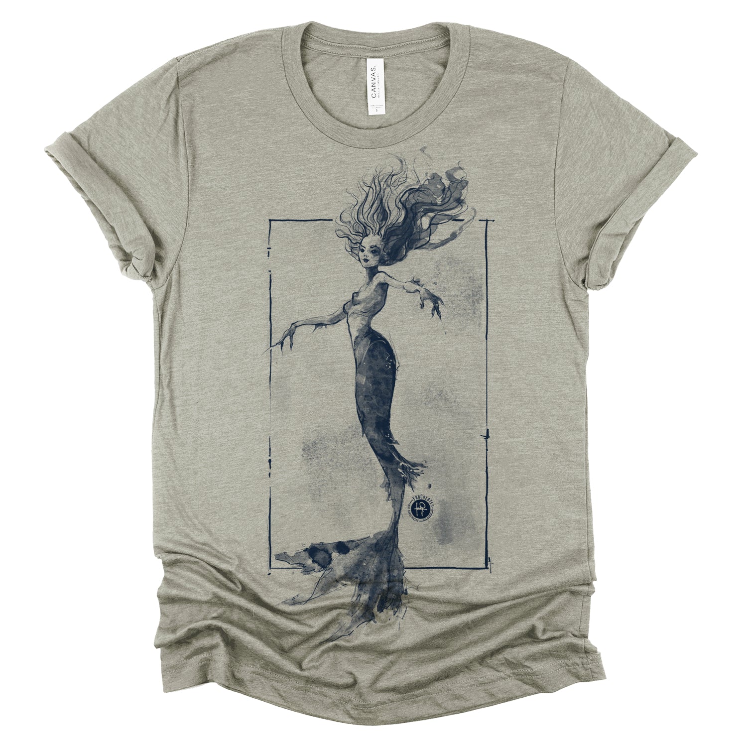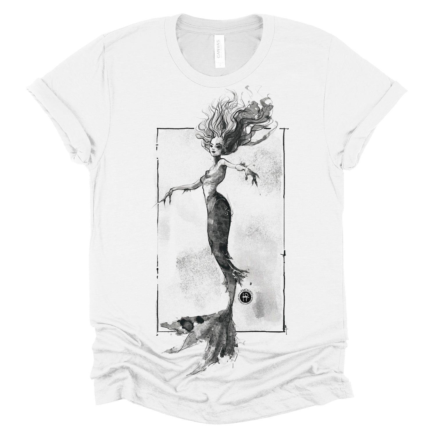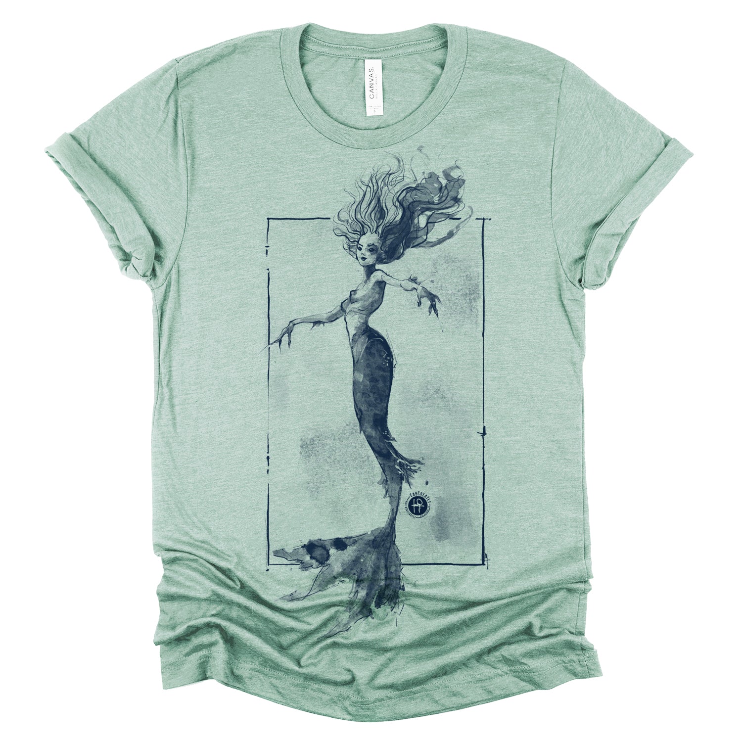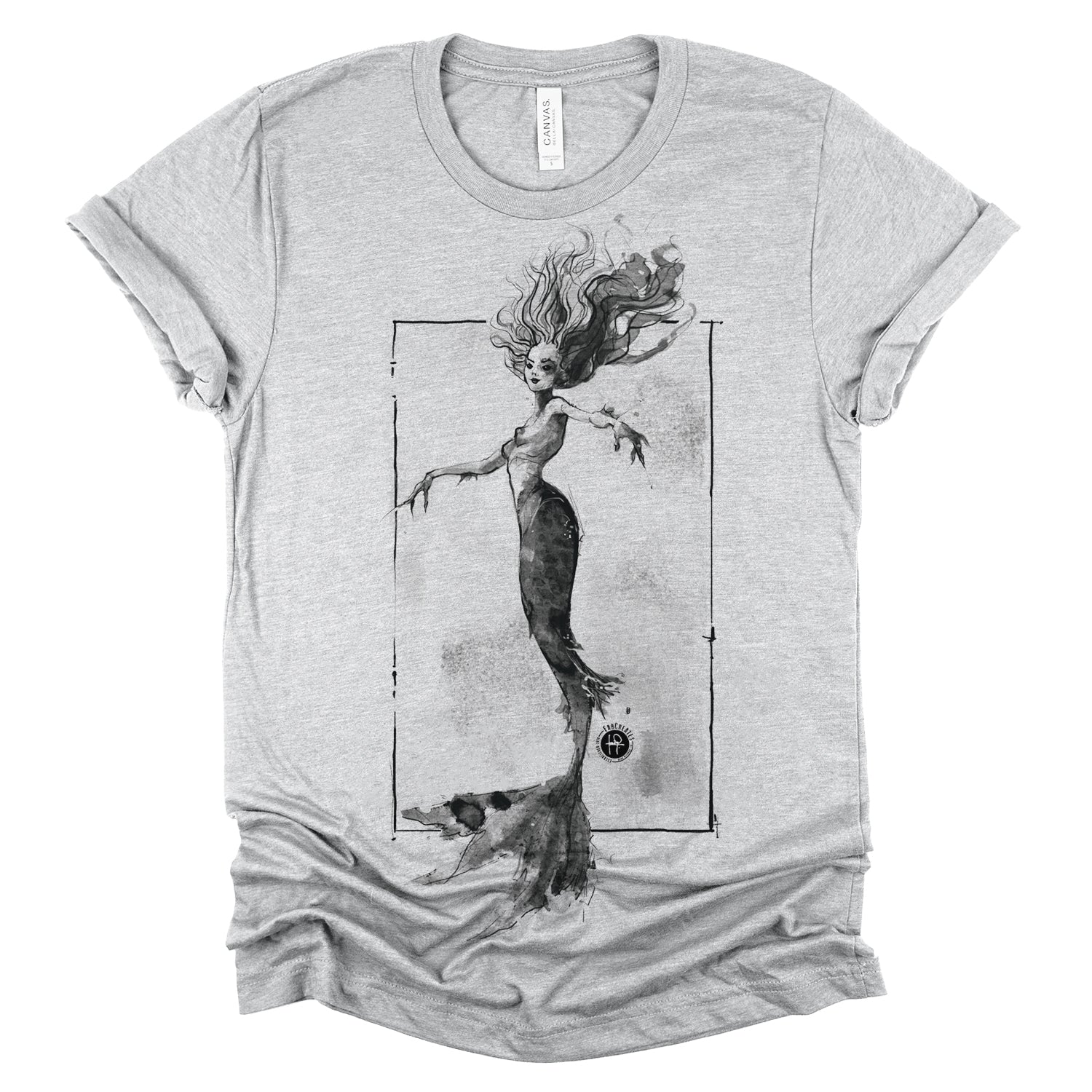 Dive into 'Dancing Mermaid: An Ocean Ballad,' a whimsical design that captures the eerie beauty of the ocean's depths. This piece features a mesmerizing mermaid gracefully gliding through the water. Fab has executed this artwork with very light and unfinished line work, complemented by his signature watered-down textures.