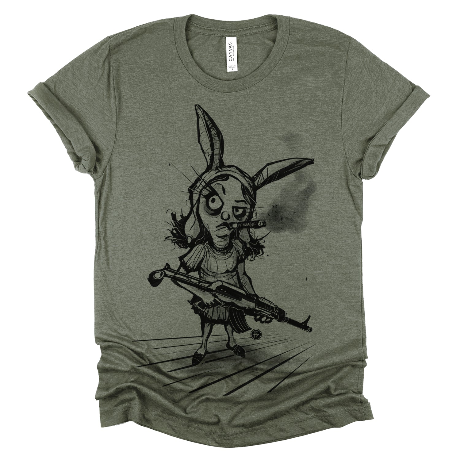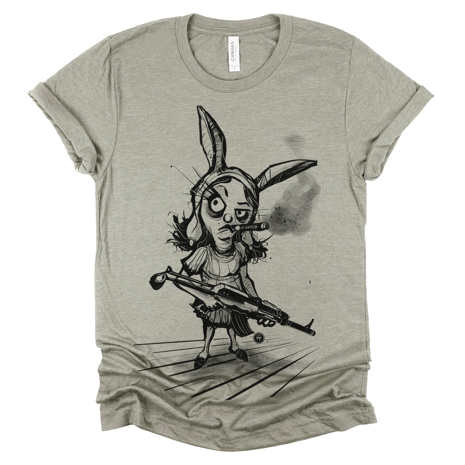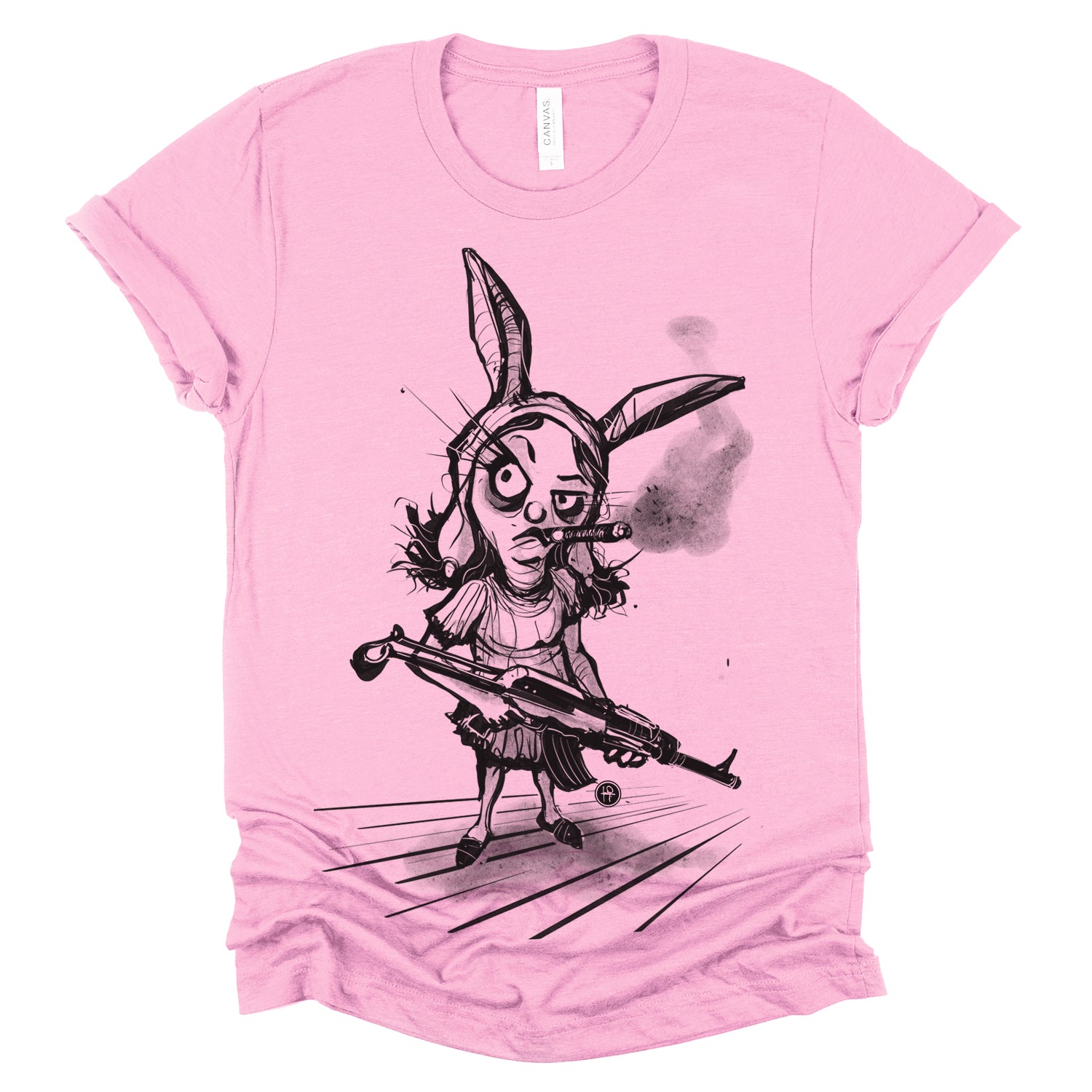 Introducing our 'Don't Mess With Louise: Badass Belcher Alert' T-shirt. Channeling the iconic Louise Belcher in full badass mode, armed with a rifle and cigar, this design embodies her fearless spirit. Fab's signature style shines through with bold line work and expertly crafted halftone patterns, lending a vintage feel and striking contrast to the artwork. Perfect for fans of quirky humor and unique artistry.