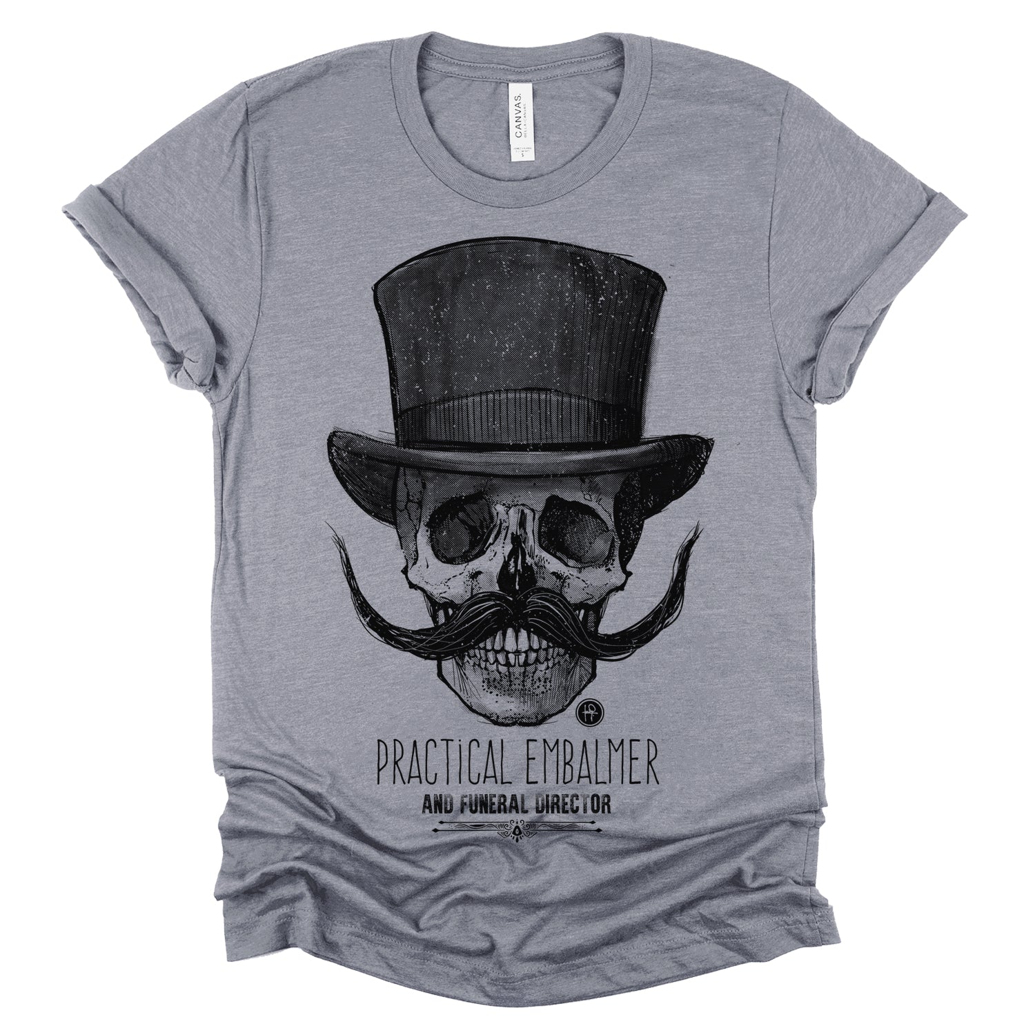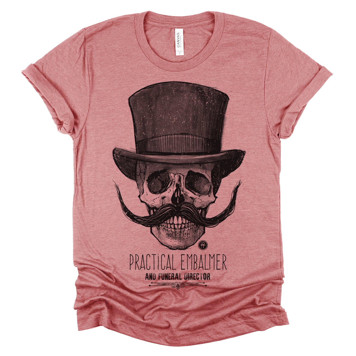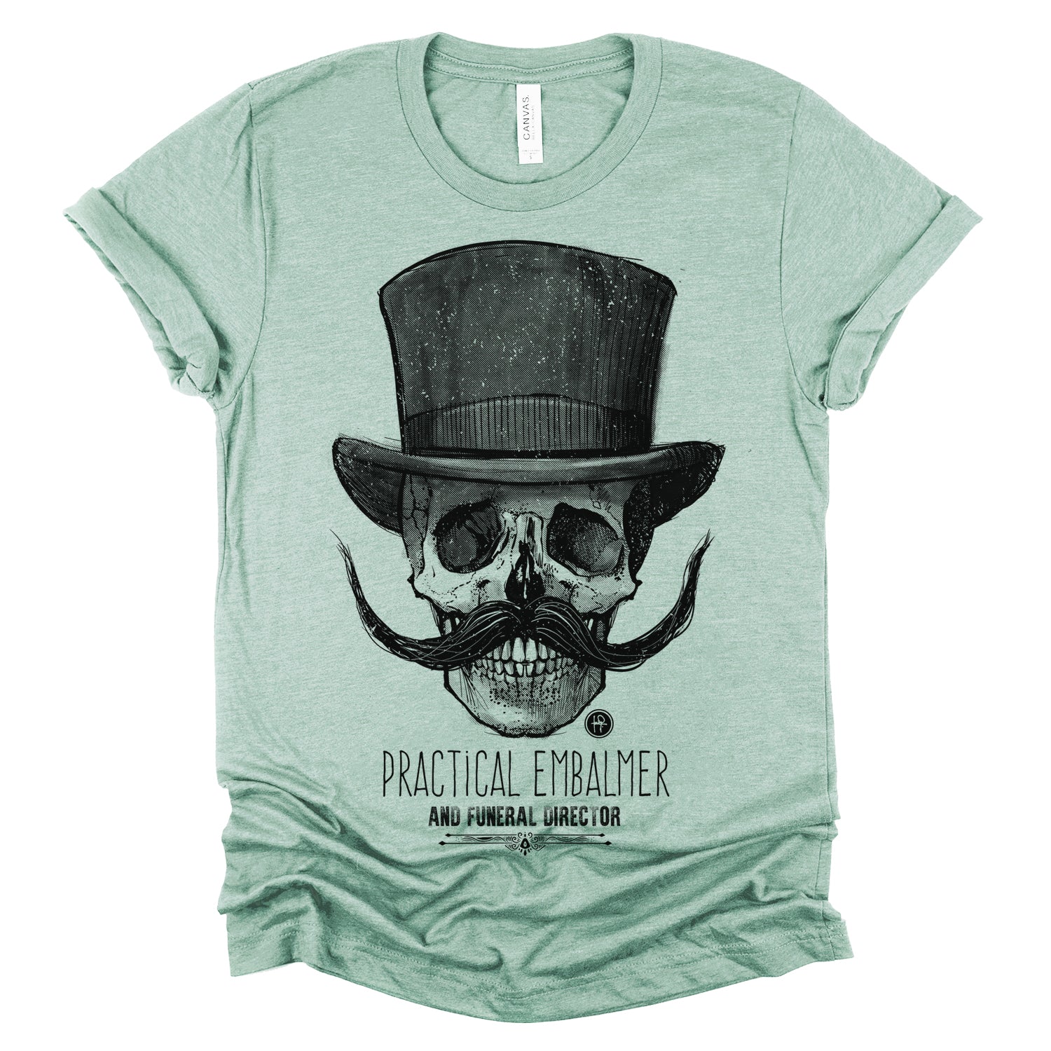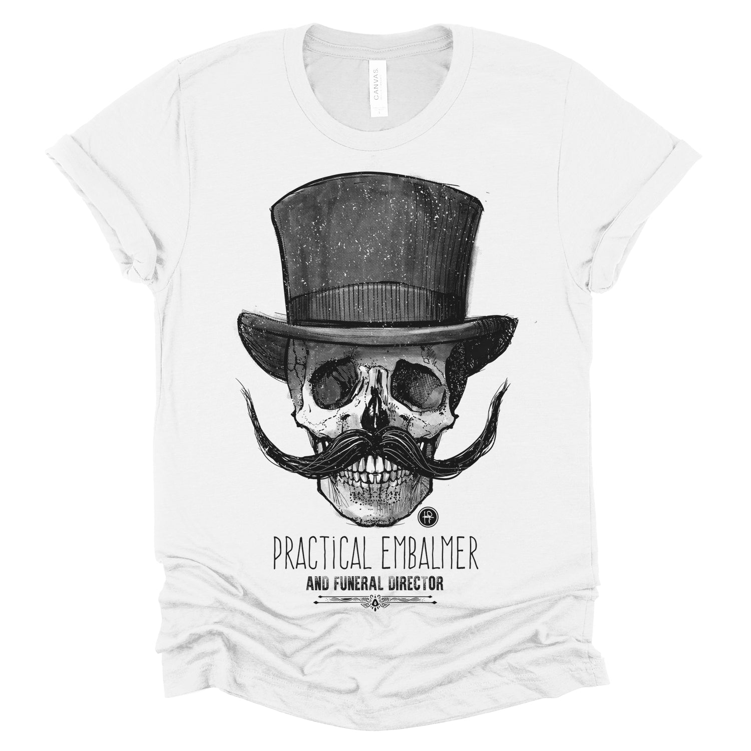 Step into the world of vintage funeral elegance with our "Embalmer: Vintage Undertaking Elegance" design. Featuring a skull donning a mustache and top hat, this piece pays homage to the timeless art of embalming. A classic FabCreates design, it showcases intricate ink work and gritty, soft halftone lines that create a hauntingly beautiful shading effect.