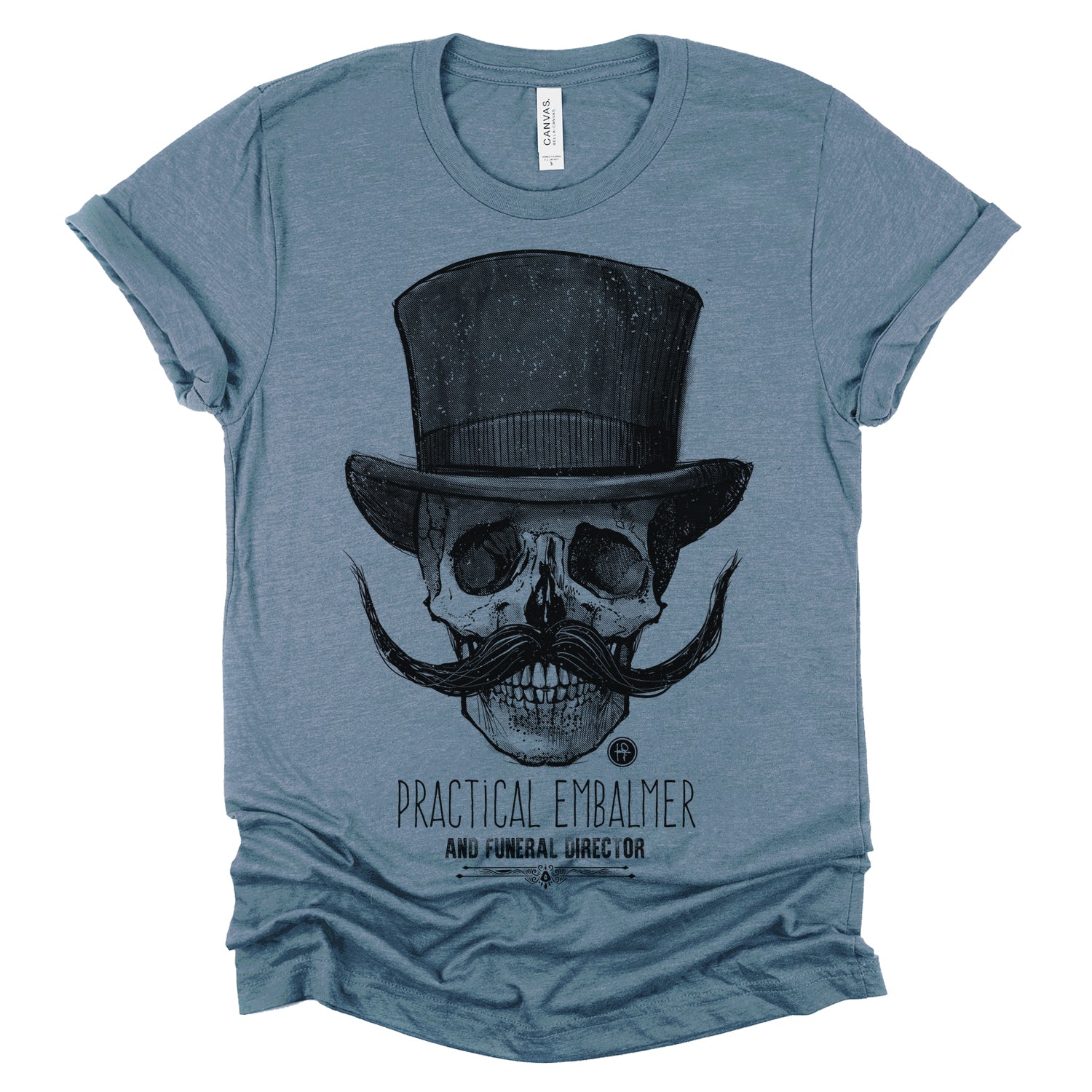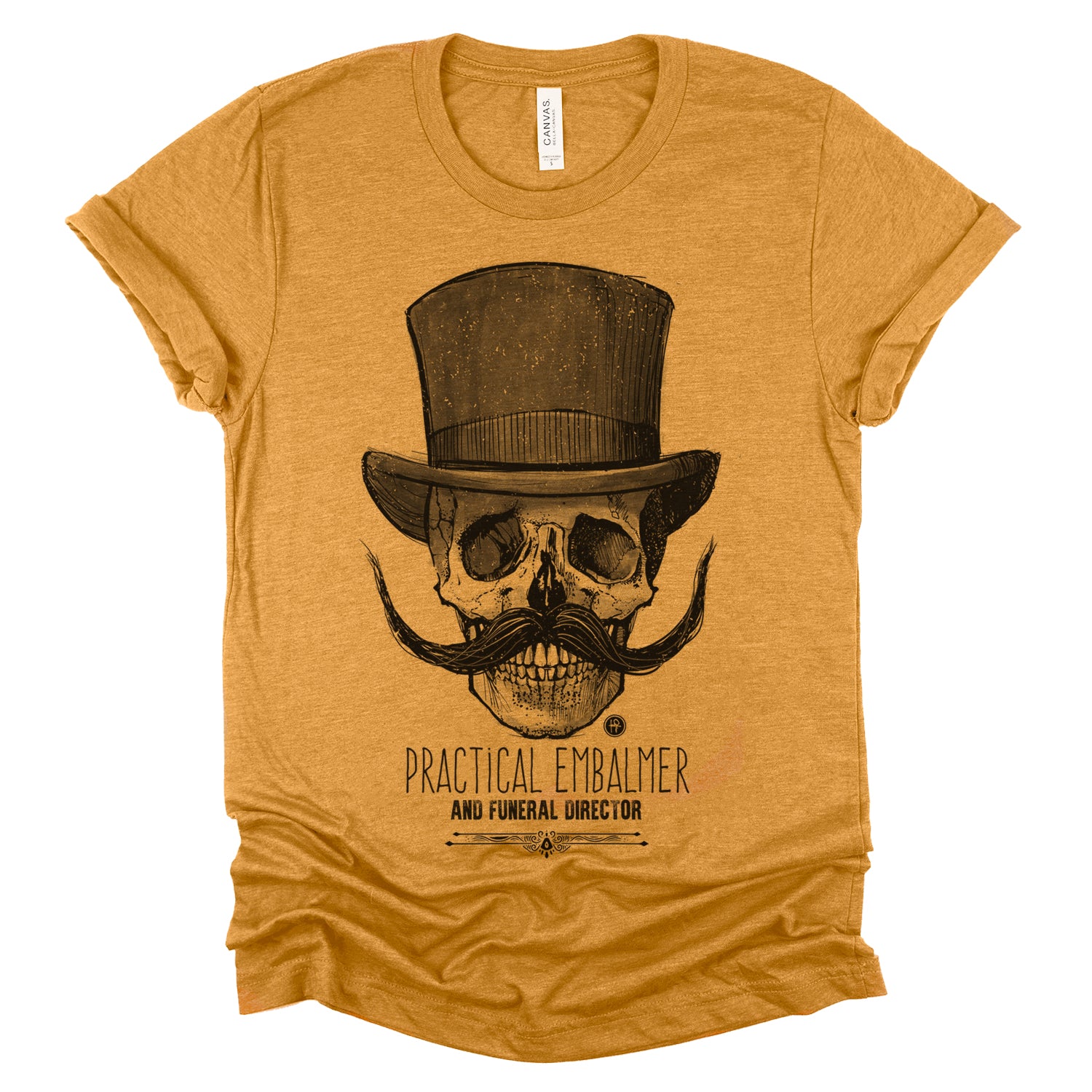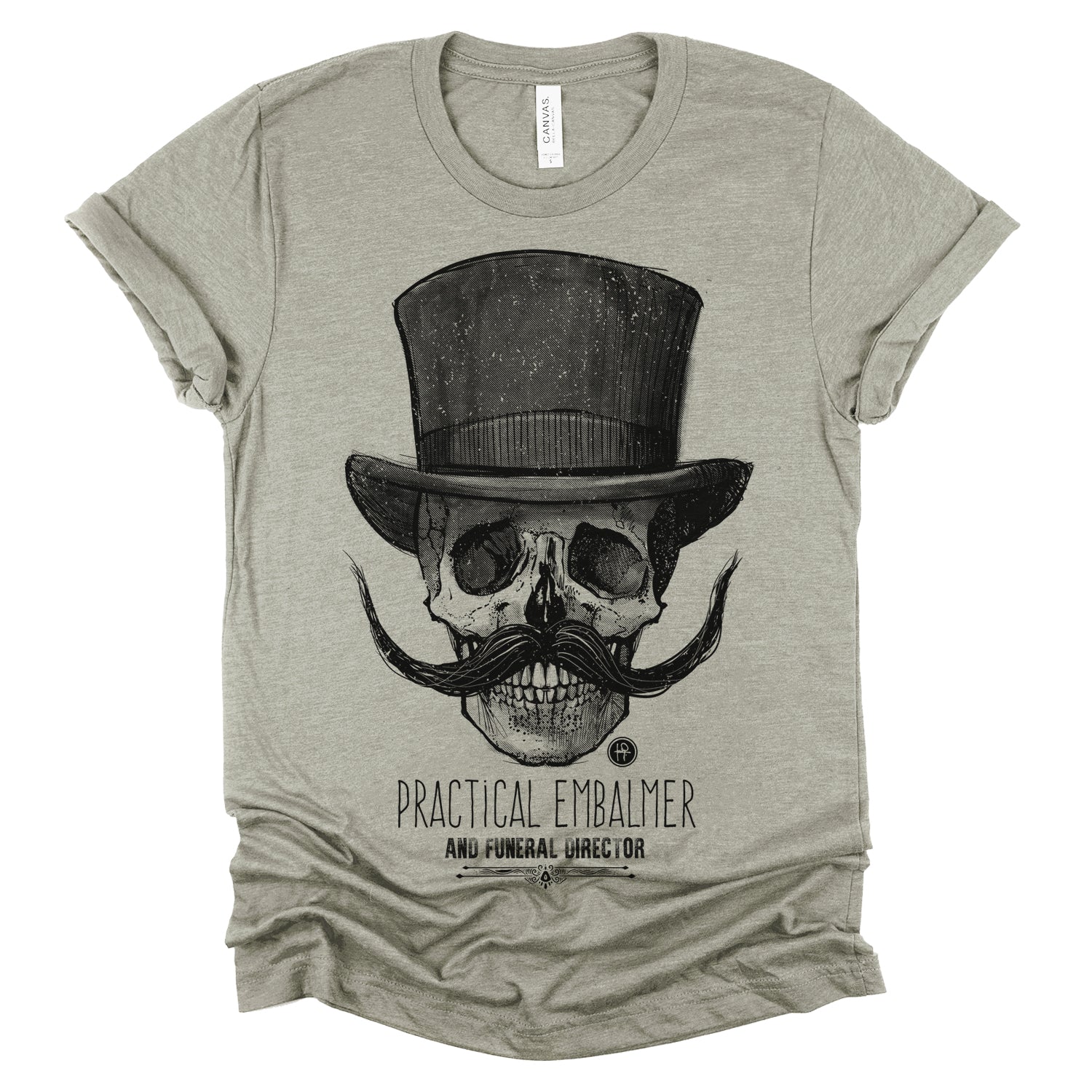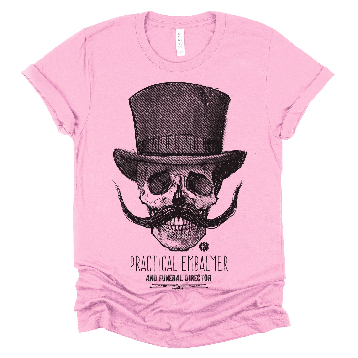 Step into the world of vintage funeral elegance with our "Embalmer: Vintage Undertaking Elegance" design. Featuring a skull donning a mustache and top hat, this piece pays homage to the timeless art of embalming. A classic FabCreates design, it showcases intricate ink work and gritty, soft halftone lines that create a hauntingly beautiful shading effect.