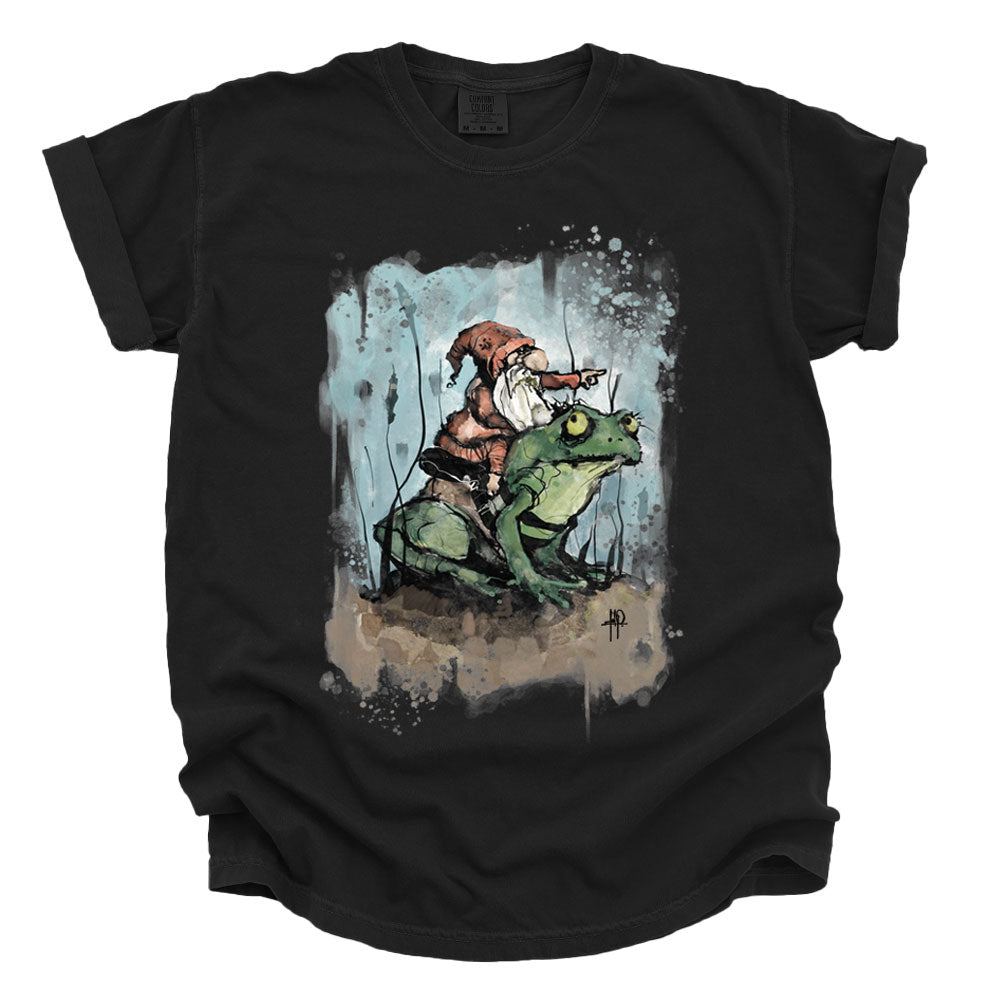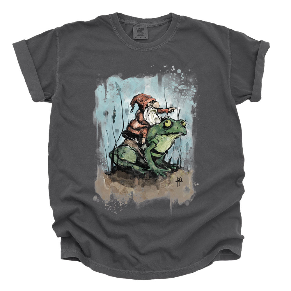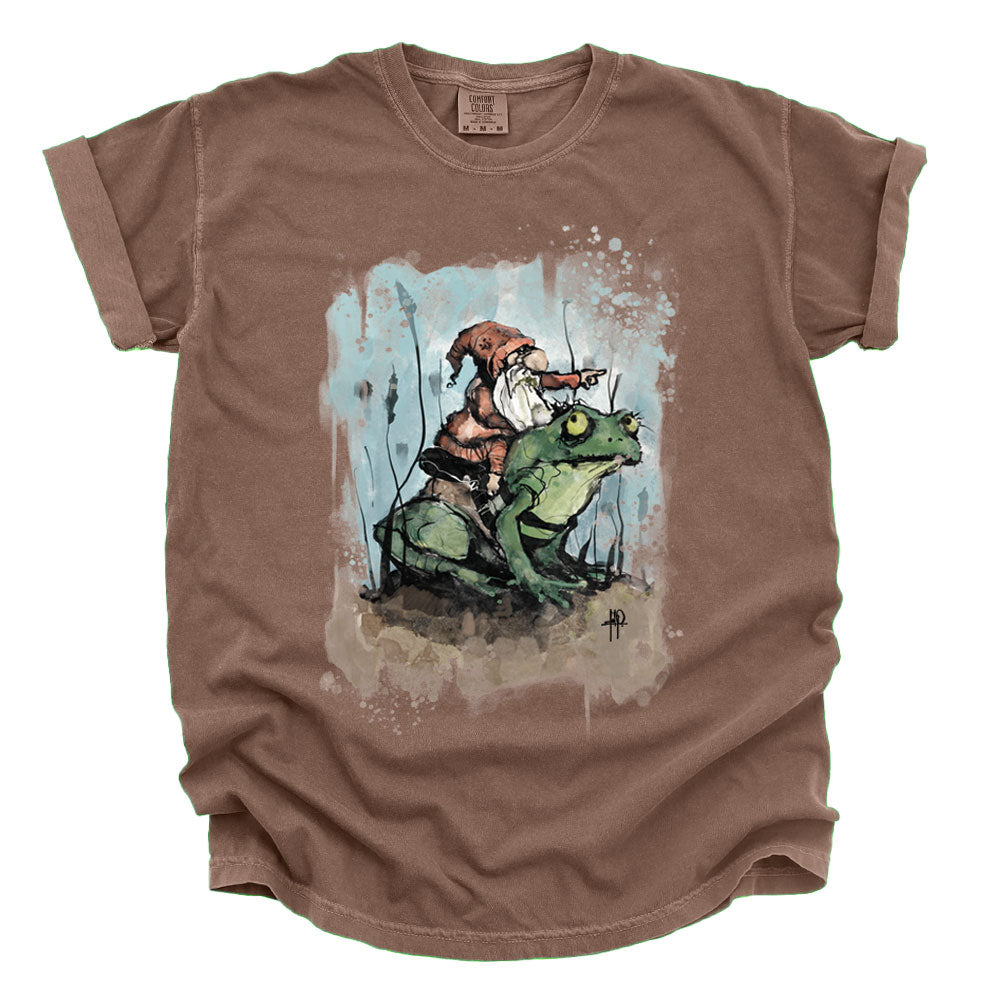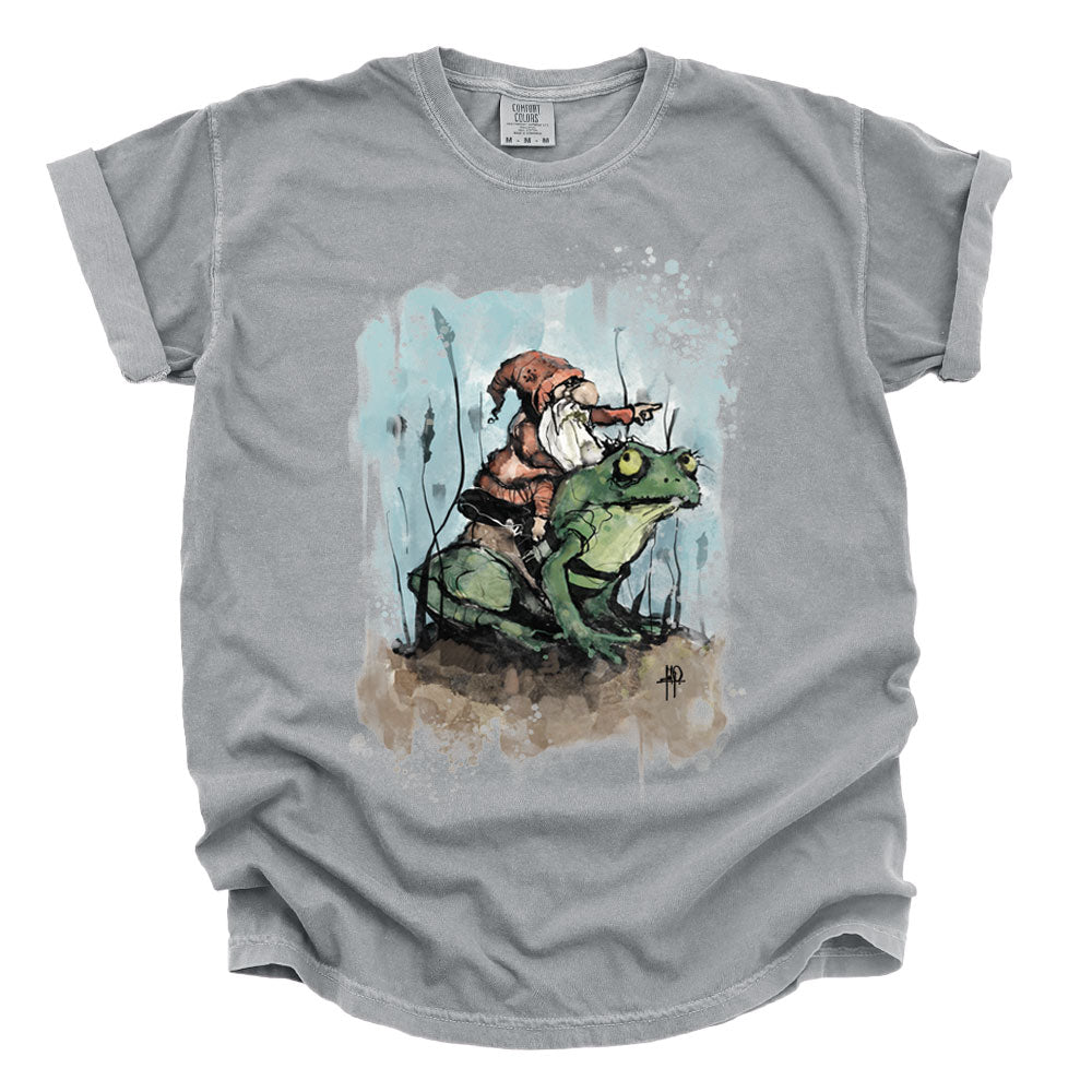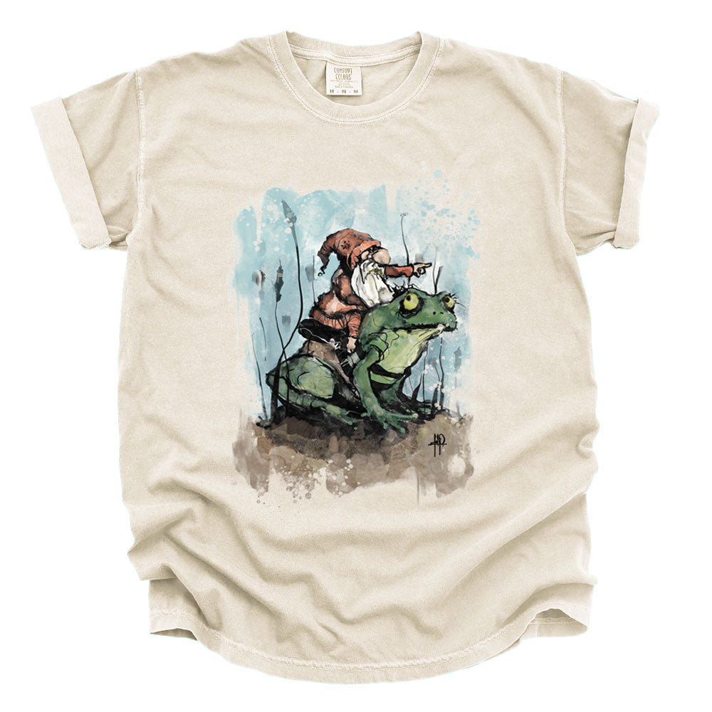 Prepare for a whimsical adventure with The Grand Gnome Expedition, the first FabCreates design to burst into full color with high-definition digital print transfer—calibrated in-house and printed by a local shop for maximum depth, grit, and vibrancy. A fearless gnome perches atop his amphibian steed, guiding his froggy companion through murky waters and moonlit mysteries. Fab’s signature textured lines and imperfect halftones bring every ripple and wrinkle to life, blending storybook charm with a raw, hand-drawn edge. A tale of wonder, wanderlust, and warty companionship—printed to perfection.
