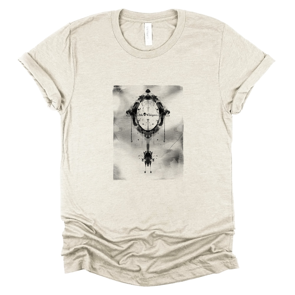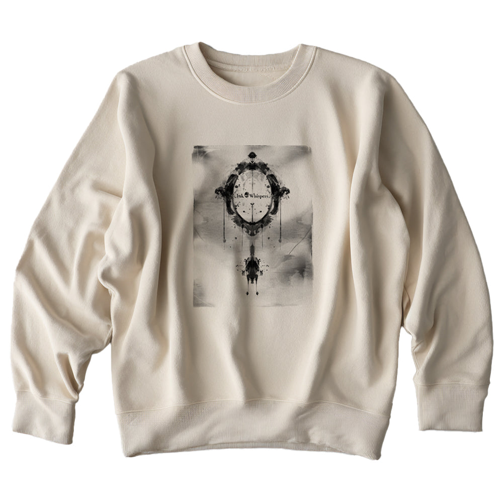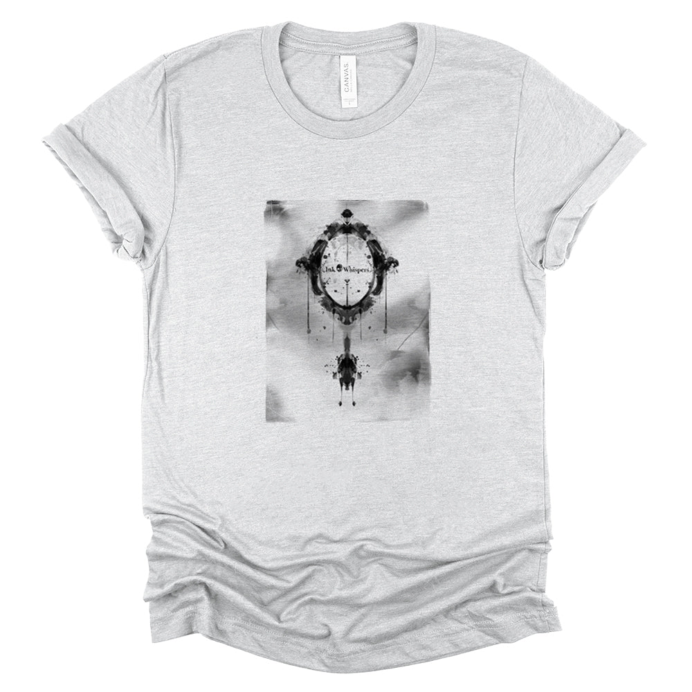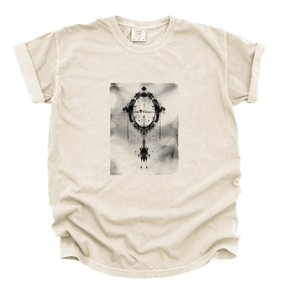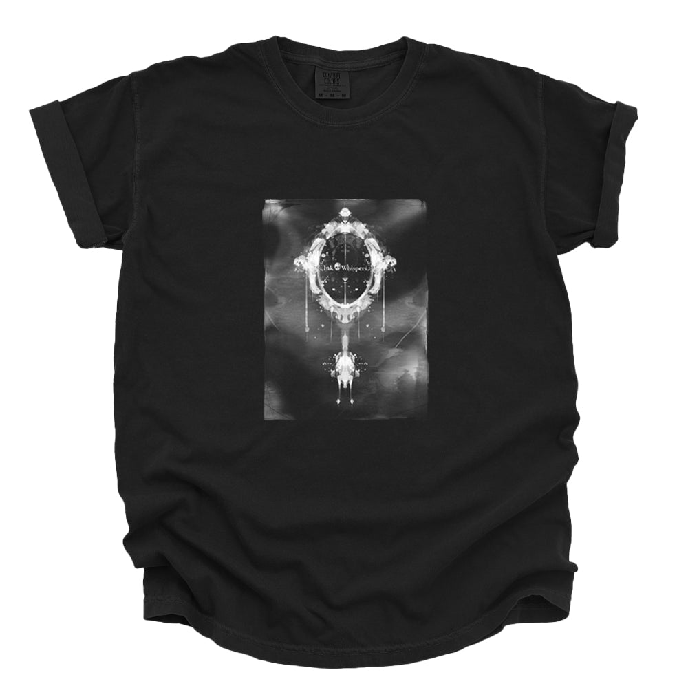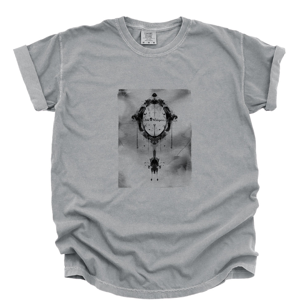 Ink Whispers Mirror — Reflects more than light with a single inkblot revelation — a mirror suspended in contemplation, revealing and concealing. Its silhouette is deceptively simple, yet loaded with introspection: truth or illusion, clarity or distortion. The design feels pulled from a moment of recognition or a reflection too honest to ignore, its edges bleeding into the fabric like something whispered in revelation.