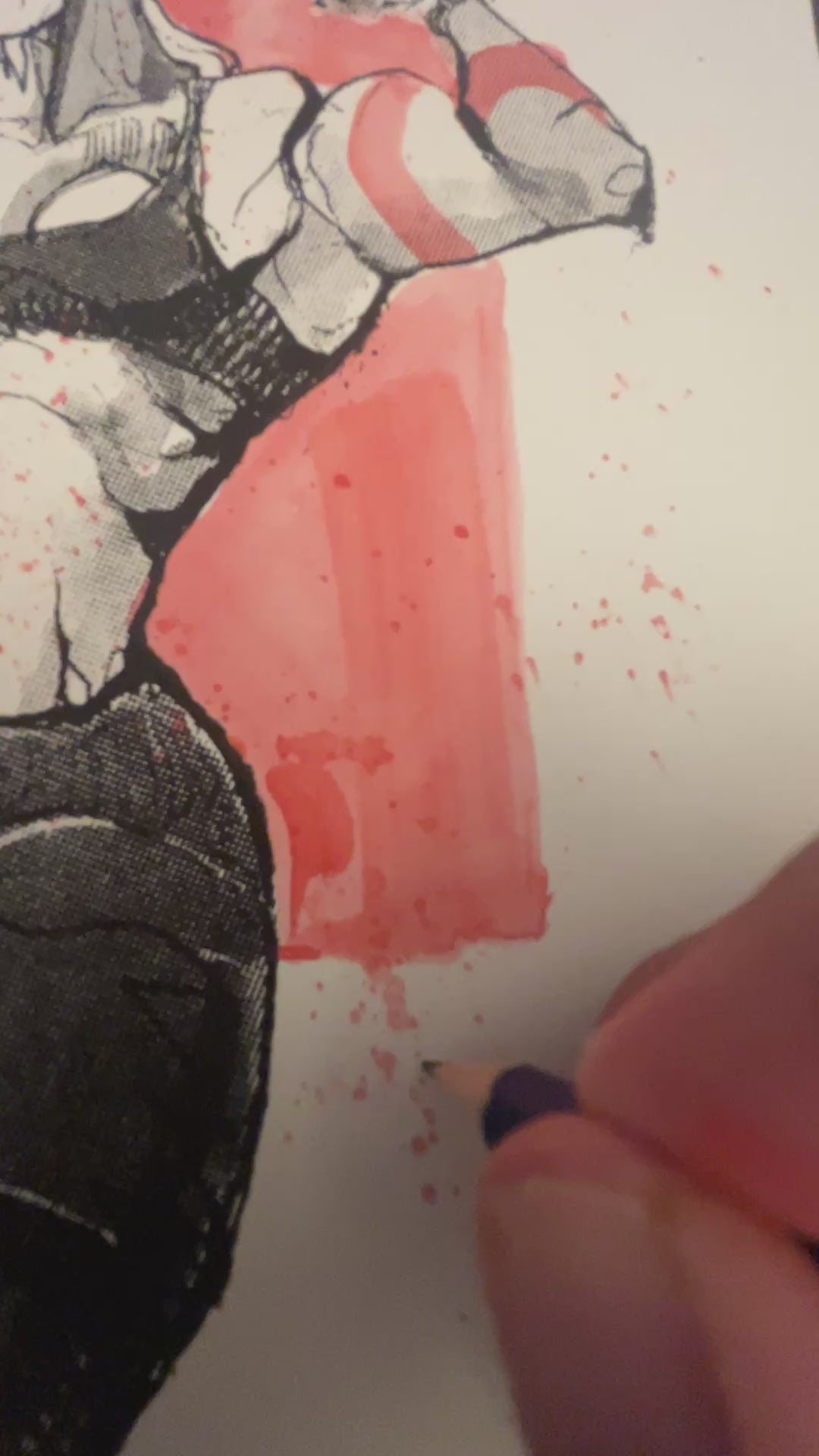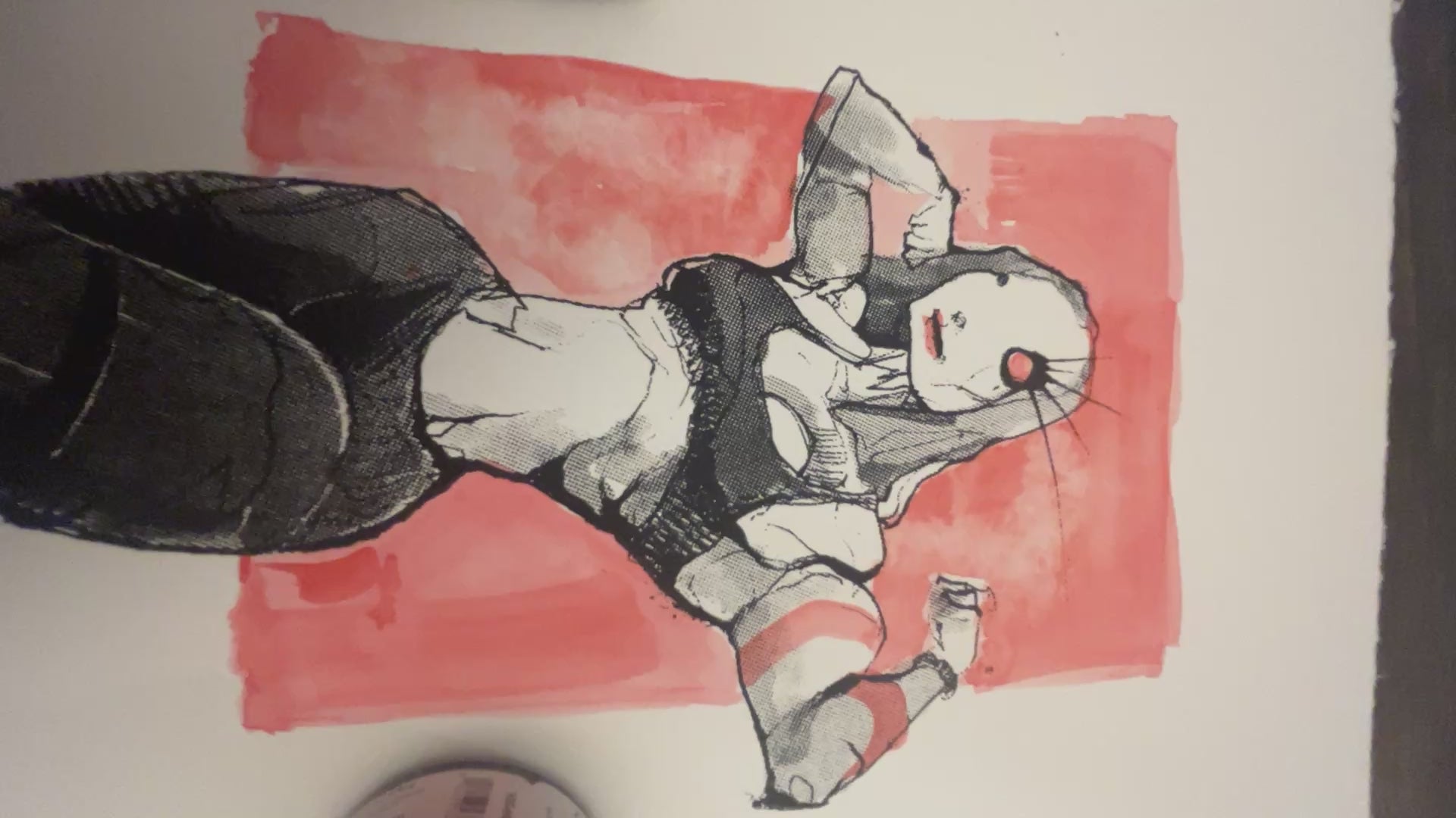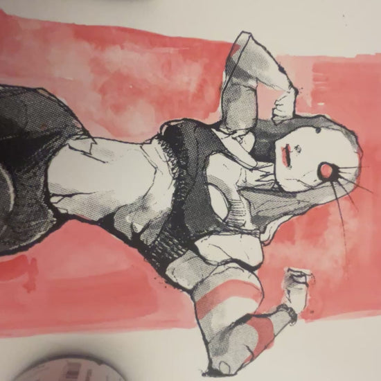 Fab screen prints her in rich black halftones, then finishes each piece with a hand-painted red wash — layered, imperfect, alive. No two are identical. The splatter, the bleed, the weight of the ink — each one shifts slightly, like she does.