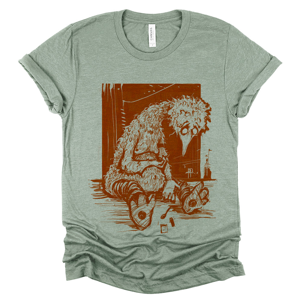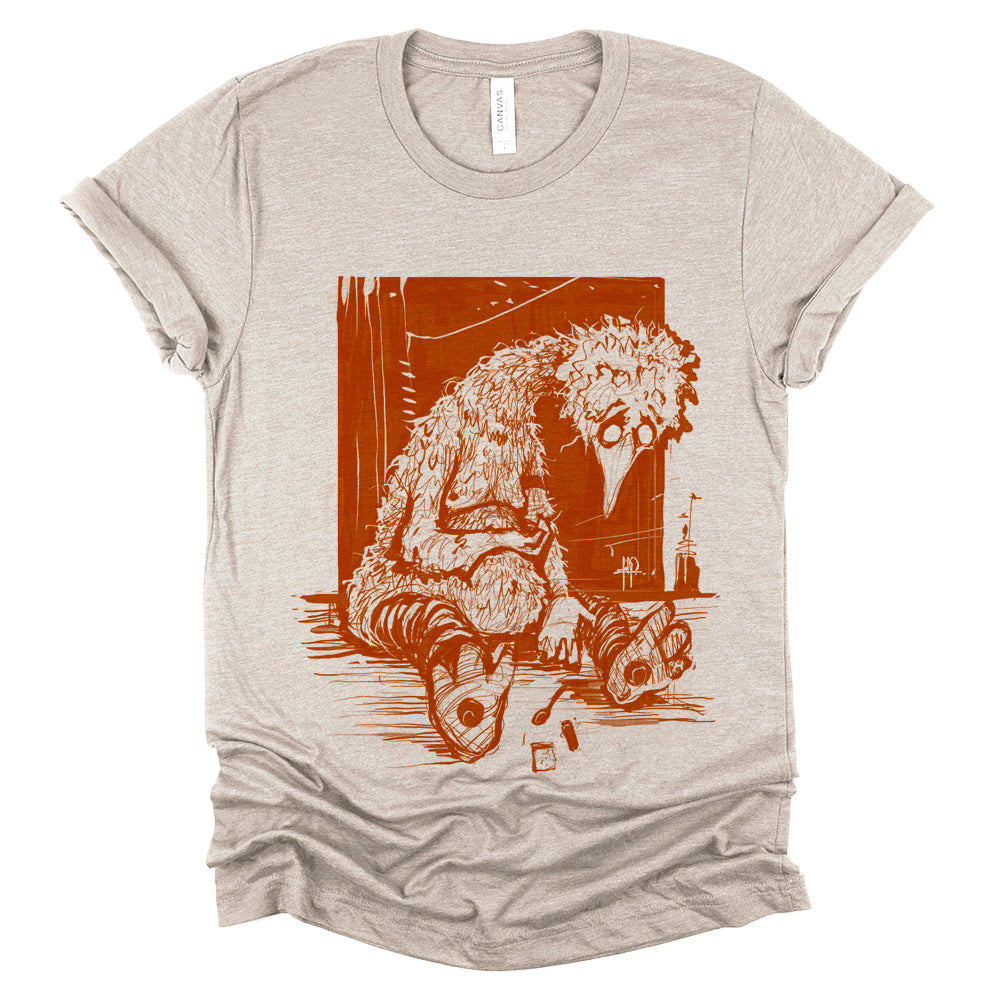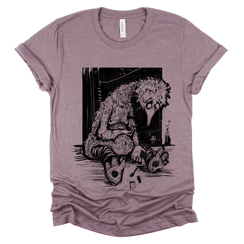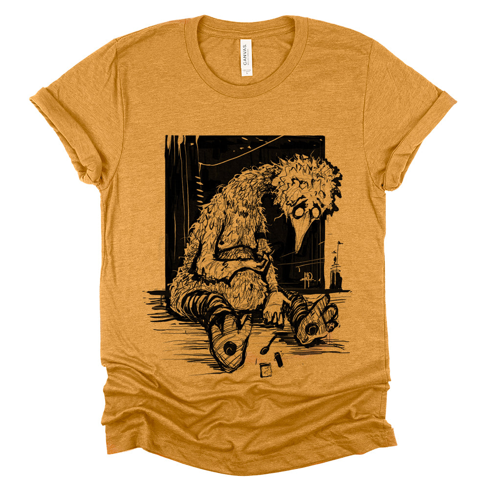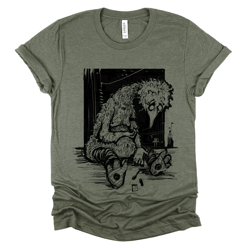 n this dark and twisted reimagining, the once-lovable childhood icon has fallen from grace. Slumped in a grimy alley corner, Junkie Big Bird is a haunting symbol of innocence lost, caught in the grip of addiction. His feathers are tattered, his eyes hollow, and the needle in his arm tells a story of a world far removed from sunny days. This design is raw, unapologetic, and thought-provoking—turning nostalgia on its head with a gritty dose of reality.