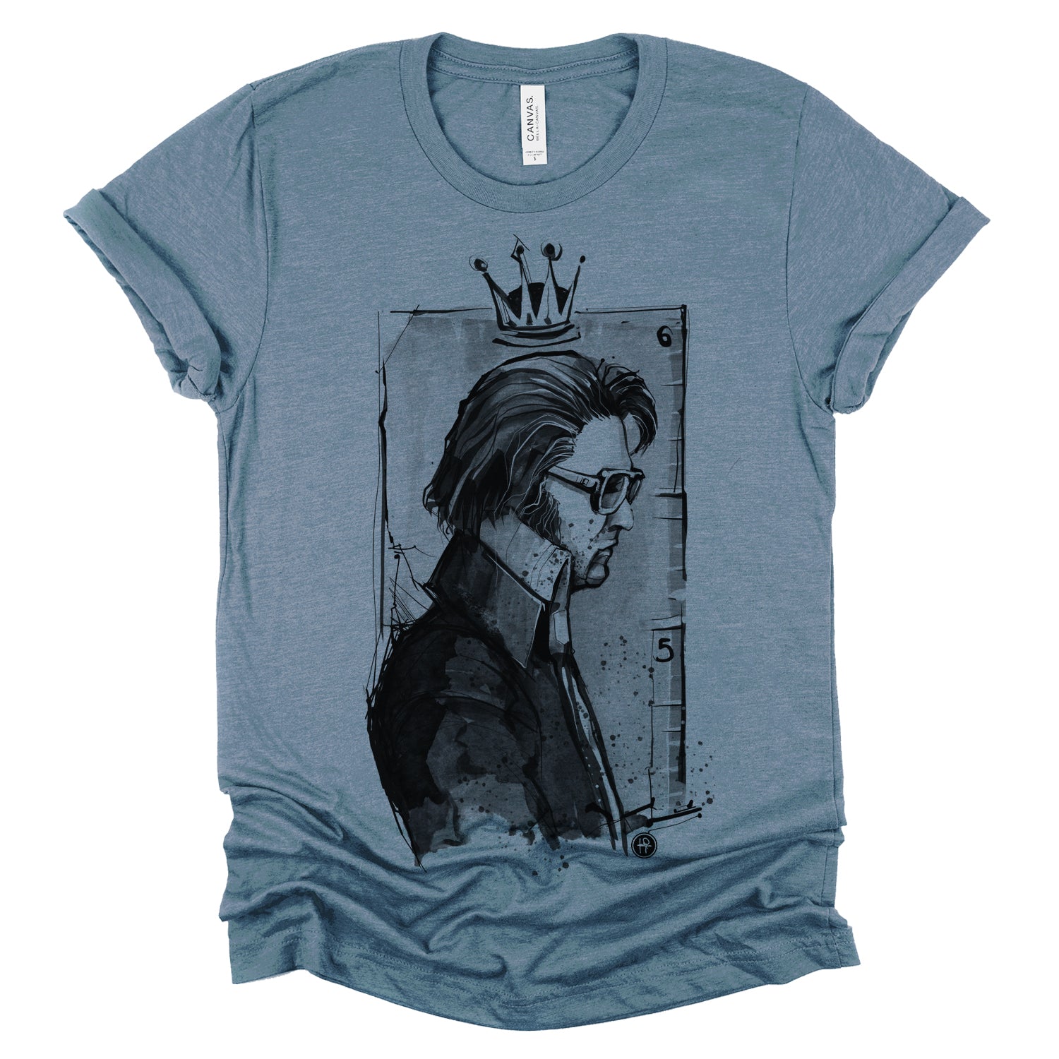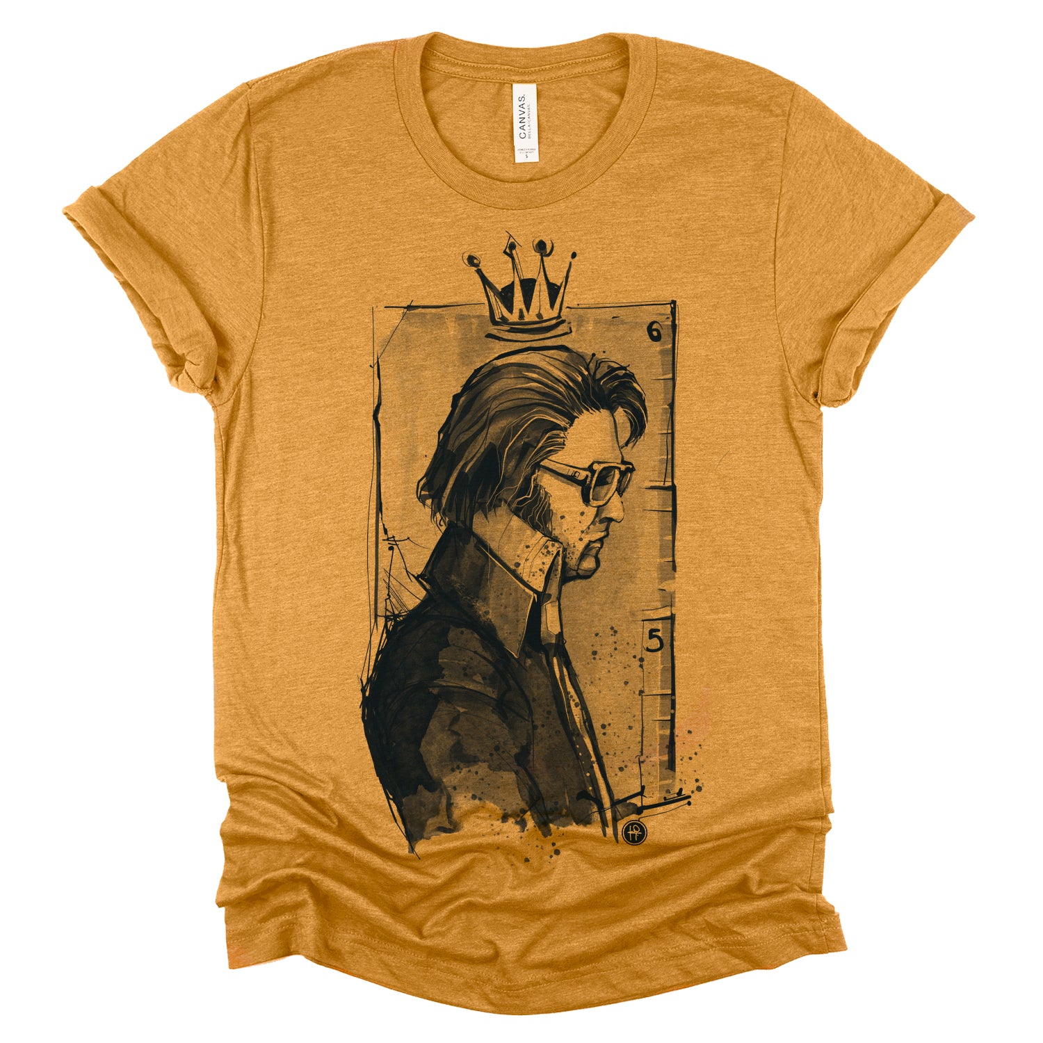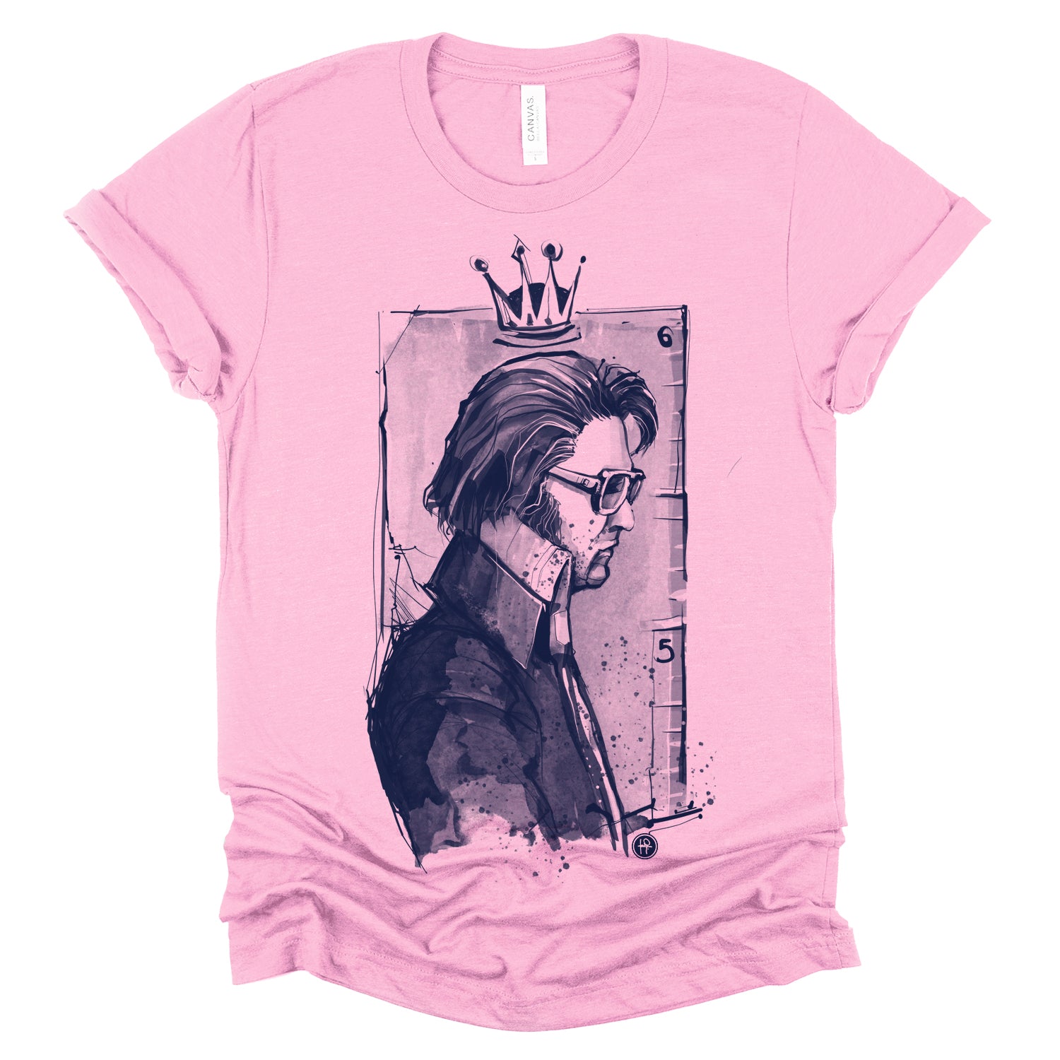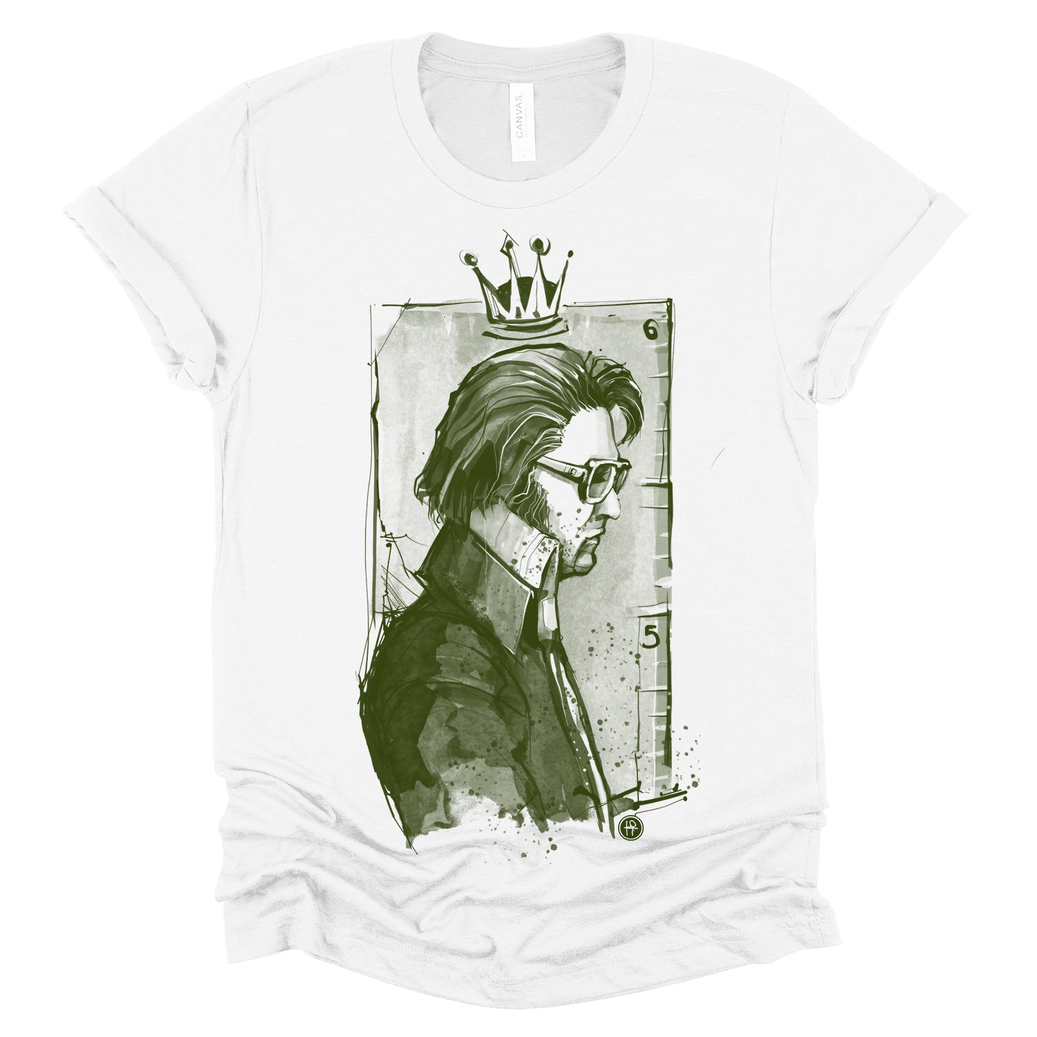 Step into the gritty underworld of Vegas with our "King Mugshot: Vegas Reign" design, featuring the infamous Elvis Presley. This iconic composition showcases the legendary mugshot of the King himself, captured in Fab's chaotic, messy style that adds depth to his legend.