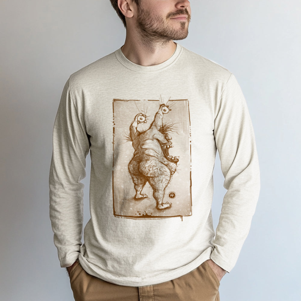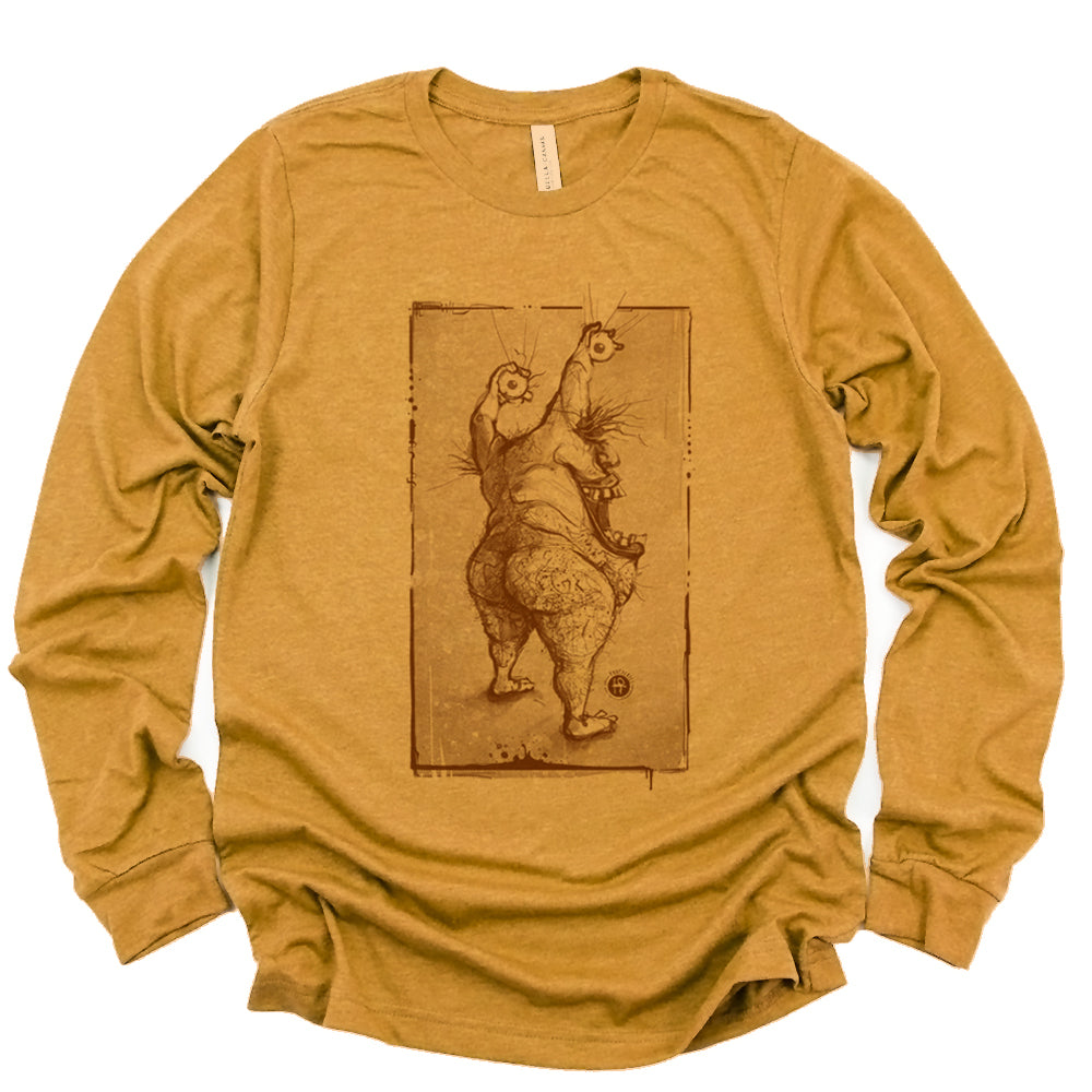 Hand-screened on premium Unisex Heather Tees (52% Cotton/ 48% Poly) with water-based inks, it embodies FabCreates' humor and gritty bold style, blending playfulness with sophistication. Available in XS, 3XL, and 4XL sizes, in a range of limited colors.