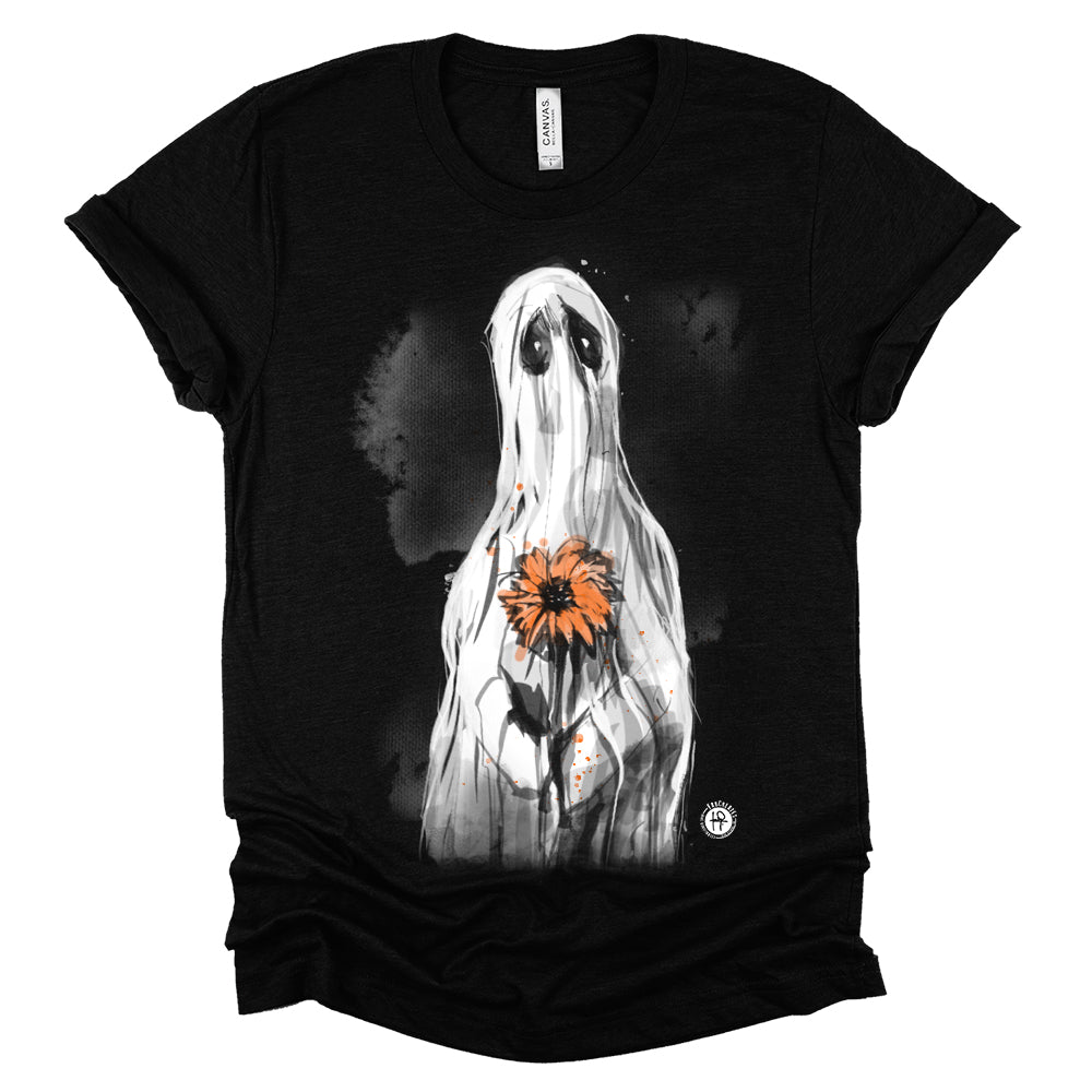 Experience the poignant beauty of solitude with our "Lonely Ghost: A Gentle Reminder" print. This design portrays a solitary ghost holding a delicate flower, evoking a sense of melancholic nostalgia. After printing, each shirt receives a hand-brushed orange wash, adding a subtle warmth to the flower.