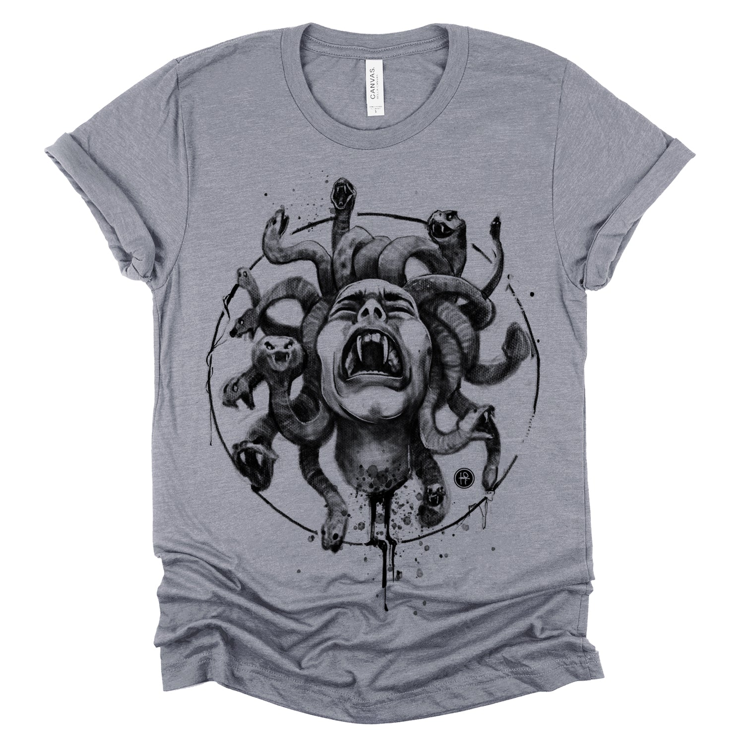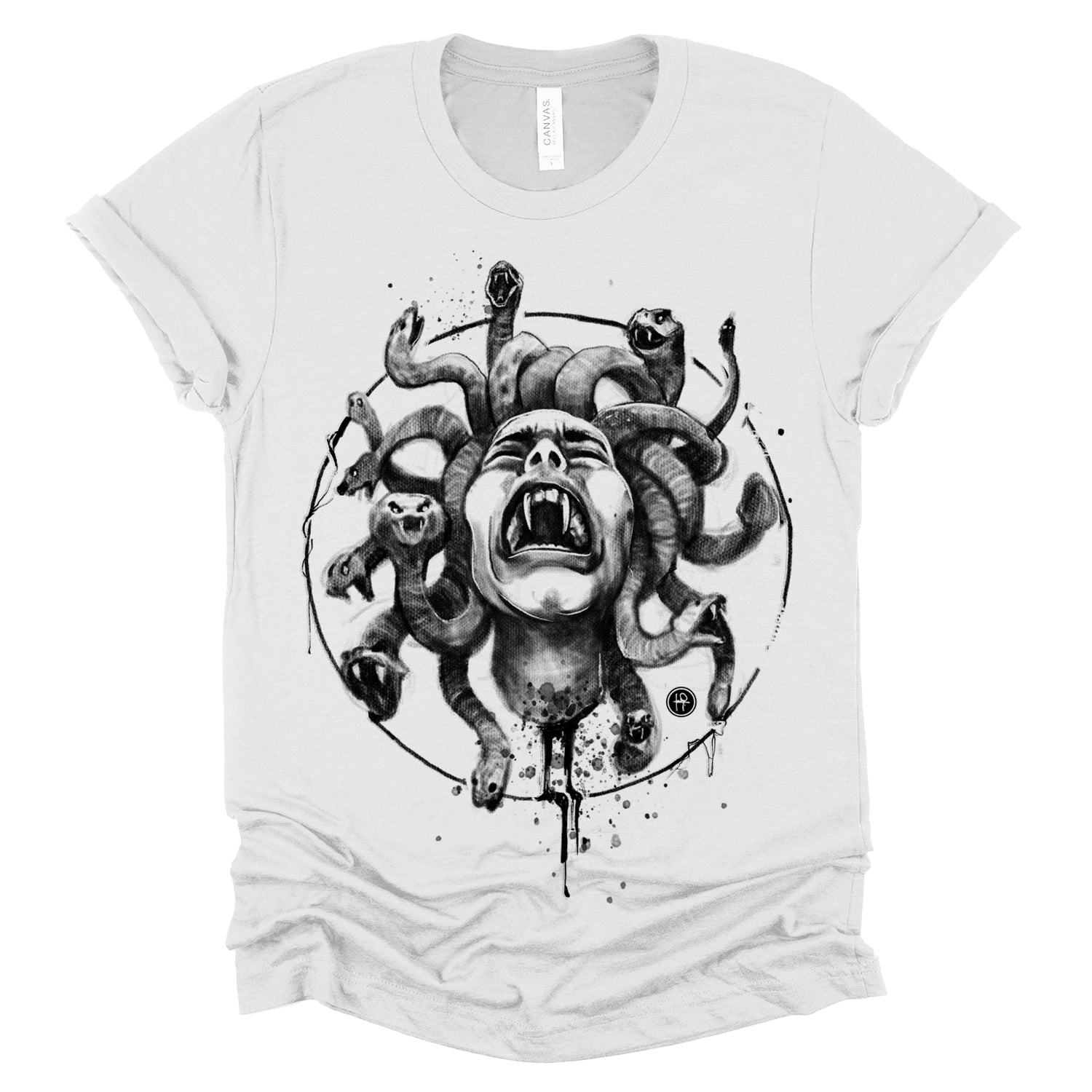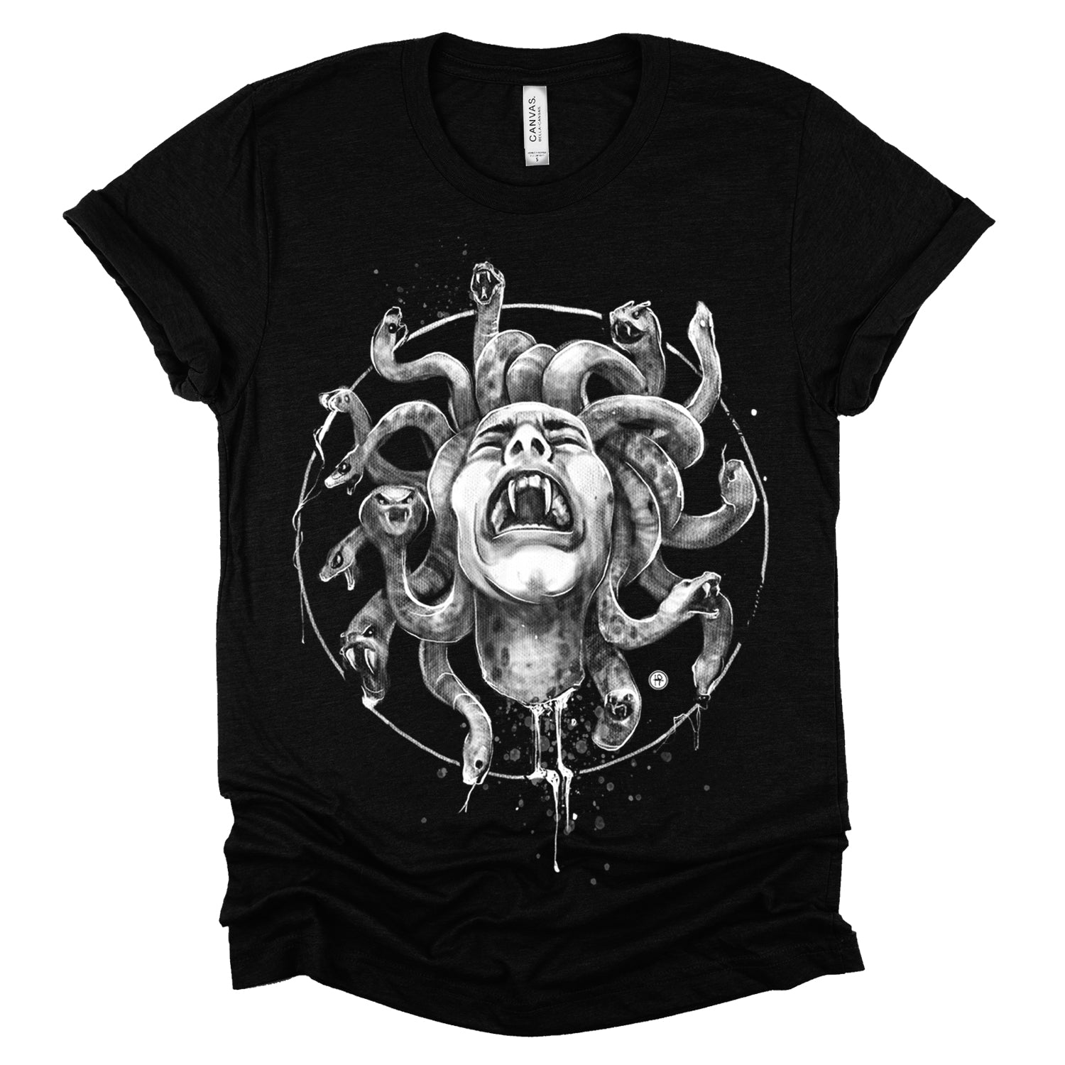 Our "Medusa's Pain: Scream Captured" print showcases the agony of the Gorgon in a chilling design. With blood dripping and her piercing scream frozen in time, this piece is a testament to the horror of Medusa's curse. Rendered in a soft pencil-charcoal style with splashes of splatters for dramatic effect, Fab focused on capturing her pain and agony, ensuring the technique never overshadowed the raw emotion.