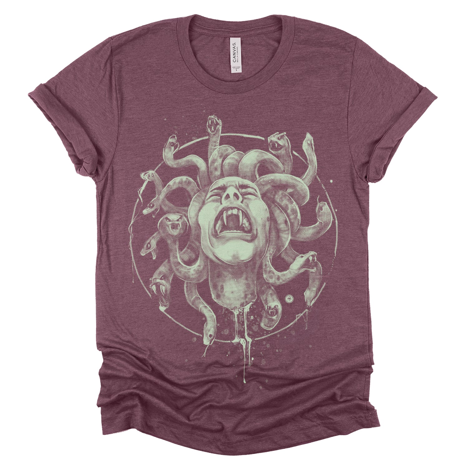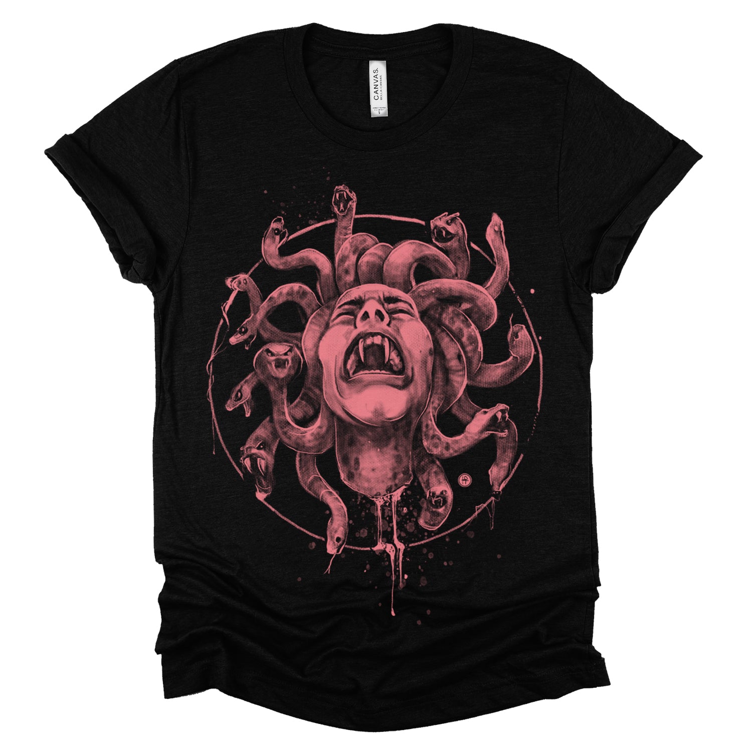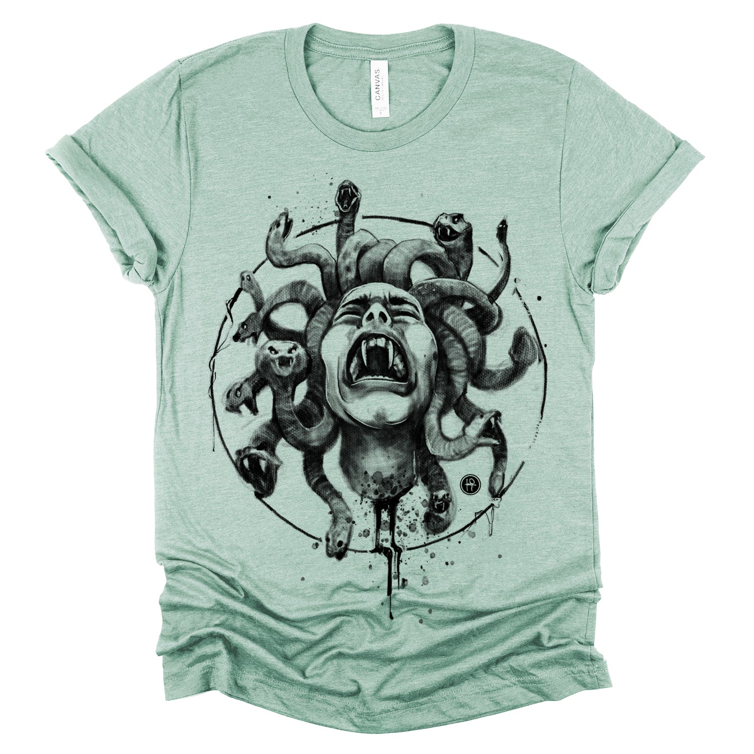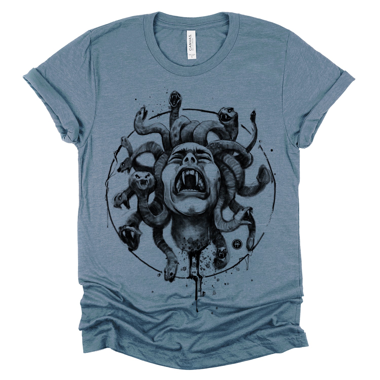 Our "Medusa's Pain: Scream Captured" print showcases the agony of the Gorgon in a chilling design. With blood dripping and her piercing scream frozen in time, this piece is a testament to the horror of Medusa's curse. Rendered in a soft pencil-charcoal style with splashes of splatters for dramatic effect, Fab focused on capturing her pain and agony, ensuring the technique never overshadowed the raw emotion.