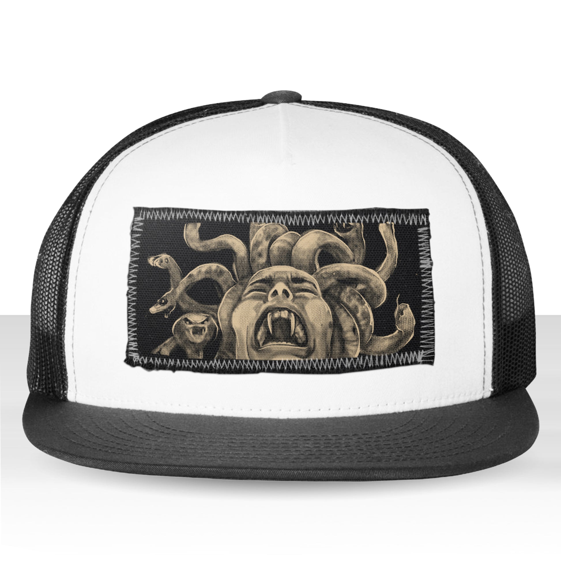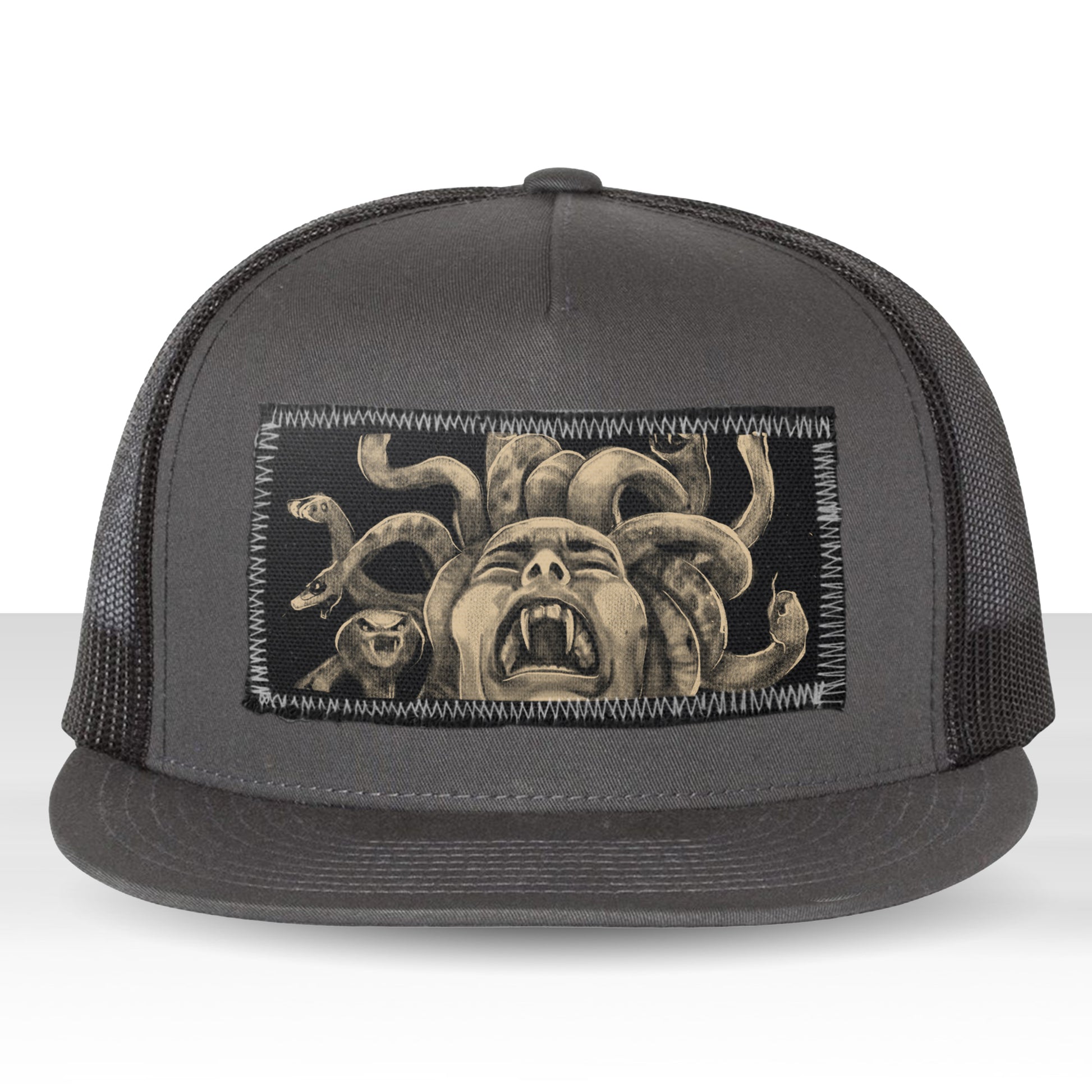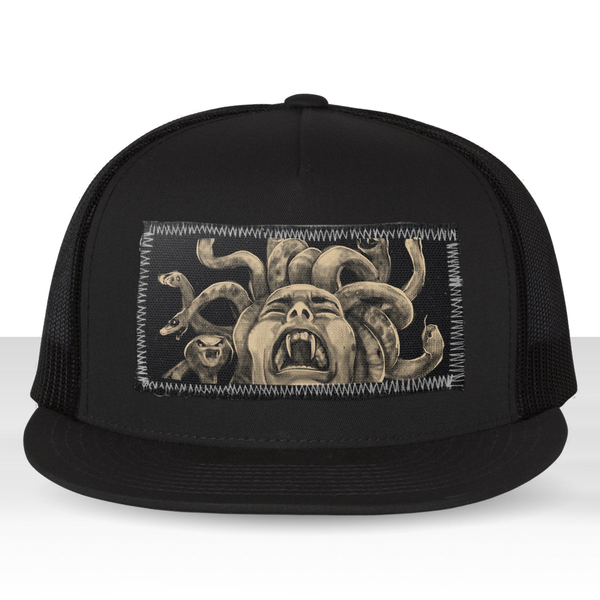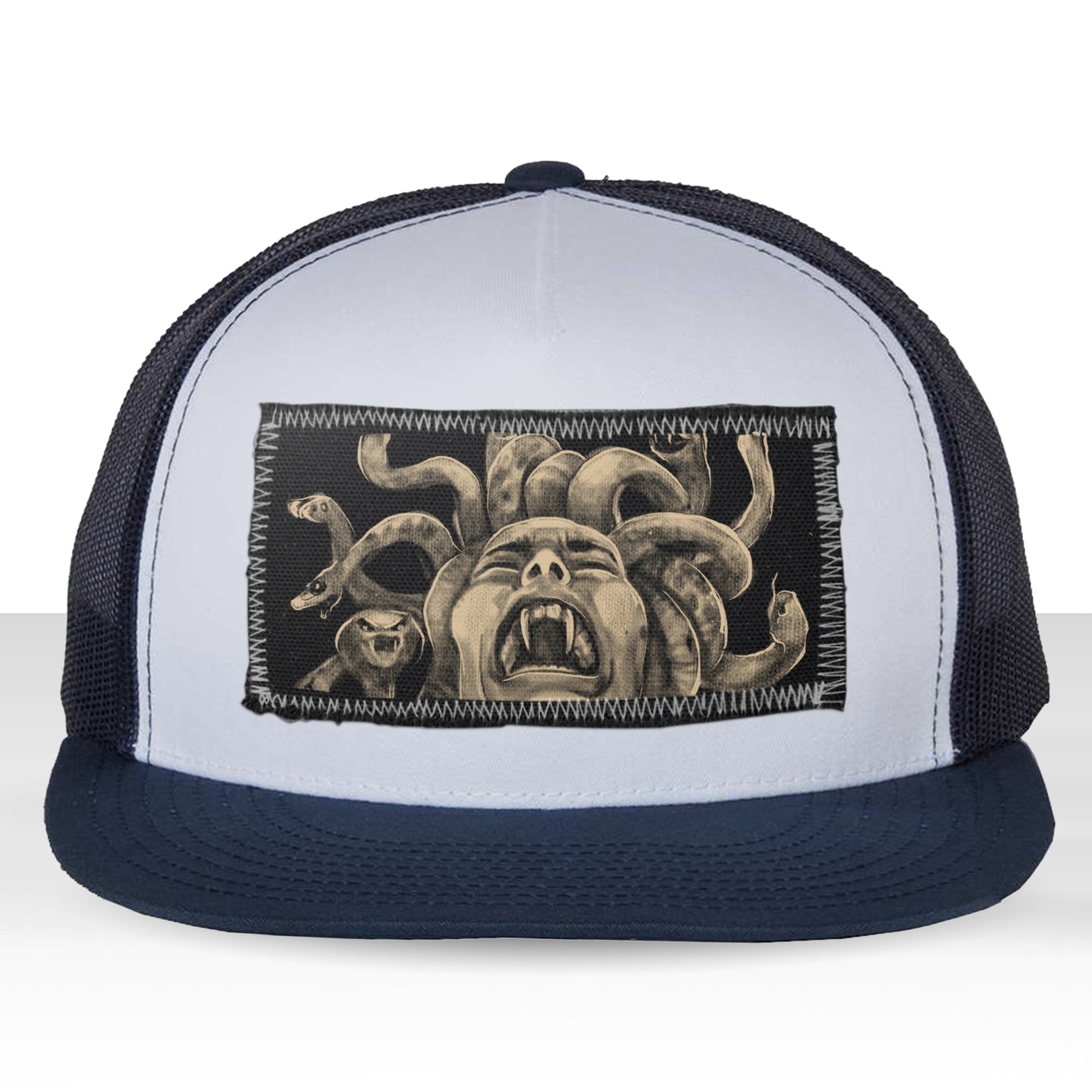 We meticulously hand-cut and stitch each patch before screen printing with water-based inks. For our hats, we use YP Classics - Five-Panel Classic Trucker for flat bills with a high profile, and YP Classics - Six-Panel Trucker Cap for curved bills with a mid profile. Both styles feature a 65/35 polyester/cotton blend, a mesh back, and a snapback closure. These trucker hats showcase FabCreates' signature gritty, imperfect style.