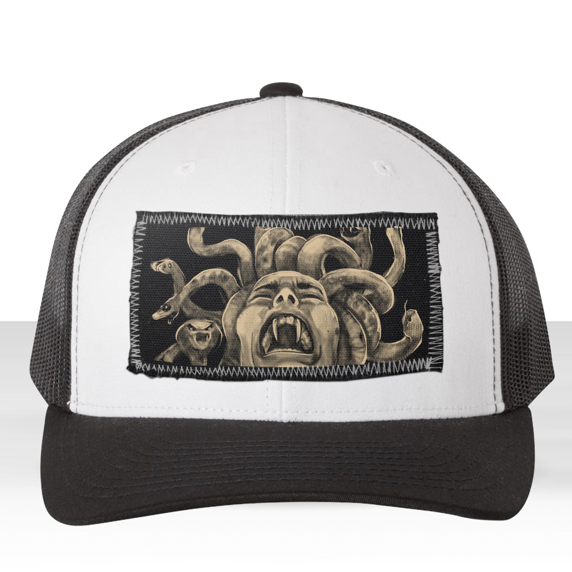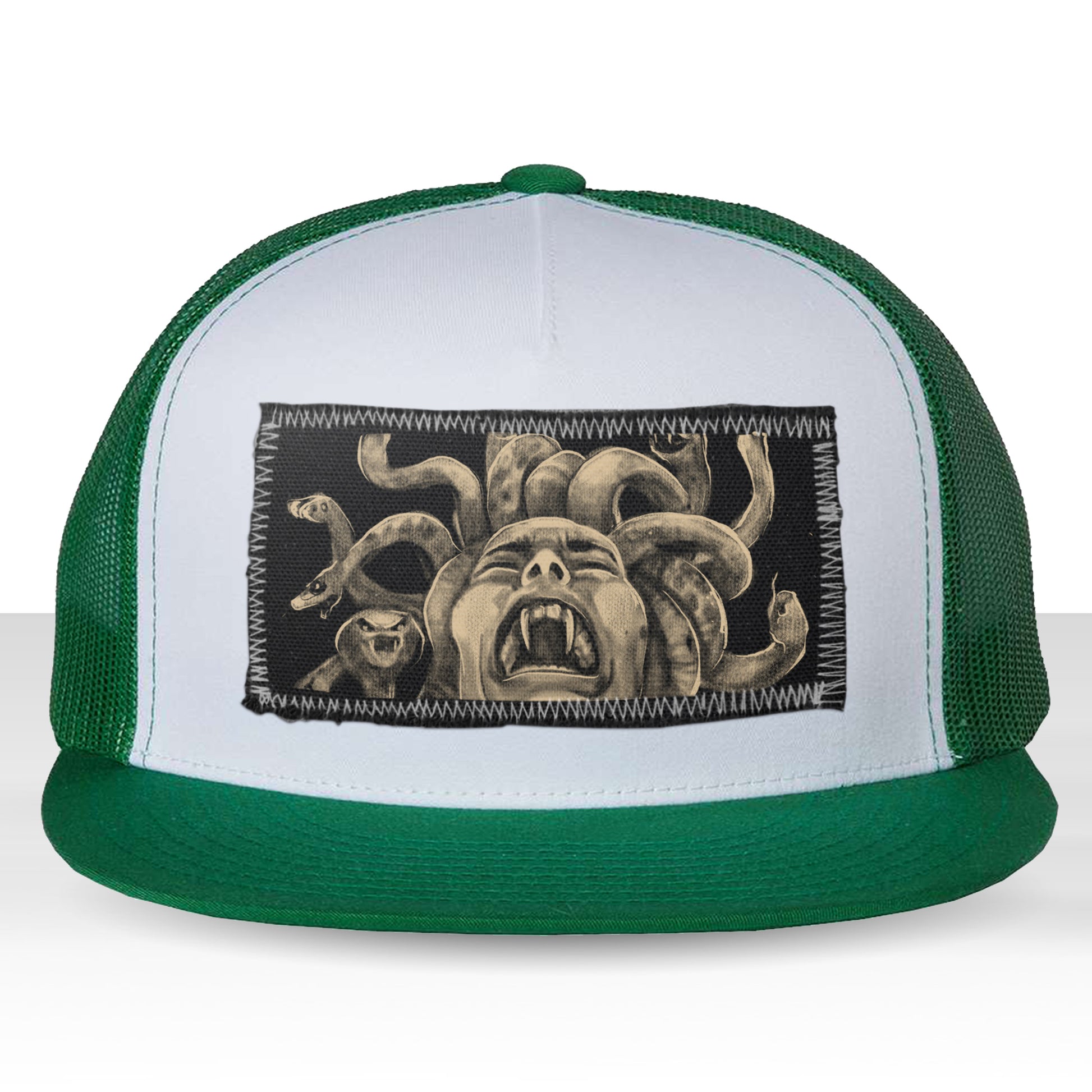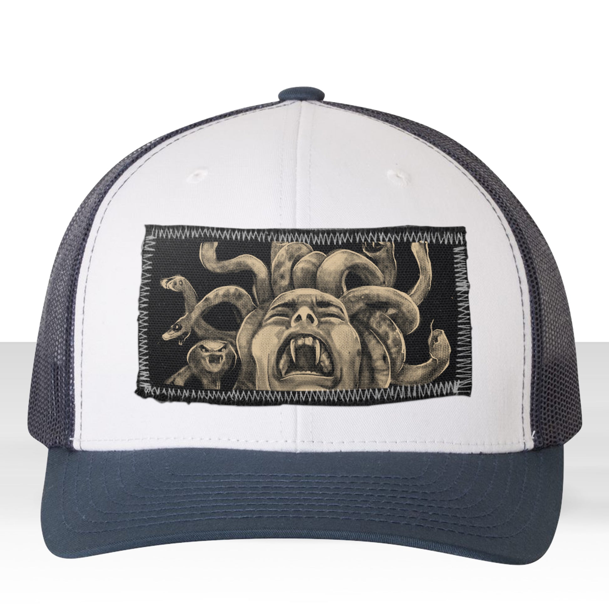 We meticulously hand-cut and stitch each patch before screen printing with water-based inks. For our hats, we use YP Classics - Five-Panel Classic Trucker for flat bills with a high profile, and YP Classics - Six-Panel Trucker Cap for curved bills with a mid profile. Both styles feature a 65/35 polyester/cotton blend, a mesh back, and a snapback closure. These trucker hats showcase FabCreates' signature gritty, imperfect style.