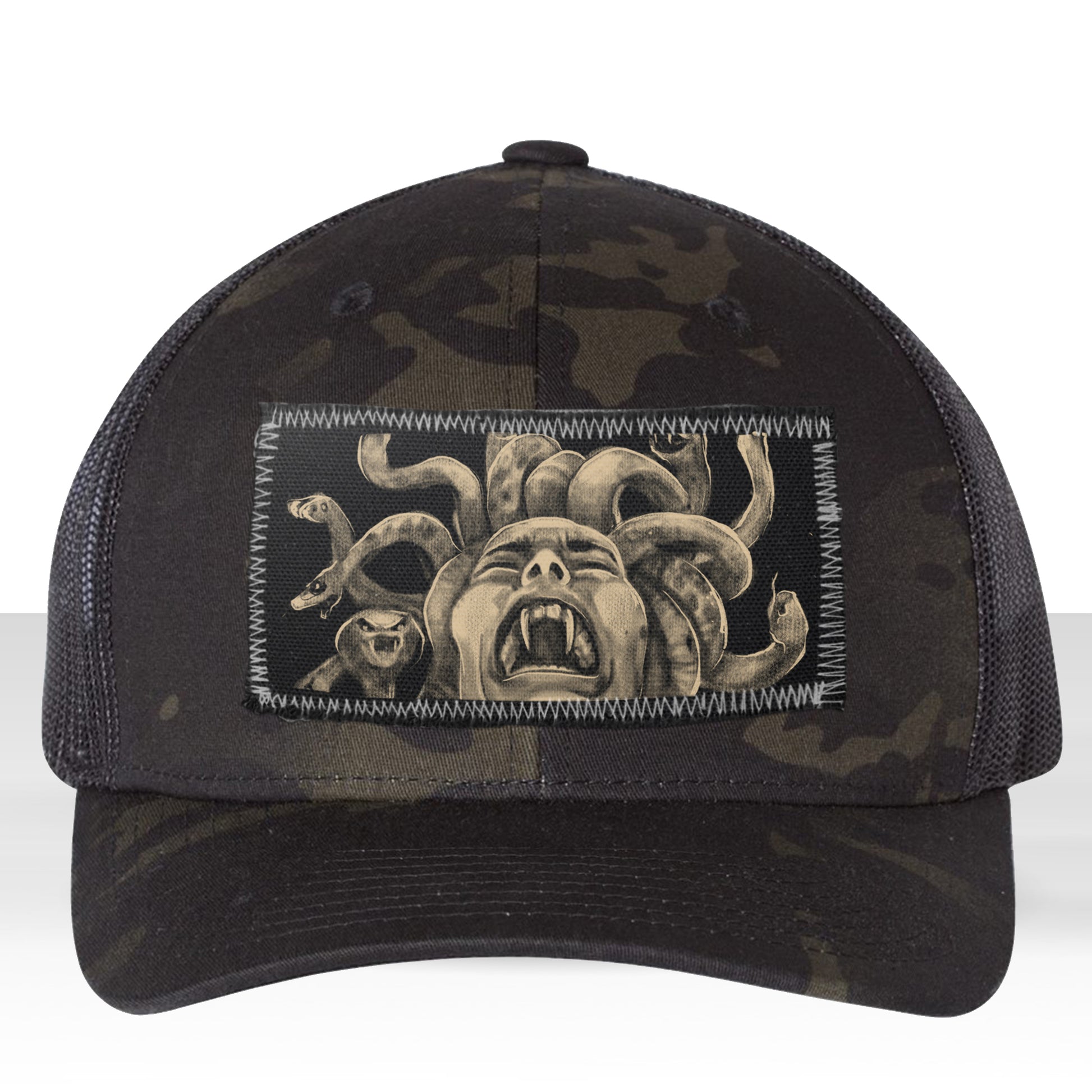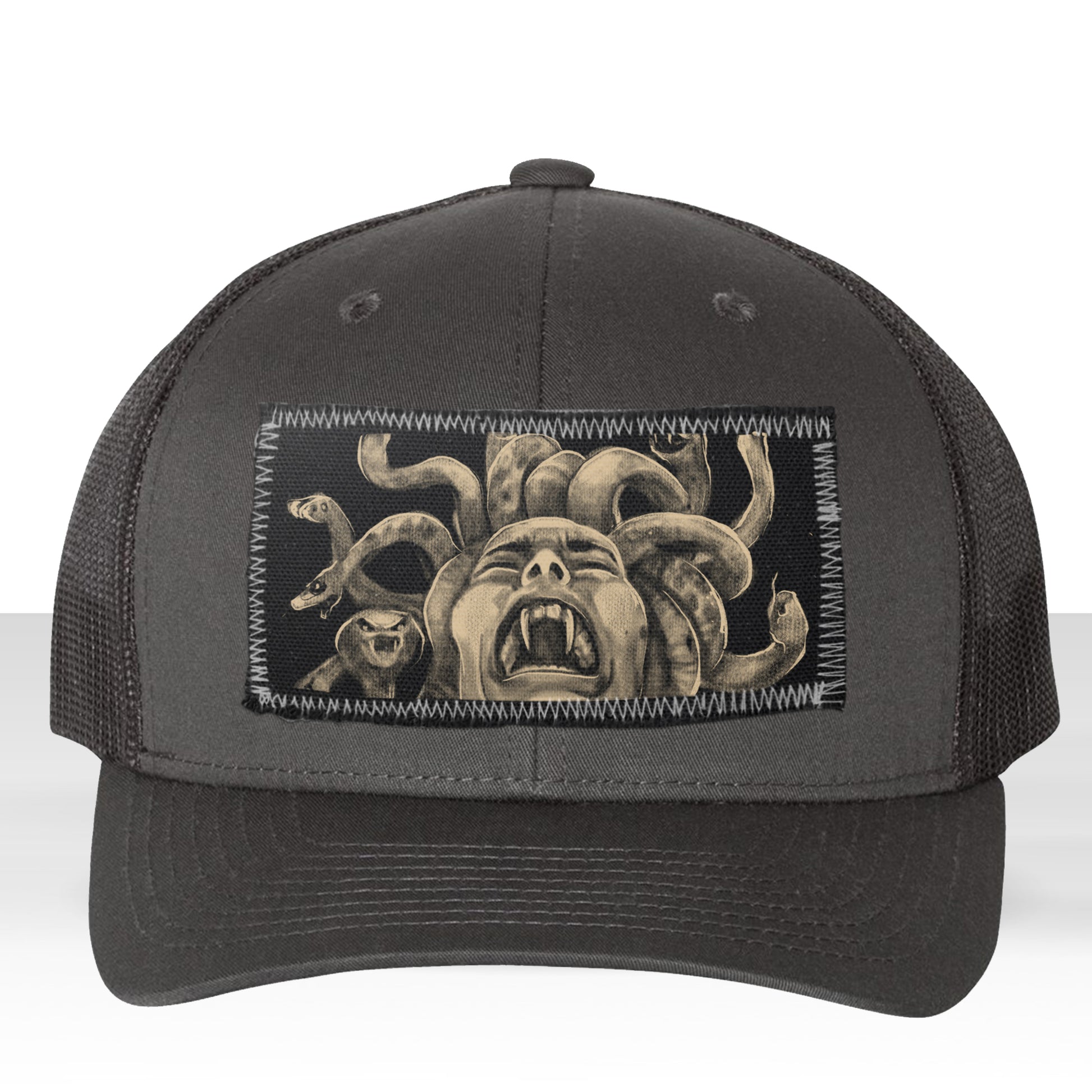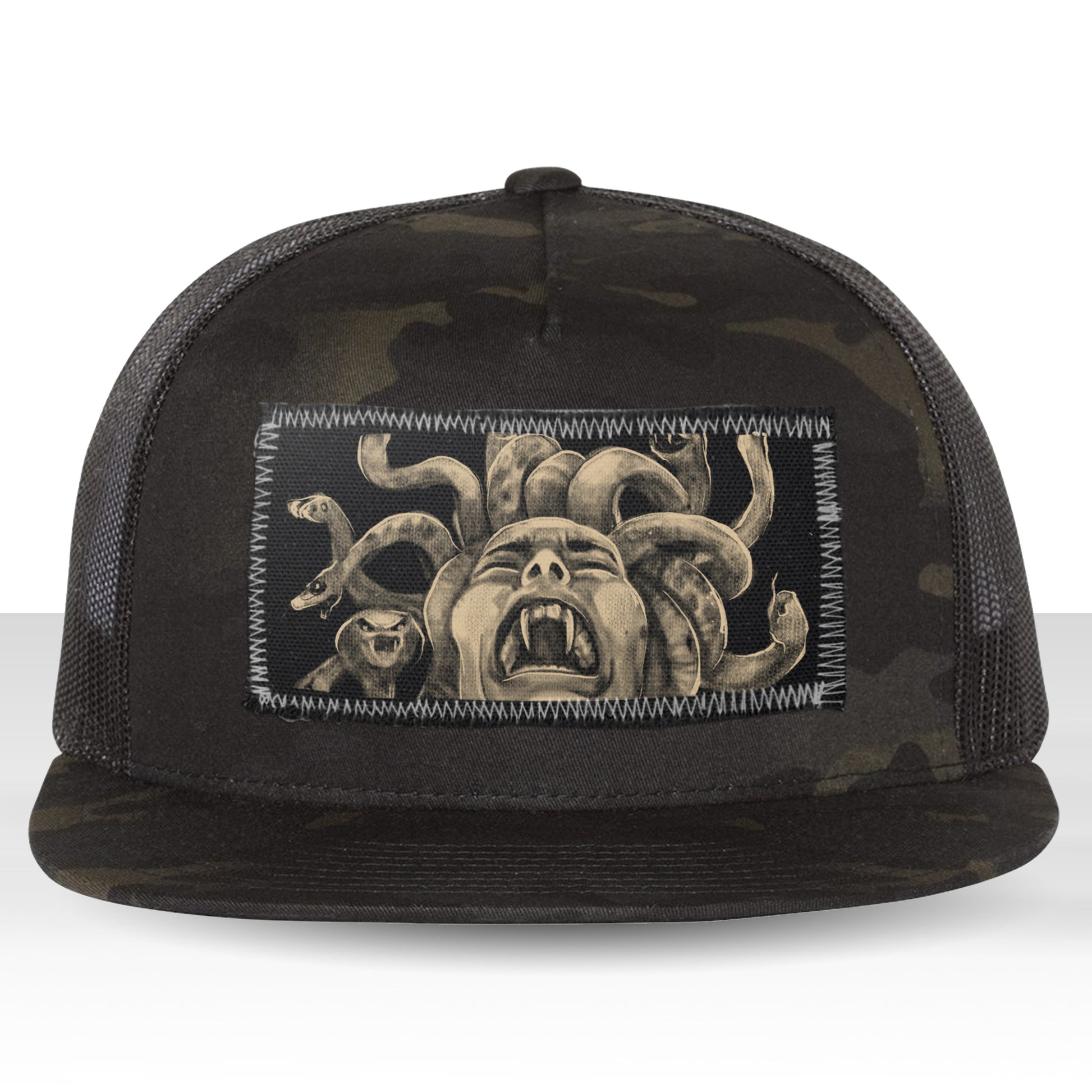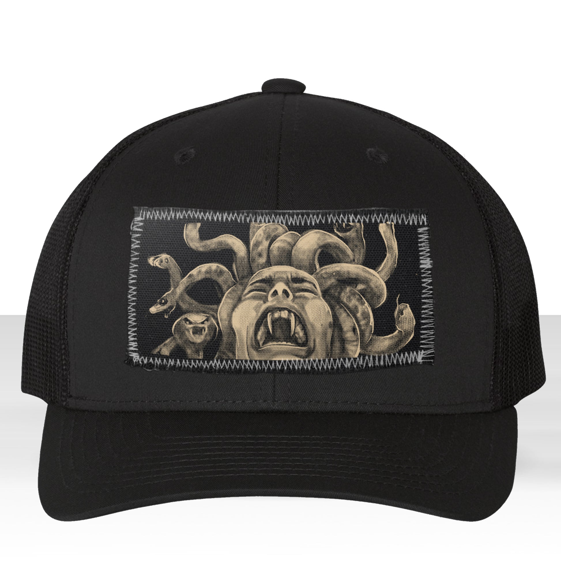 We meticulously hand-cut and stitch each patch before screen printing with water-based inks. For our hats, we use YP Classics - Five-Panel Classic Trucker for flat bills with a high profile, and YP Classics - Six-Panel Trucker Cap for curved bills with a mid profile. Both styles feature a 65/35 polyester/cotton blend, a mesh back, and a snapback closure. These trucker hats showcase FabCreates' signature gritty, imperfect style.