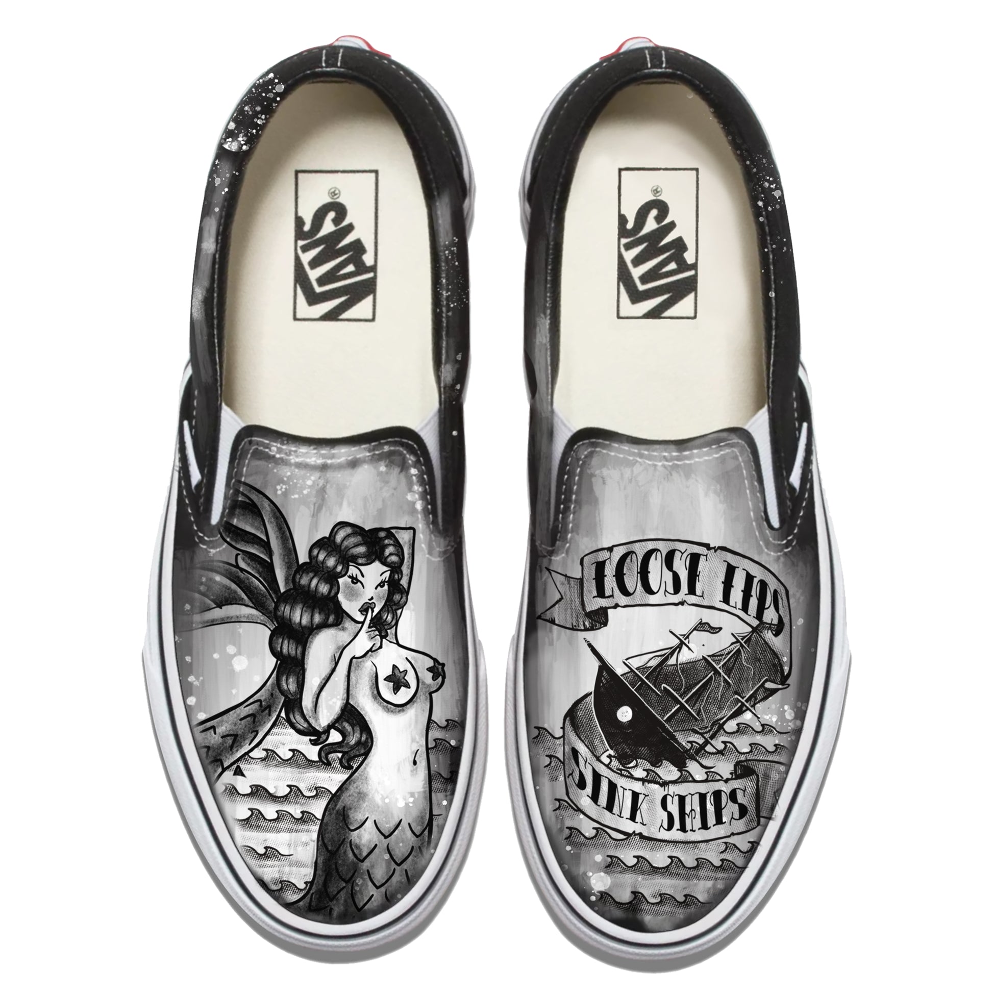 Immerse yourself in the timeless allure of naval tradition with our "Navy Mermaid: Loose Lips Sink Ships" print. This captivating design pays homage to the vintage tattoo illustrators of World War II, featuring a stunning mermaid adorned with nautical motifs. Fab kept his ink line work extremely clean and uniformed, capturing the essence of the classic tattoo style.