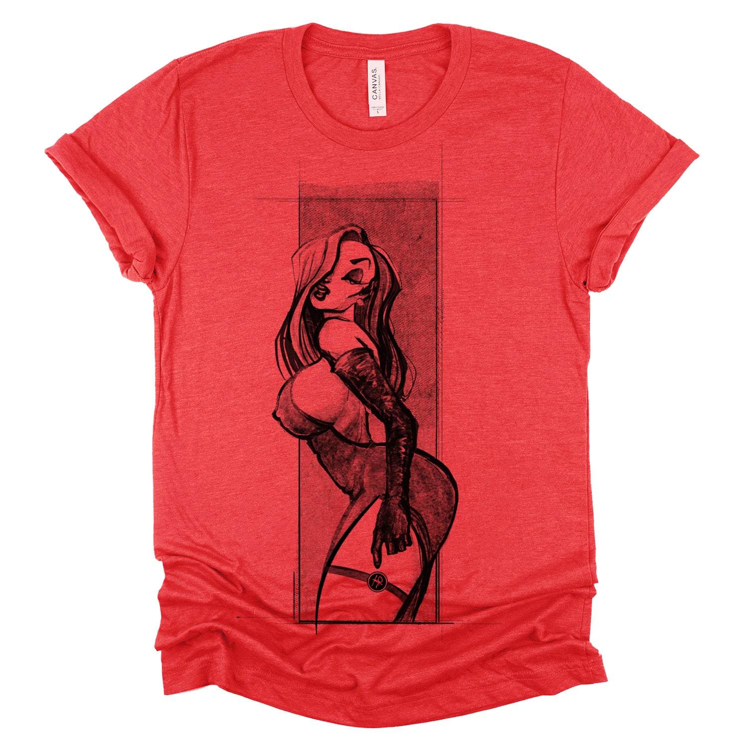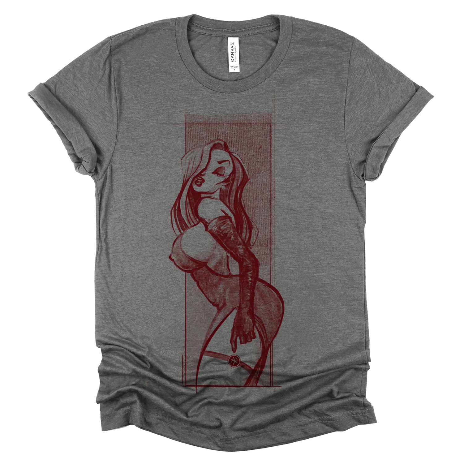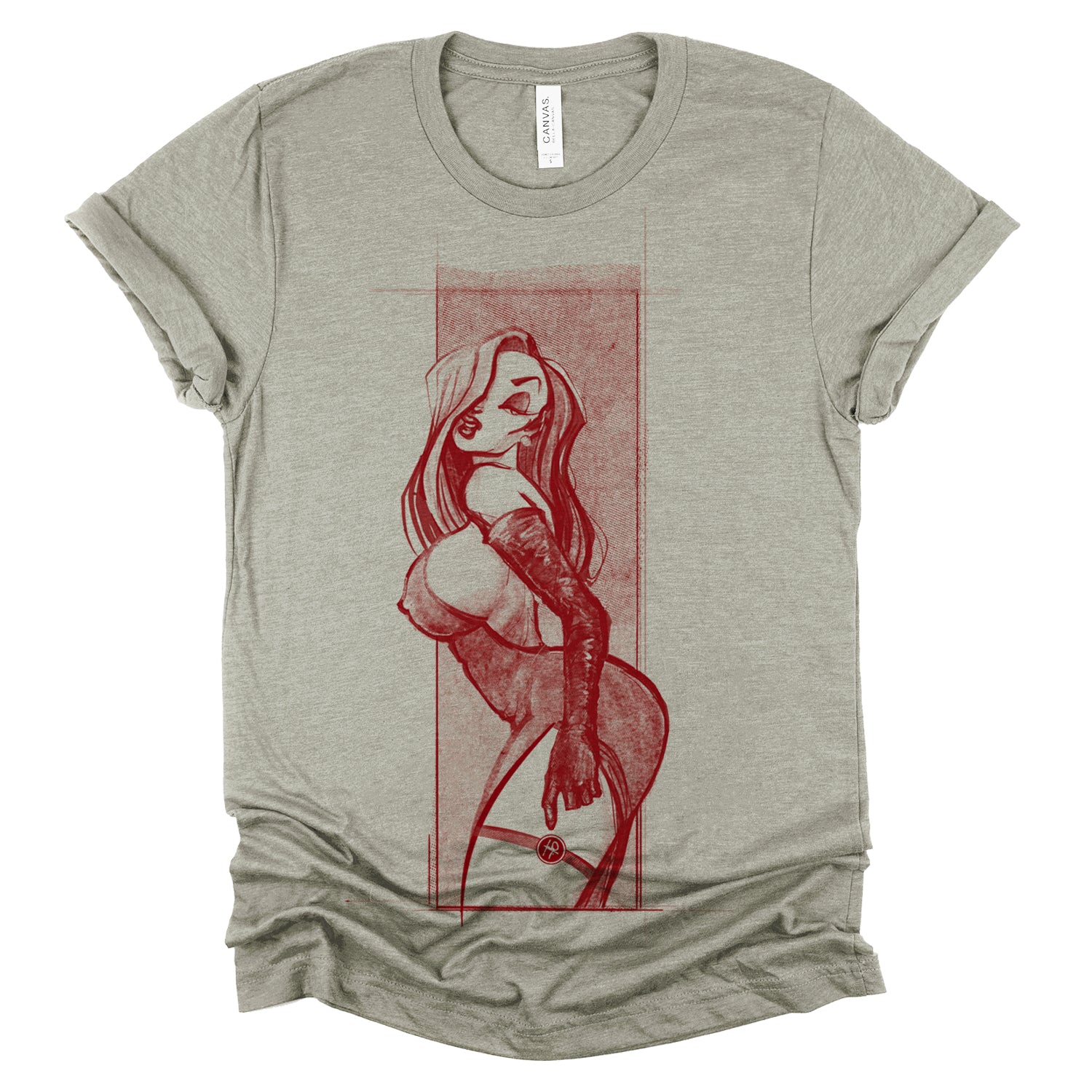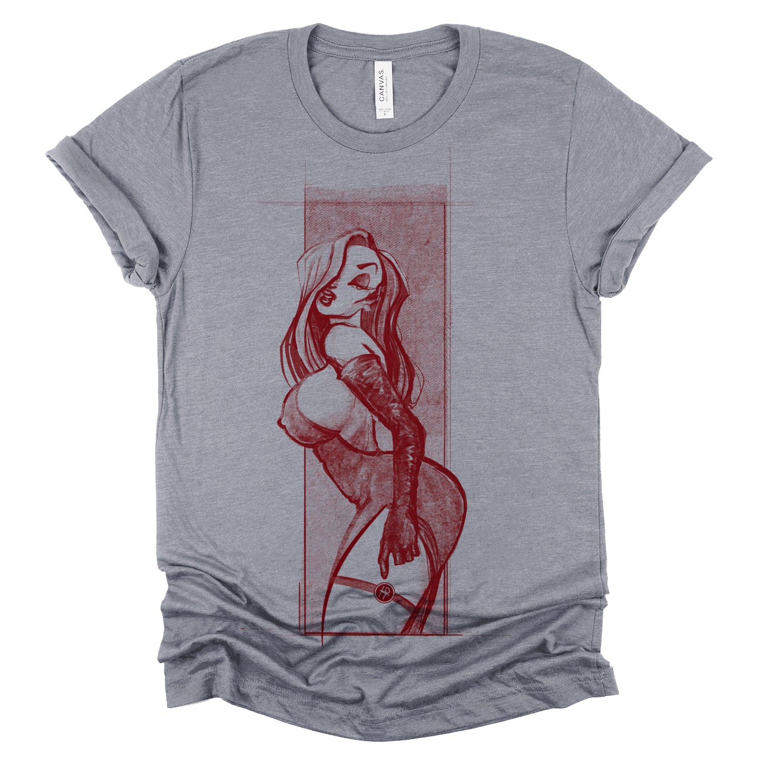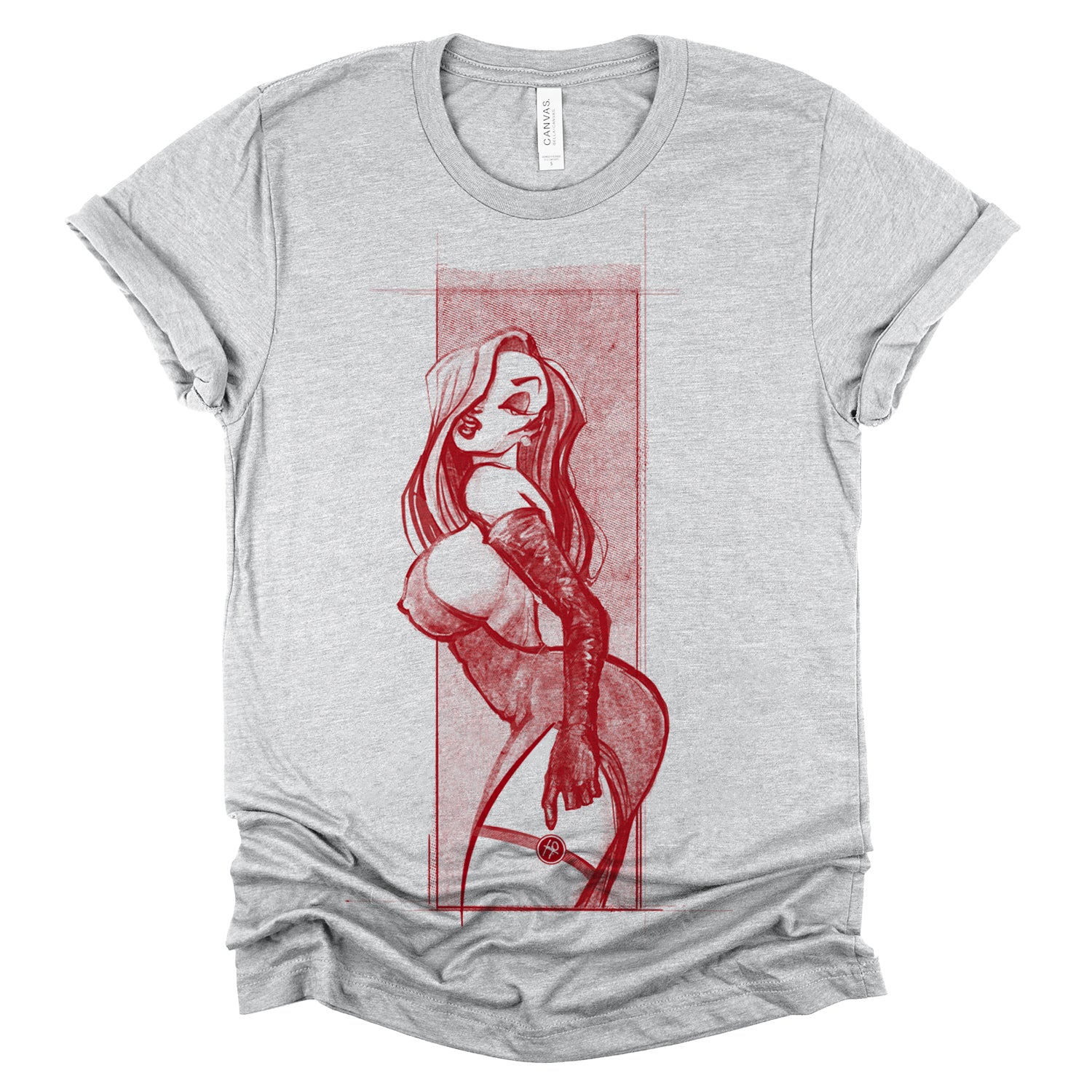 Indulge in the captivating blend of vintage charm and playful elegance with our "Mrs. Rabbit Pin-Up: Spicy Allure" print, featuring the iconic Jessica Rabbit. This unique design showcases the glamorous and sultry character that left a lasting impression on many 90s boys. In a classic pin-up style, it embodies both sophistication and cheeky fun.