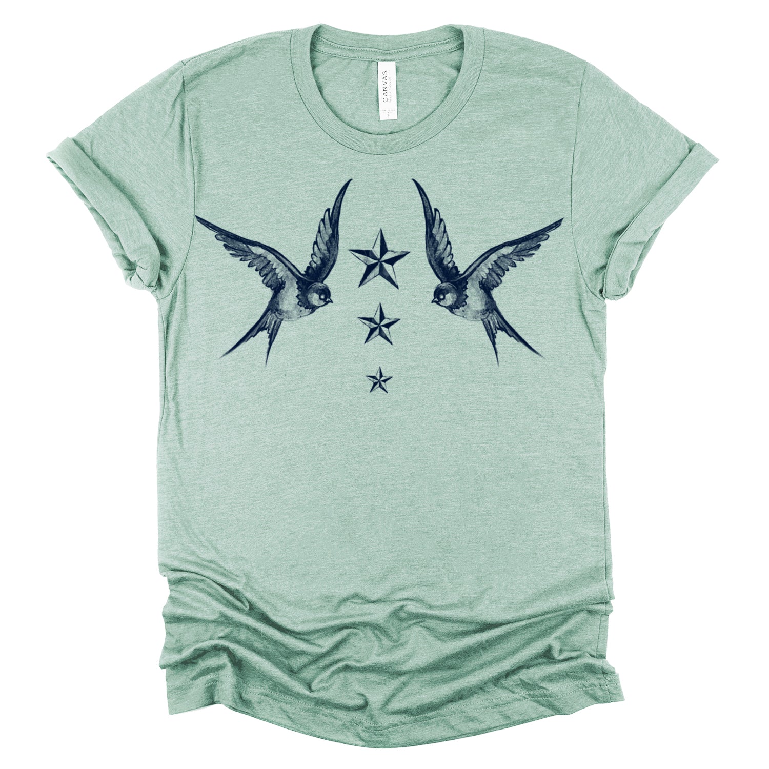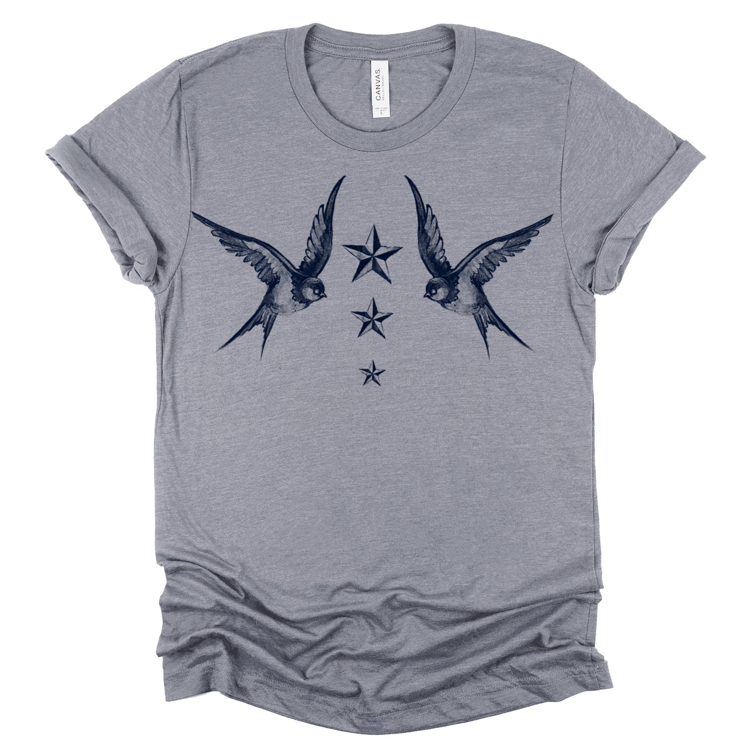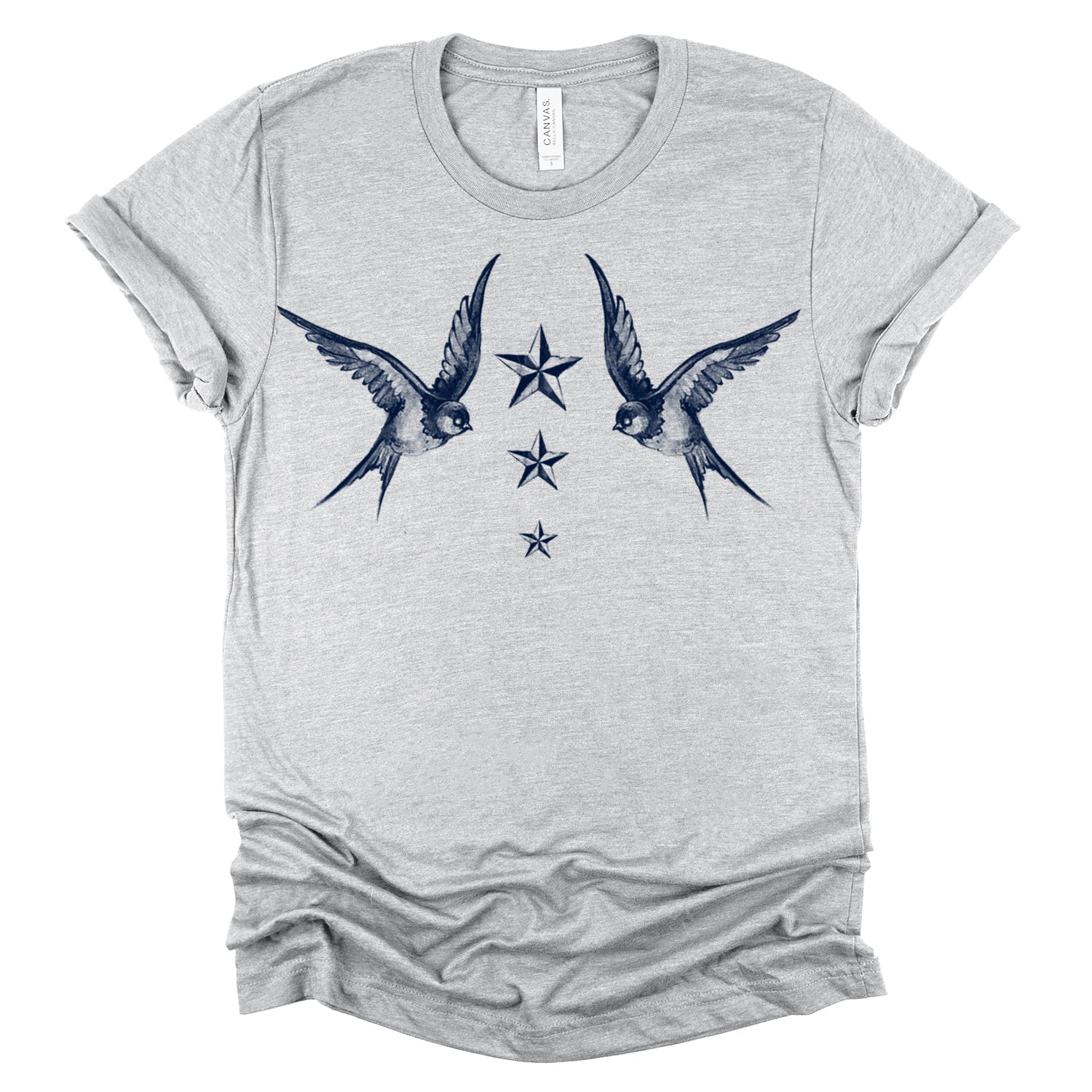 Fly into the world of maritime tradition with our "Navy Swallow Birds: A Tribute to Vintage Naval Tattoos" print. This classic design pays homage to vintage naval tattoos, featuring graceful swallow birds in flight against a navy blue backdrop. Handcrafted on premium Unisex Heather Tees (52% Cotton/48% Poly) with water-based inks, this shirt embodies FabCreates' dedication to quality and timeless style.