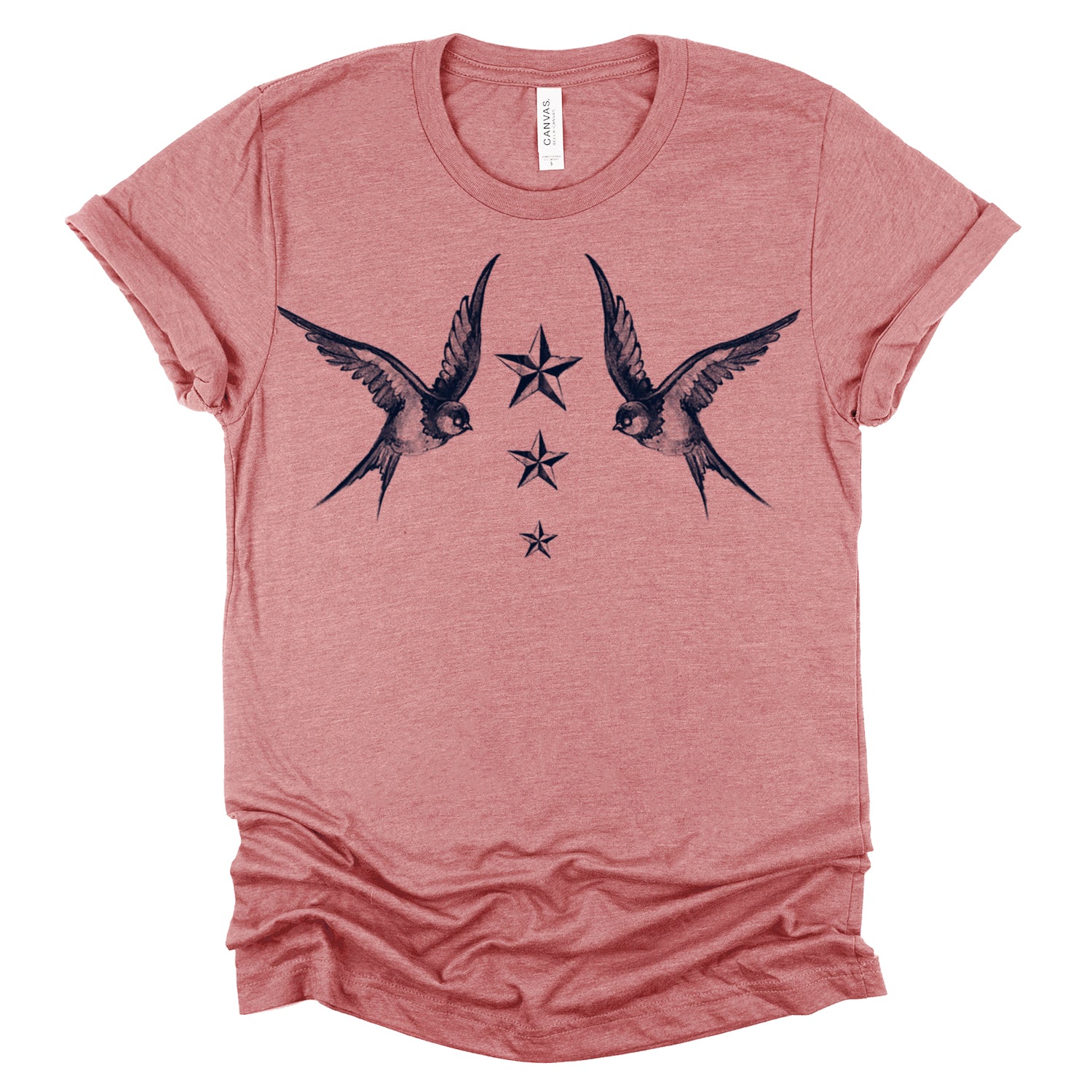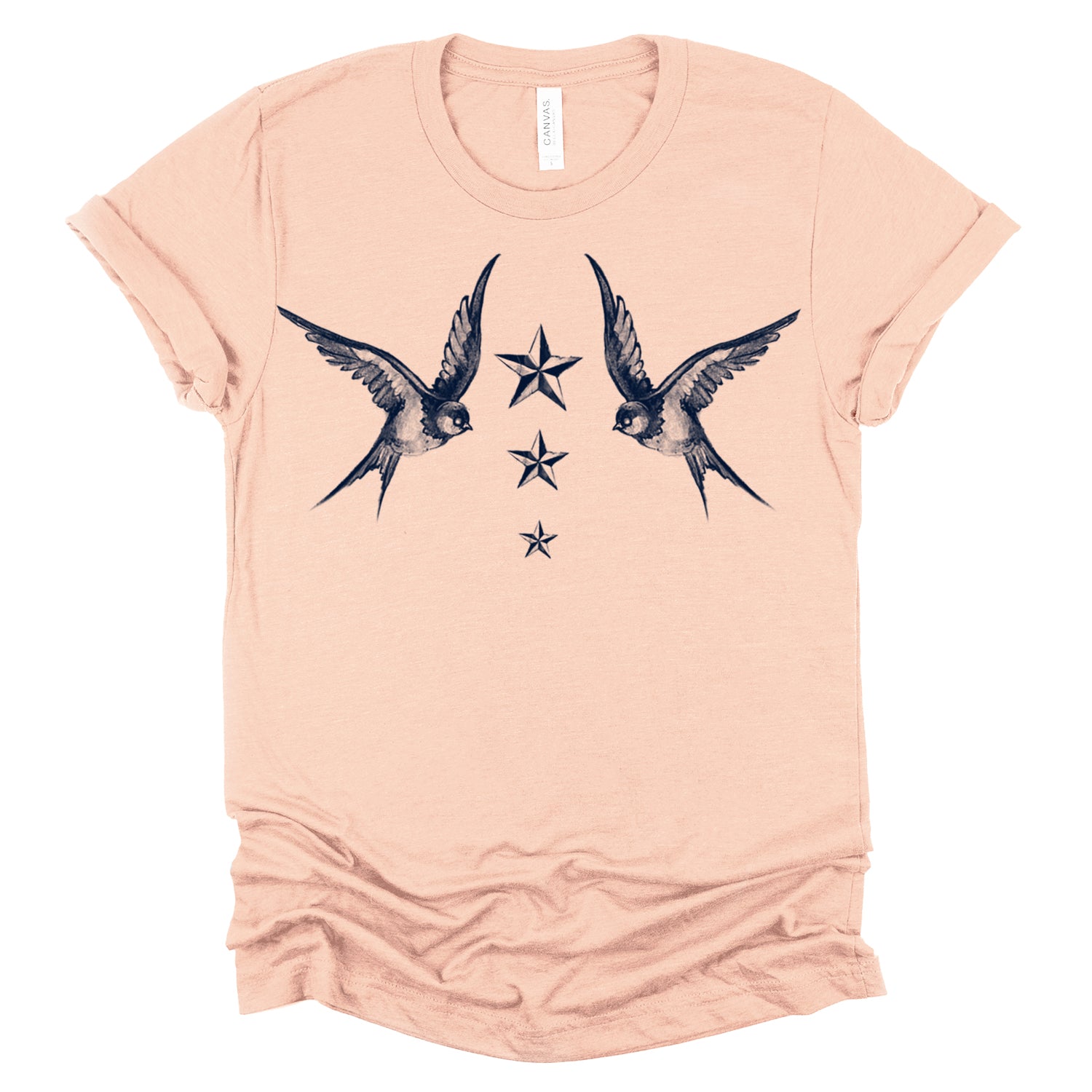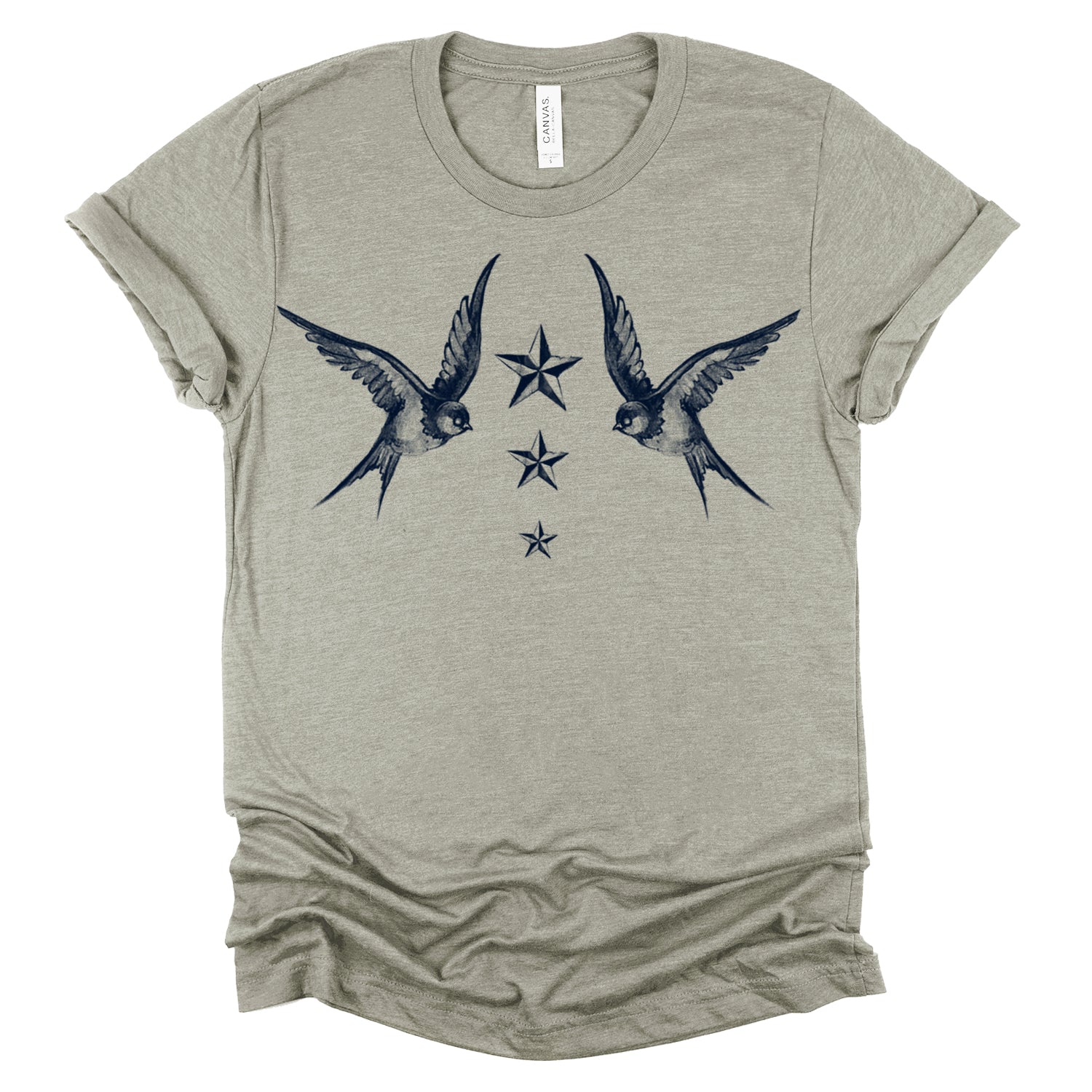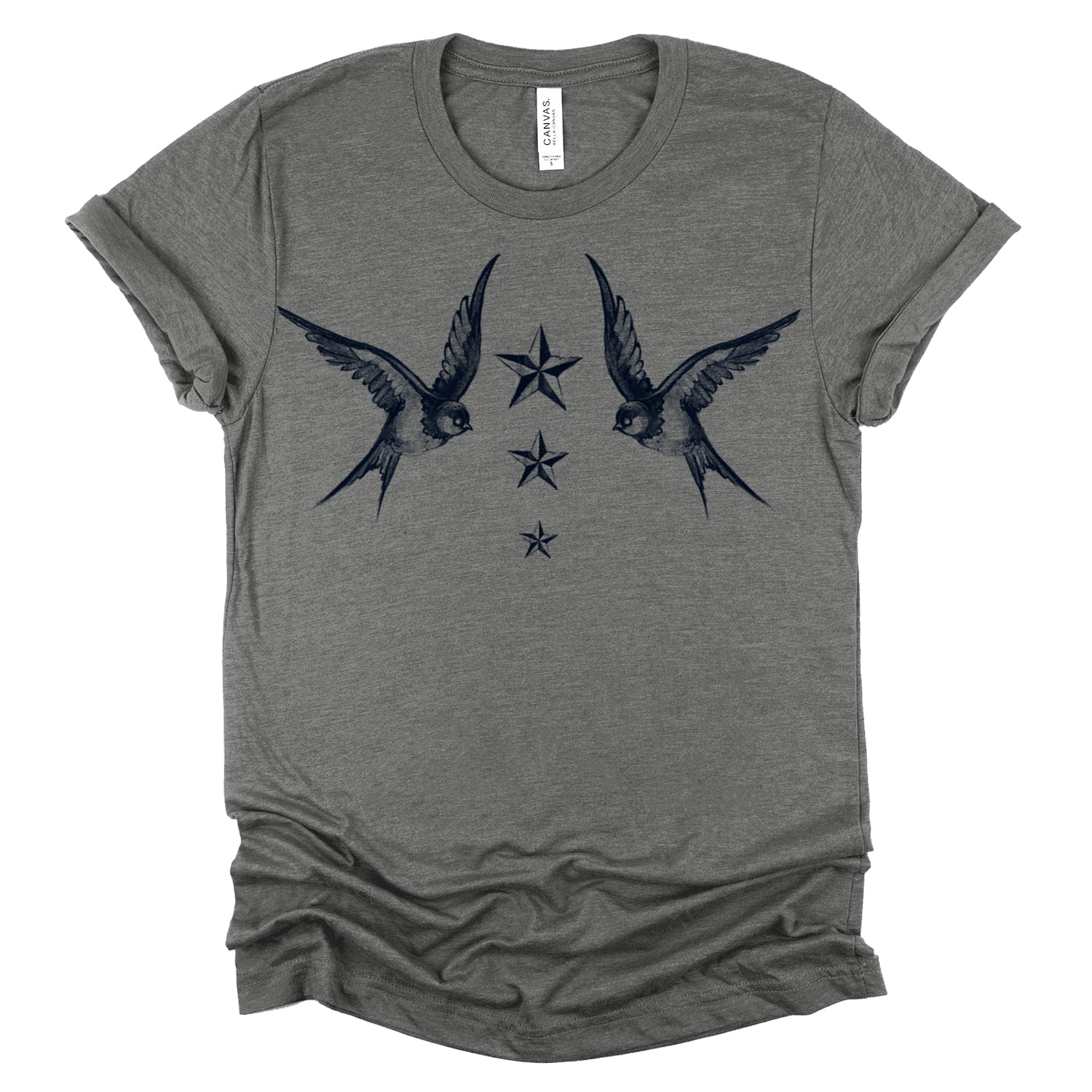 Fly into the world of maritime tradition with our "Navy Swallow Birds: A Tribute to Vintage Naval Tattoos" print. This classic design pays homage to vintage naval tattoos, featuring graceful swallow birds in flight against a navy blue backdrop. Handcrafted on premium Unisex Heather Tees (52% Cotton/48% Poly) with water-based inks, this shirt embodies FabCreates' dedication to quality and timeless style.
