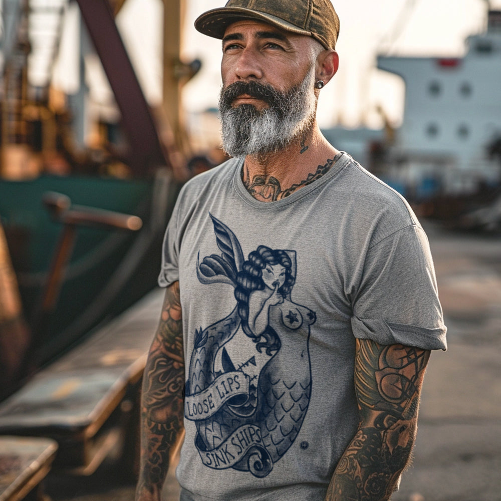 Immerse yourself in the timeless allure of naval tradition with our "Navy Mermaid: Loose Lips Sink Ships" print. This captivating design pays homage to the vintage tattoo illustrators of World War II, featuring a stunning mermaid adorned with nautical motifs. Fab kept his ink line work extremely clean and uniformed, capturing the essence of the classic tattoo style.