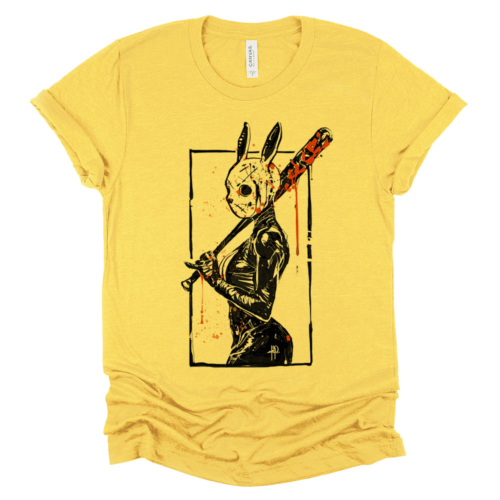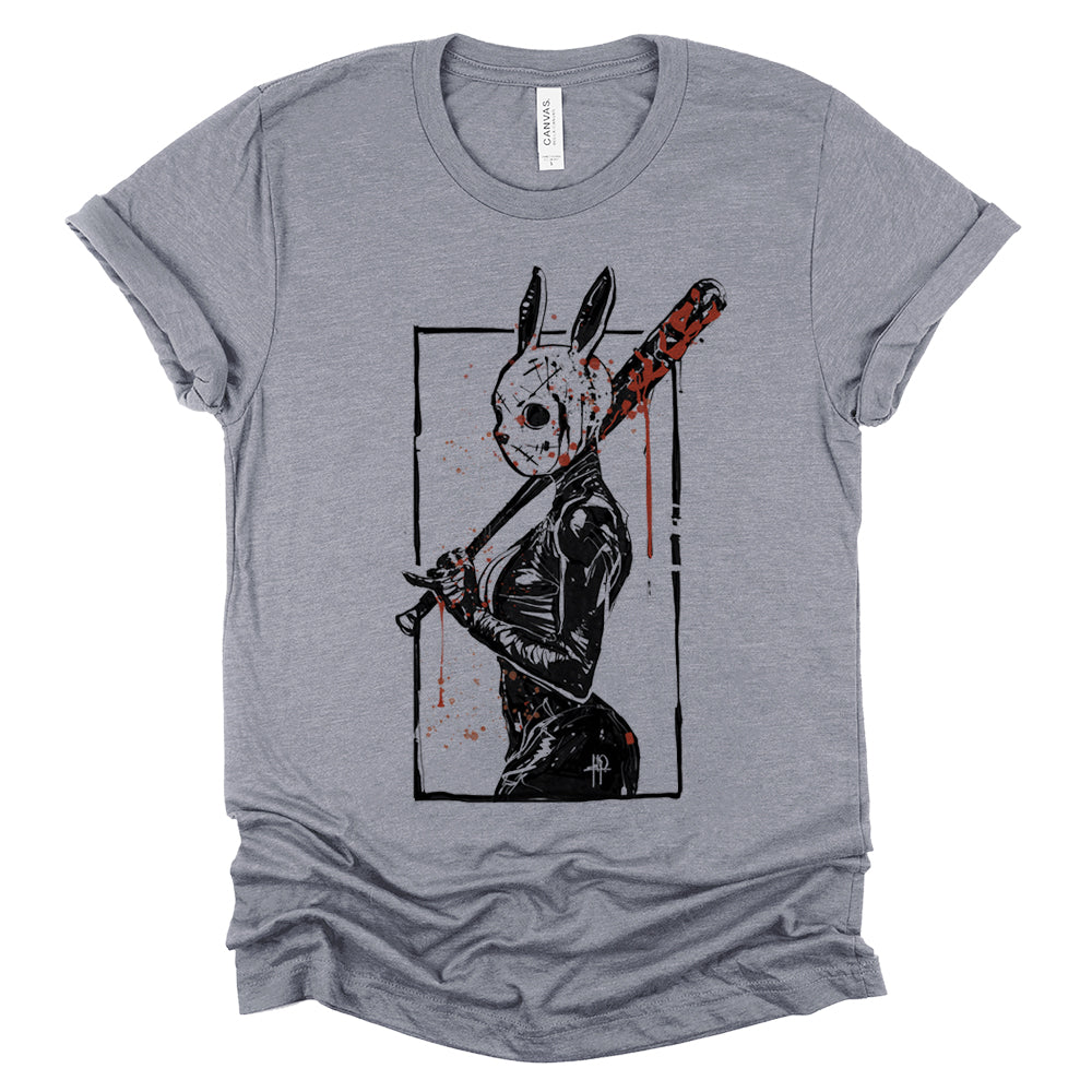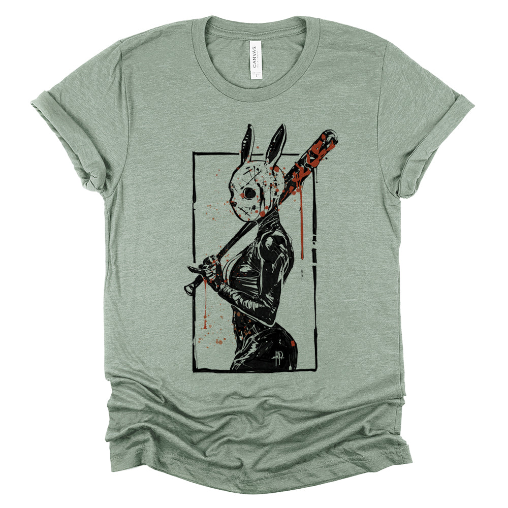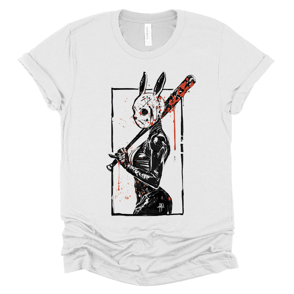 A predator in disguise—her pristine bunny mask hides a wicked grin, while the sleek black latex wraps her like a shadow. Dripping in blood, she’s the last thing you see before the night swallows you whole.