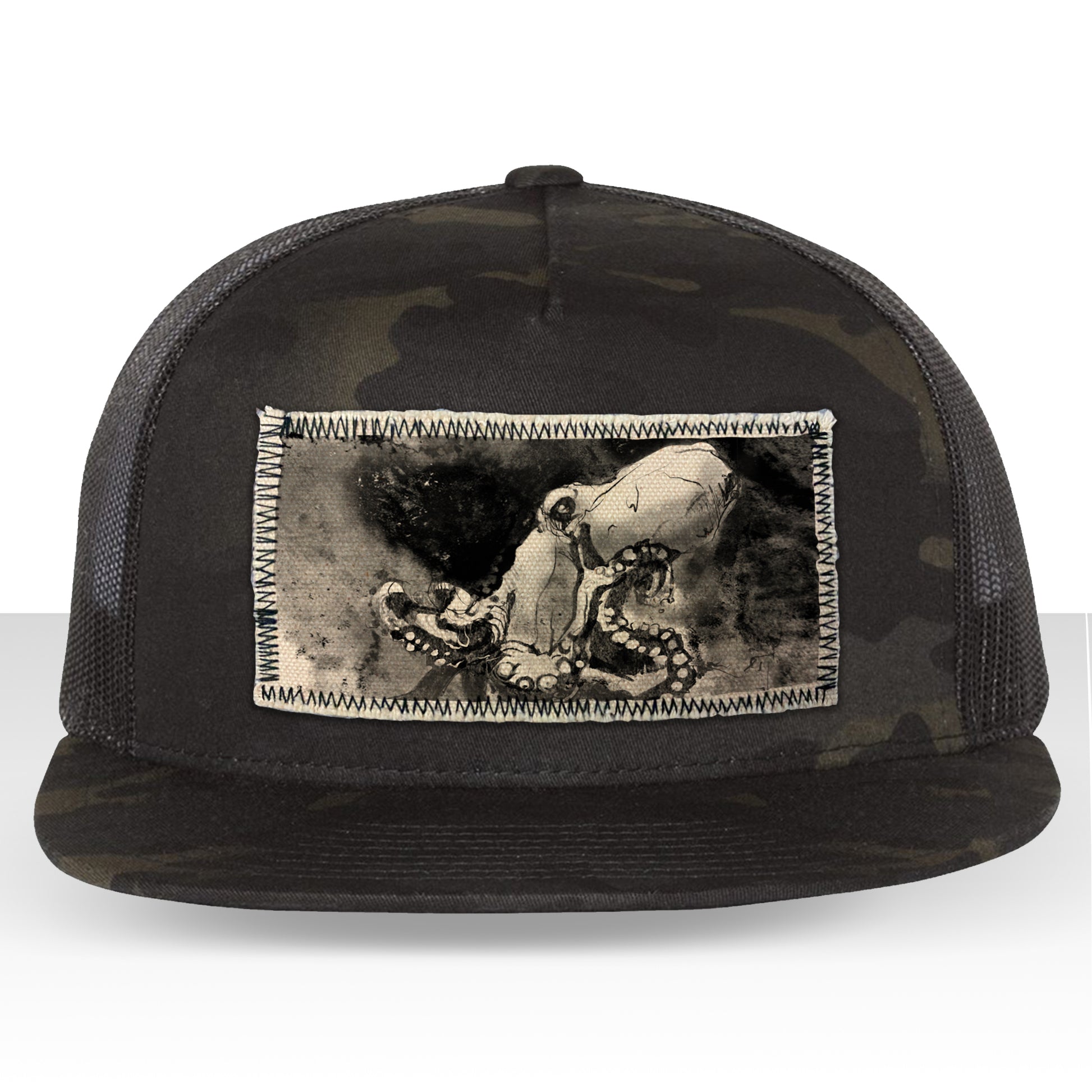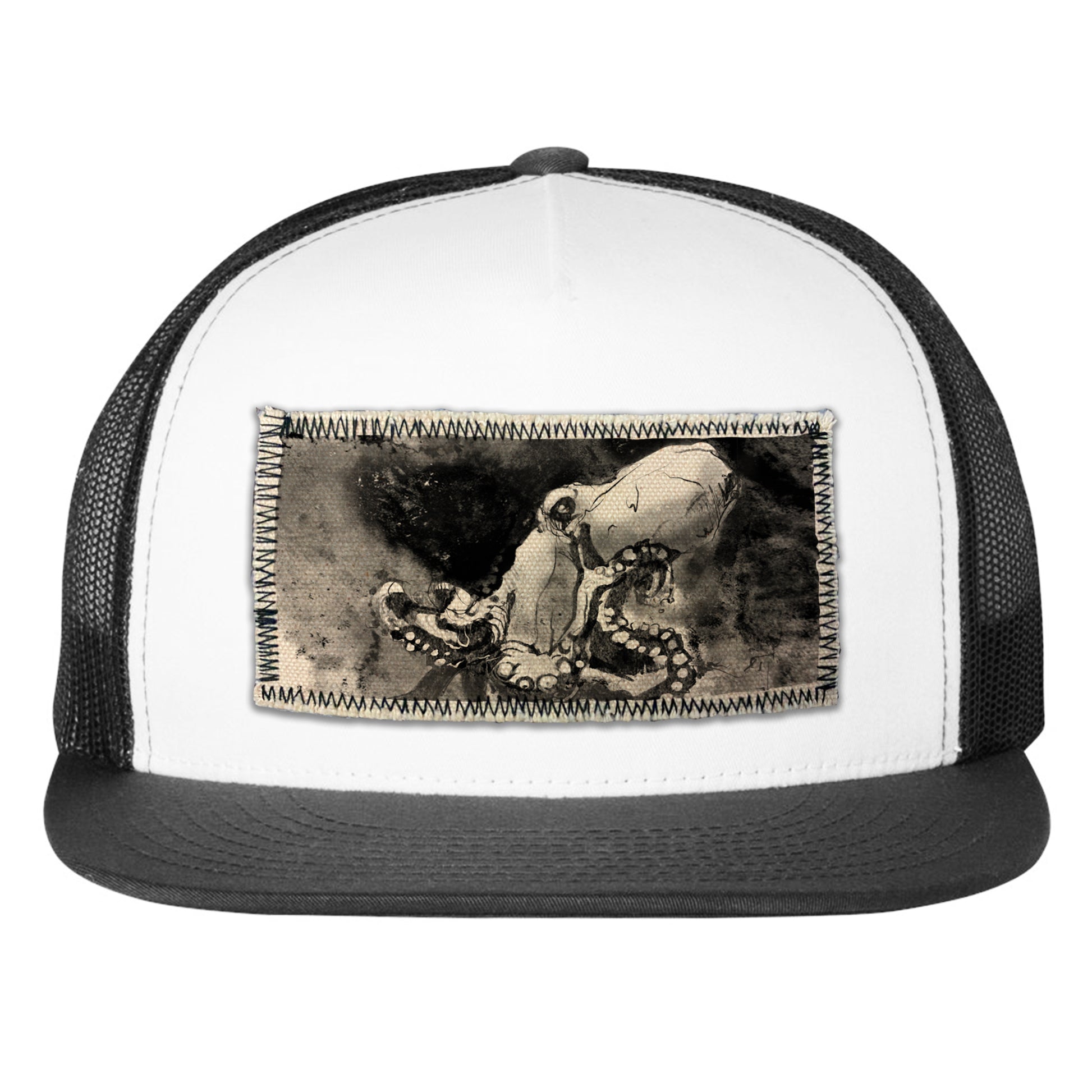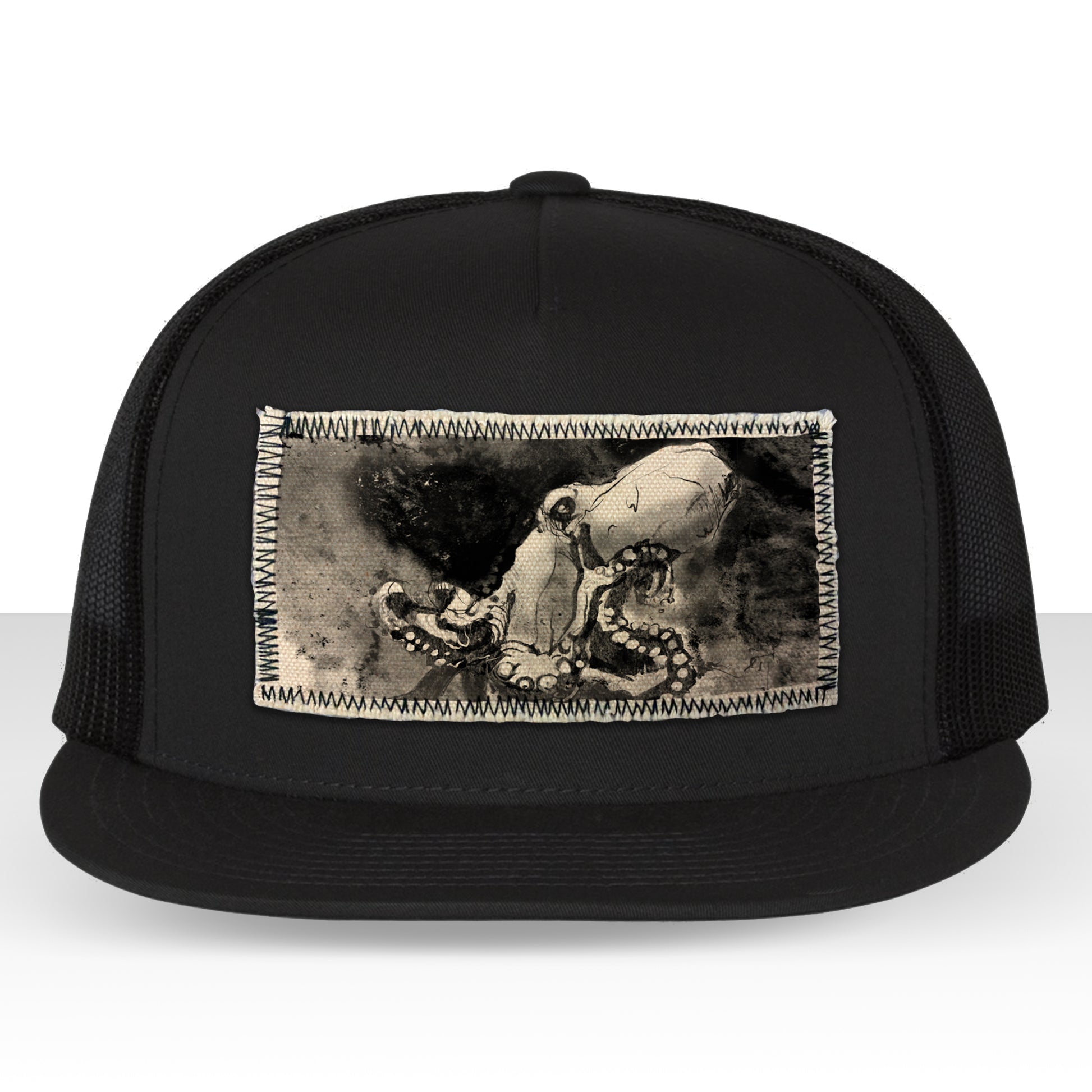 We meticulously hand-cut and stitch each patch before screen printing with water-based inks. For our hats, we use YP Classics - Five-Panel Classic Trucker for flat bills with a high profile, and YP Classics - Six-Panel Trucker Cap for curved bills with a mid profile. Both styles feature a 65/35 polyester/cotton blend, a mesh back, and a snapback closure. These trucker hats showcase FabCreates' signature gritty, imperfect style.