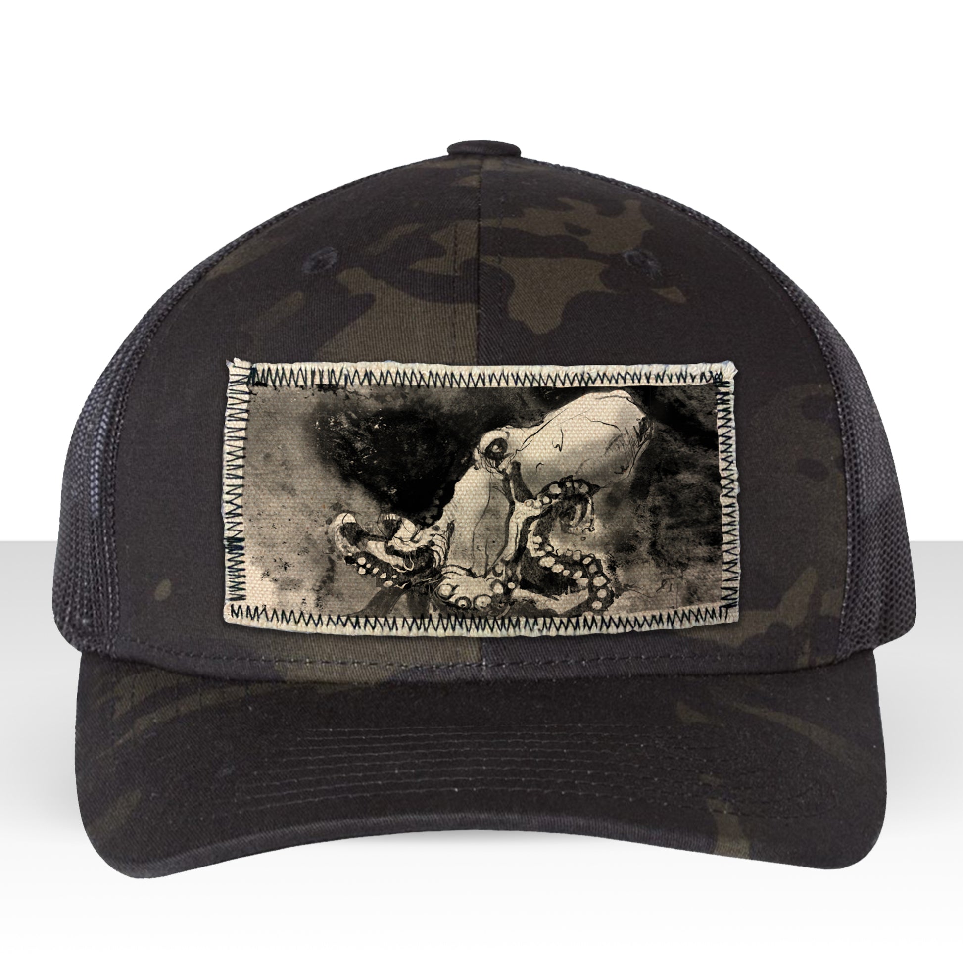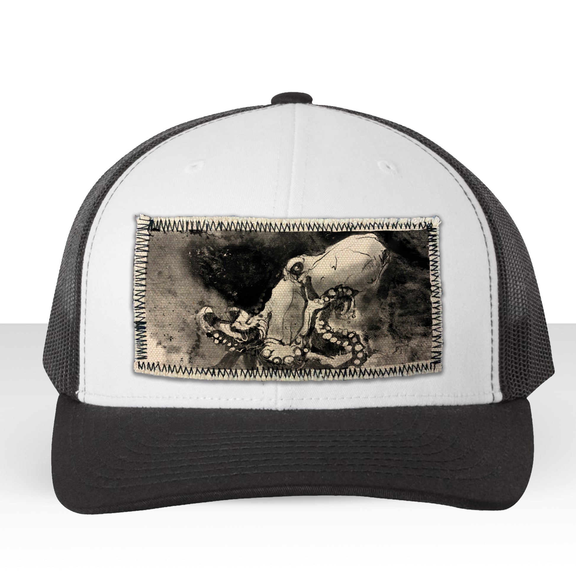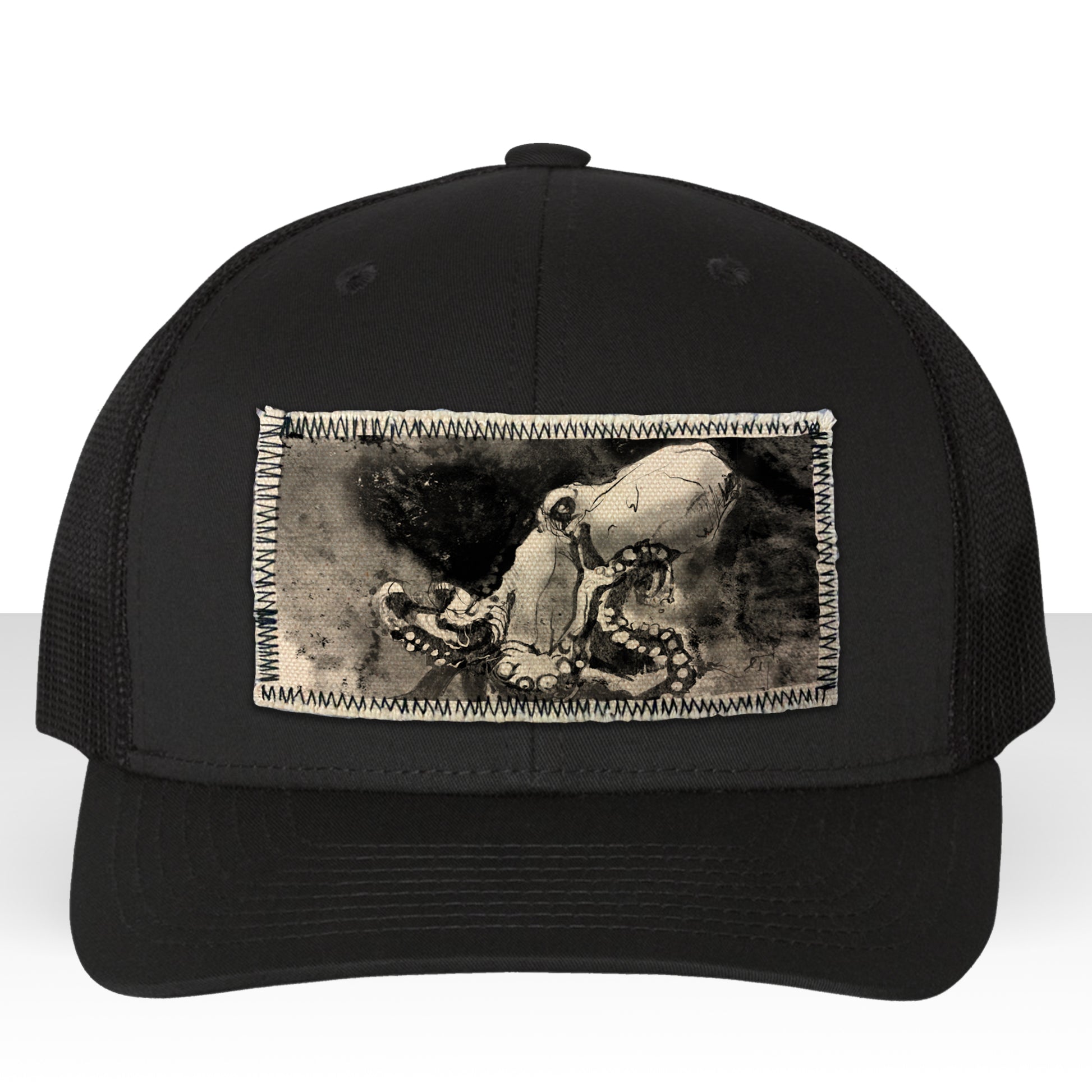 We meticulously hand-cut and stitch each patch before screen printing with water-based inks. For our hats, we use YP Classics - Five-Panel Classic Trucker for flat bills with a high profile, and YP Classics - Six-Panel Trucker Cap for curved bills with a mid profile. Both styles feature a 65/35 polyester/cotton blend, a mesh back, and a snapback closure. These trucker hats showcase FabCreates' signature gritty, imperfect style.
