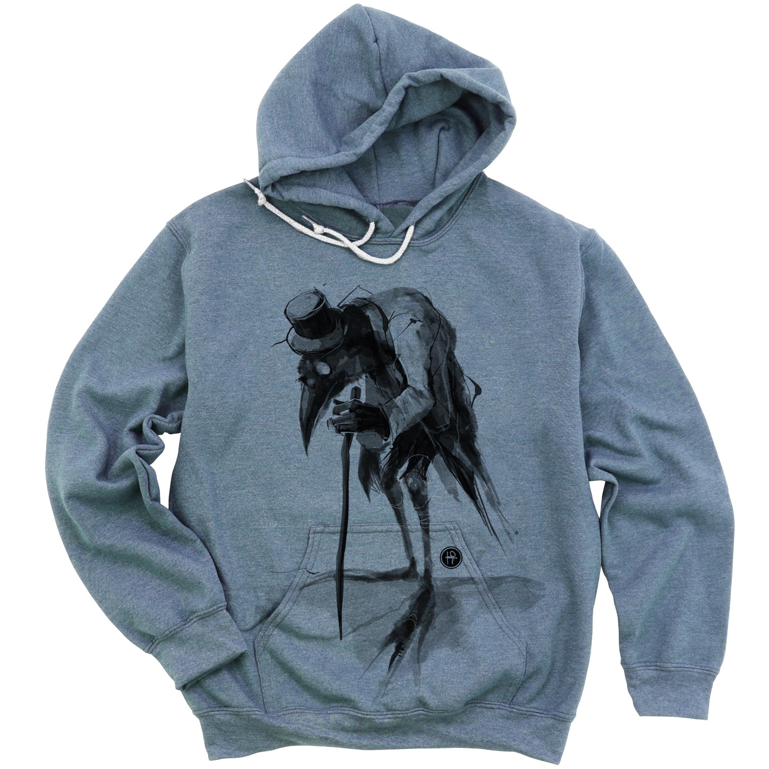 Step into the mysterious world of "Old Crow: Penniless in Dark Feathers" print. This drawing captures the essence of a poor old crow in misfortune, depicted with a cane. Fab has rendered this piece mostly in full, wet ink with blotchy brushwork and minimal ink lines, creating a stark and evocative atmosphere.