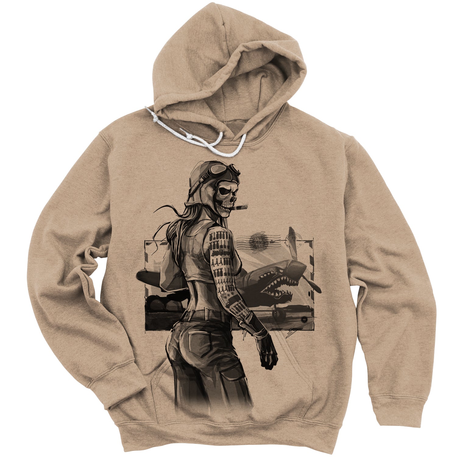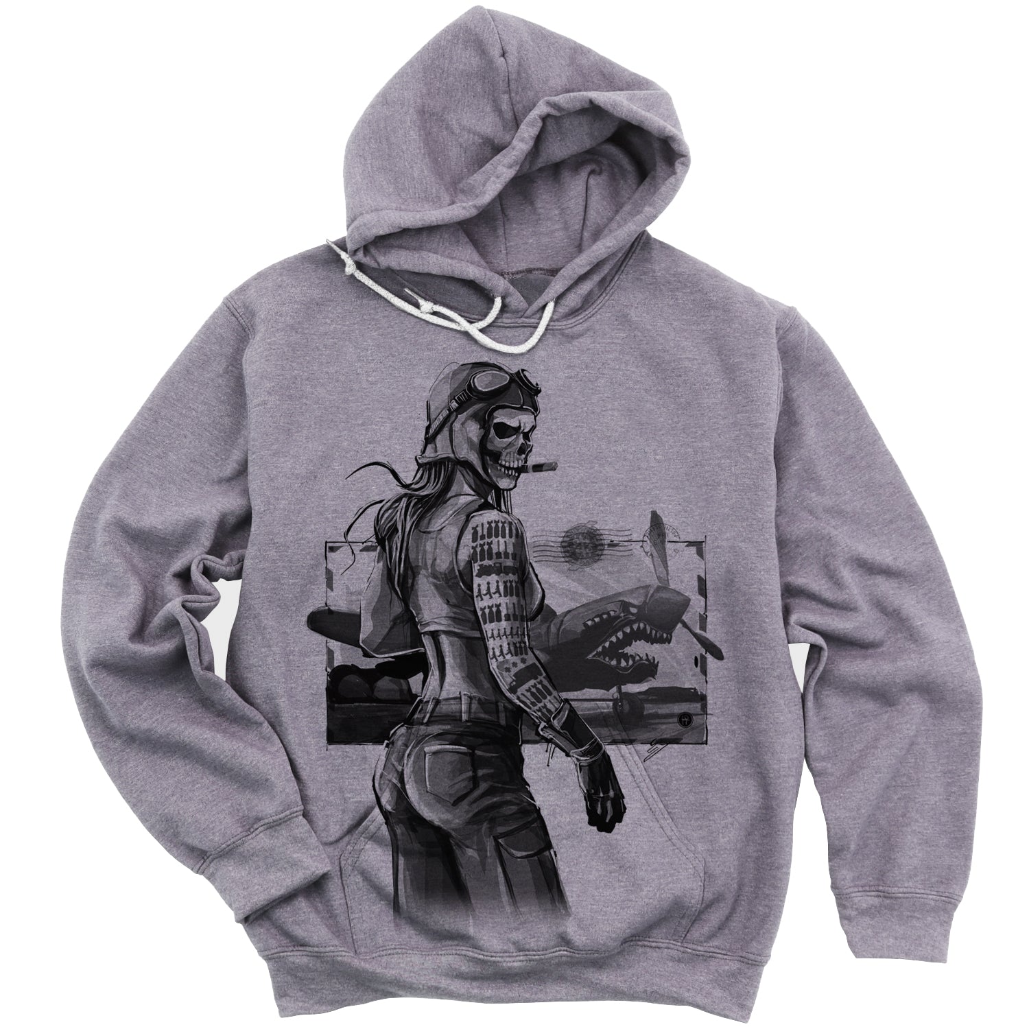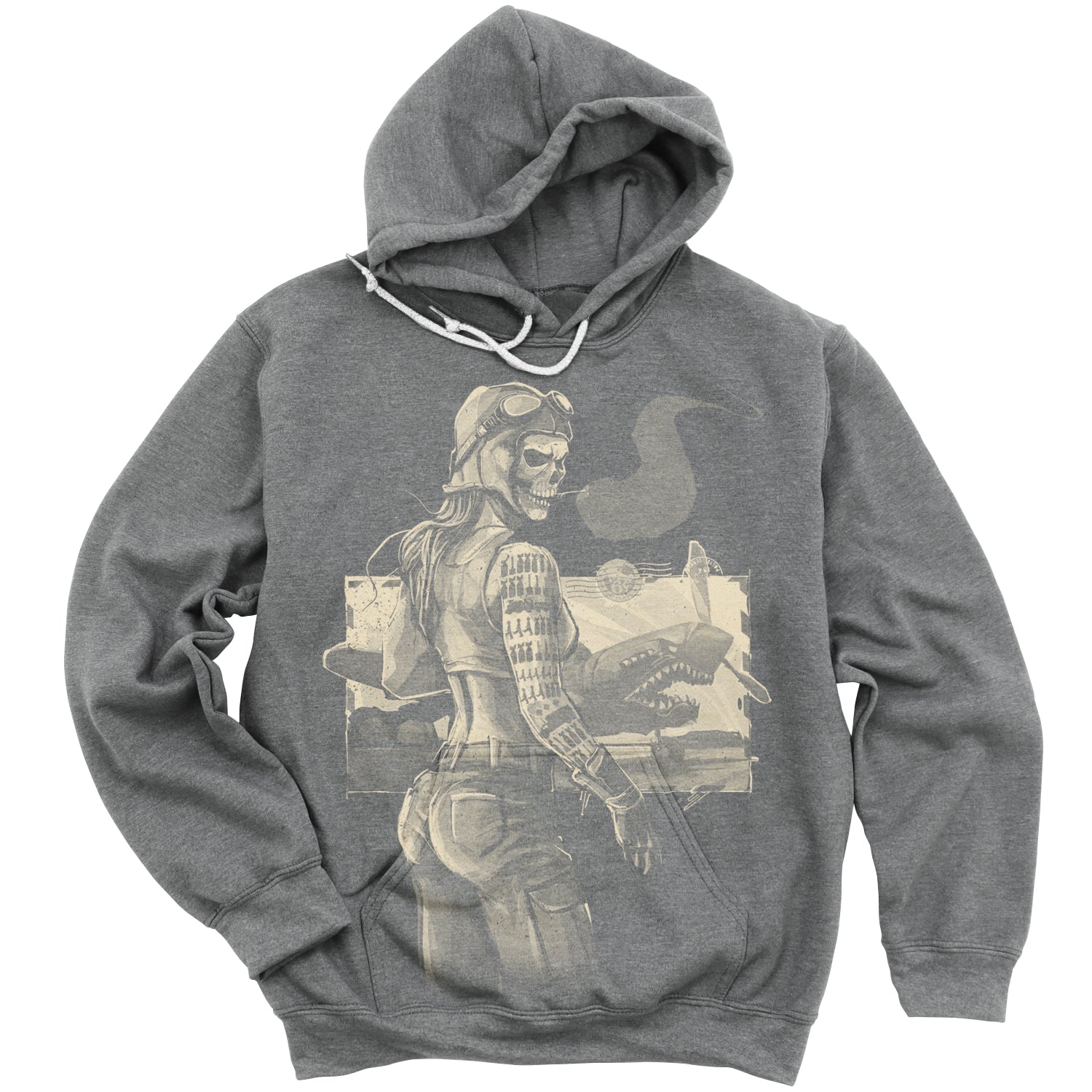 Honor the fierce spirit of aviation with our "Pilot's Tally: Conquer the Skies" print. This striking design features a formidable female pilot with a skull face, her combat victories tallied as tattoos on her arm. She stands defiantly in front of her warbird, a menacing machine adorned with real shark teeth. Rendered in a polished, finished style, this piece highlights Fab's recurring fascination with vintage military themes.