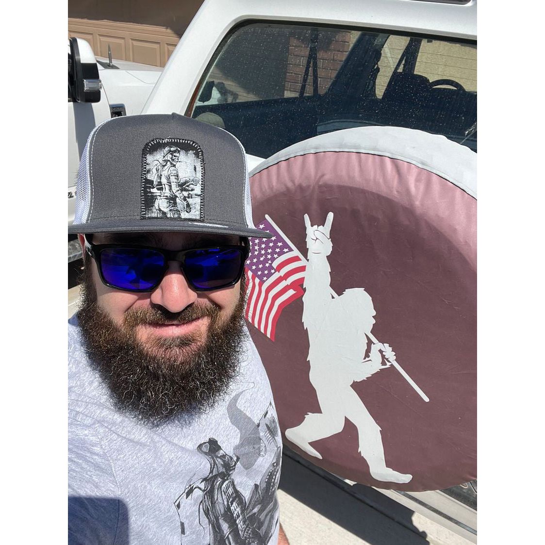 We meticulously hand-cut and stitch each patch before screen printing with water-based inks. For our hats, we use YP Classics - Five-Panel Classic Trucker for flat bills with a high profile, and YP Classics - Six-Panel Trucker Cap for curved bills with a mid profile. Both styles feature a 65/35 polyester/cotton blend, a mesh back, and a snapback closure. These trucker hats showcase FabCreates' signature gritty, imperfect style.