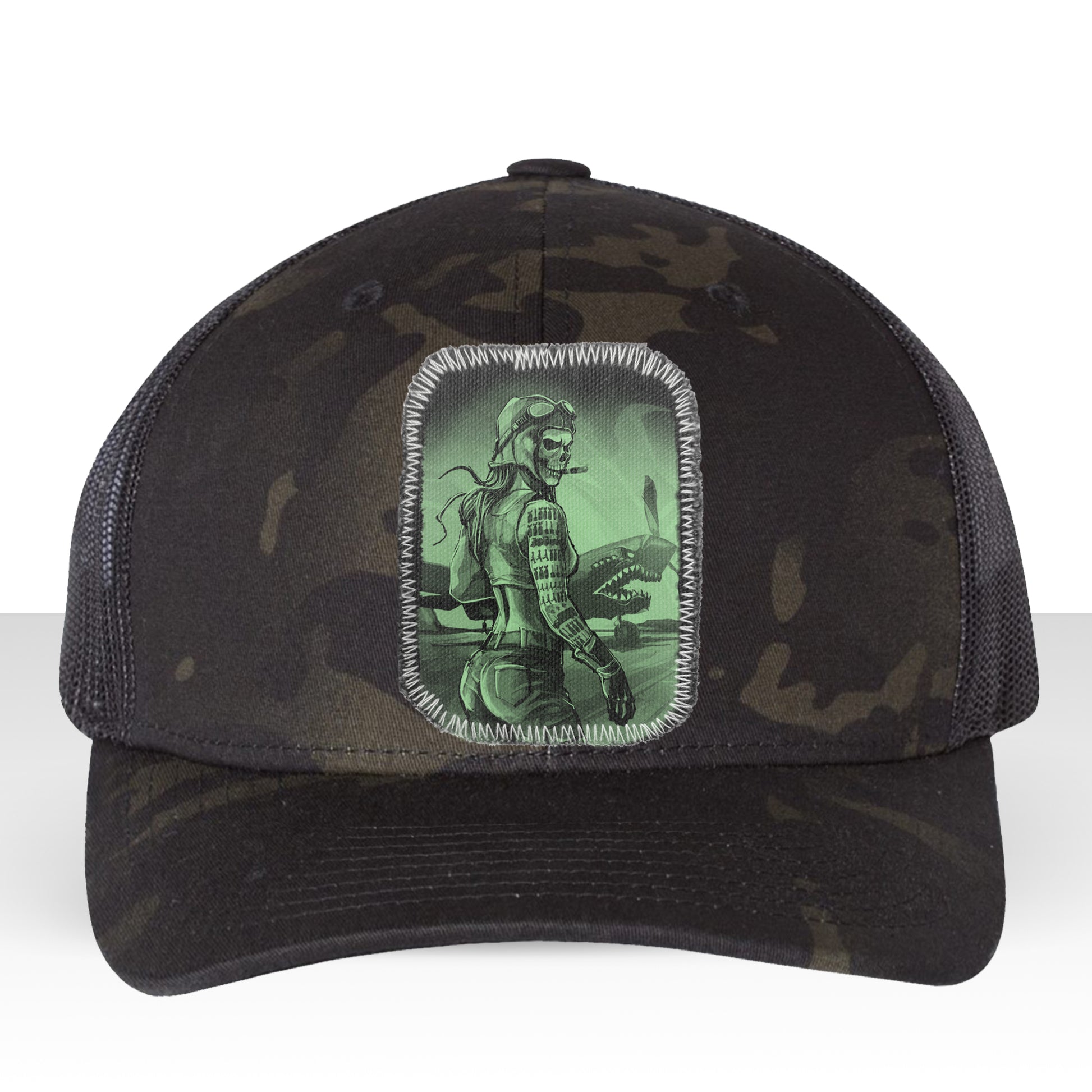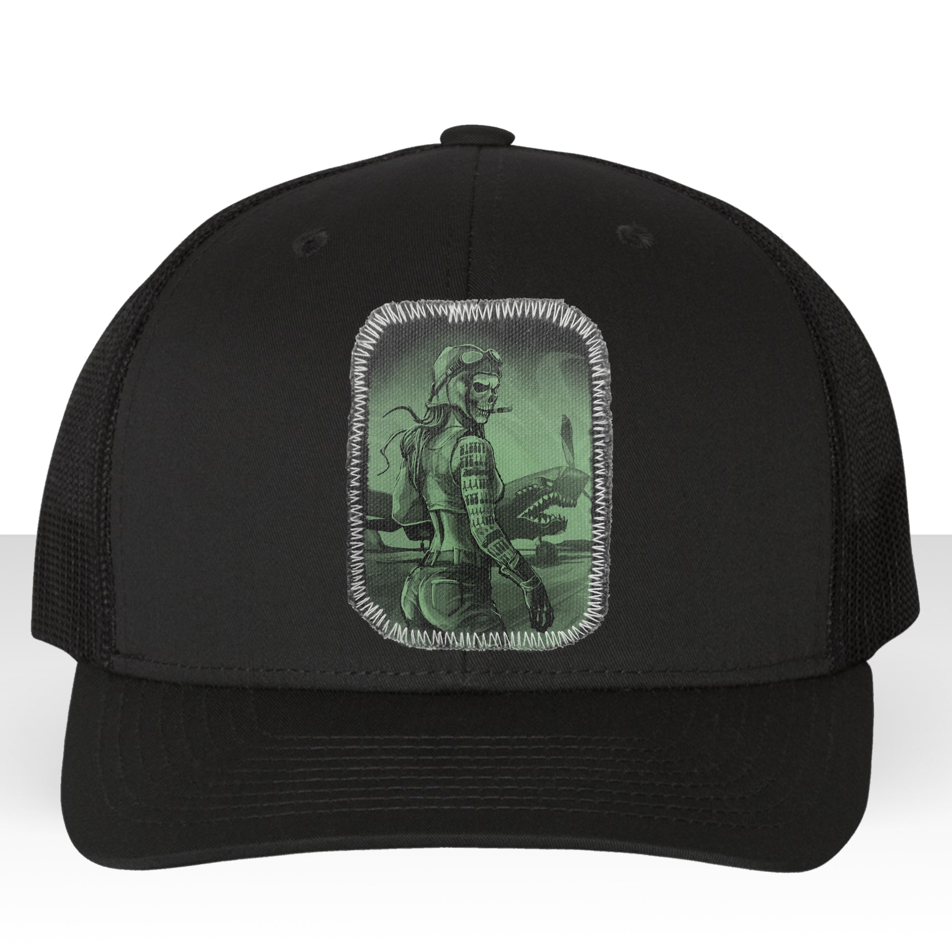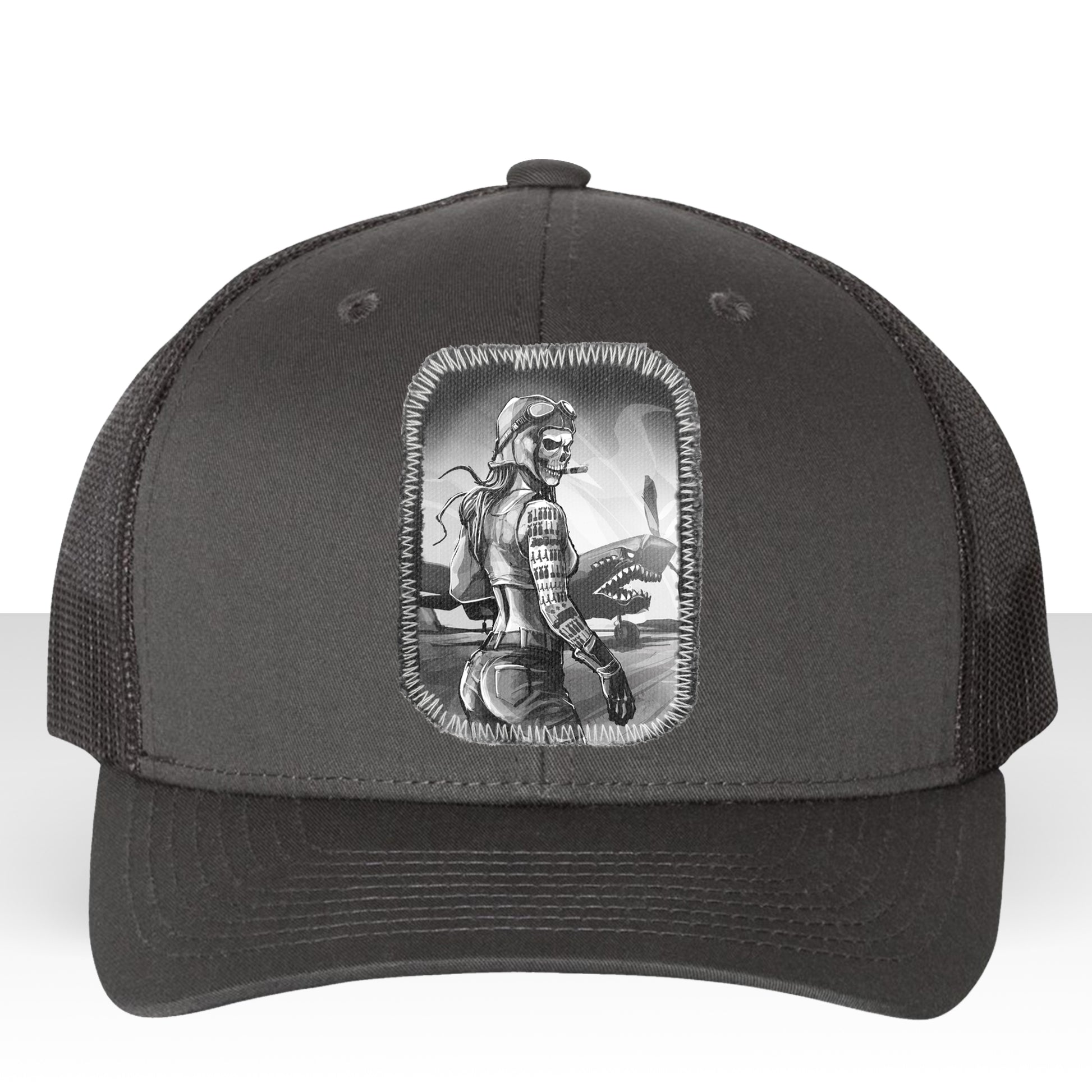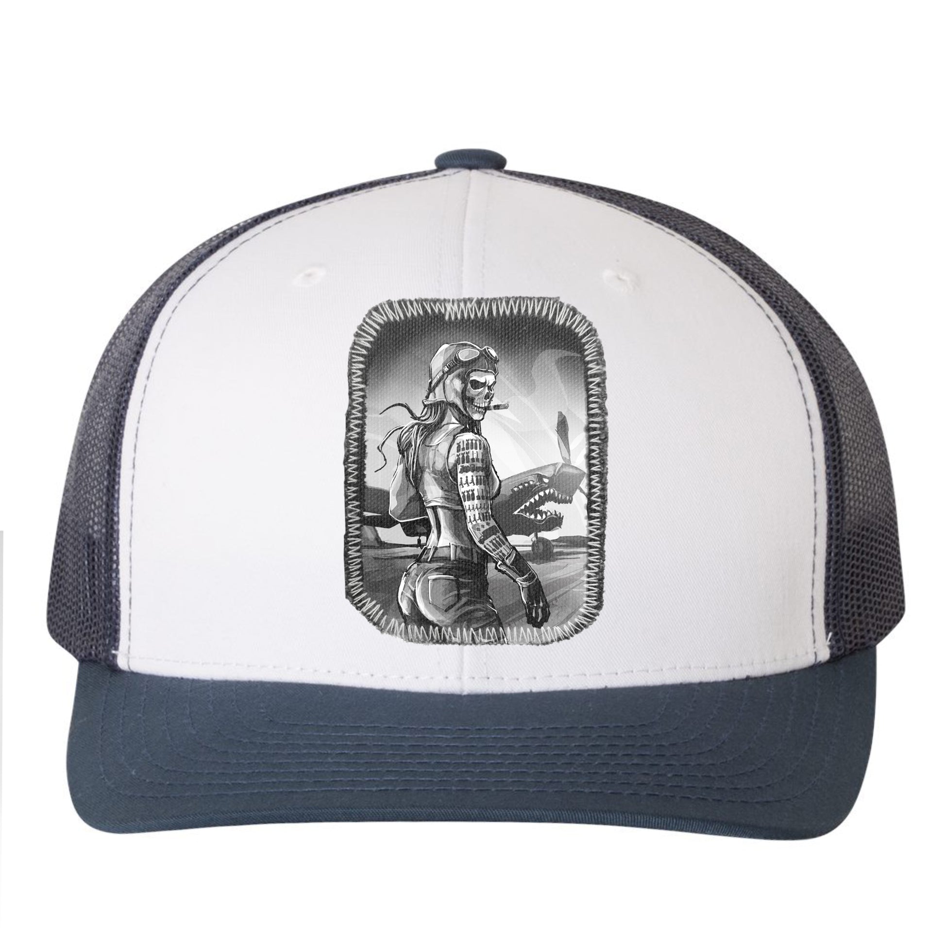 Honor the fierce spirit of aviation with our "Pilot's Tally: Conquer the Skies" print. This striking design features a formidable female pilot with a skull face, her combat victories tallied as tattoos on her arm. She stands defiantly in front of her warbird, a menacing machine adorned with real shark teeth. Rendered in a polished, finished style, this piece highlights Fab's recurring fascination with vintage military themes.