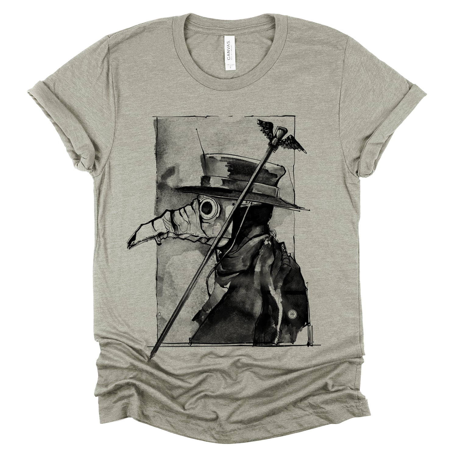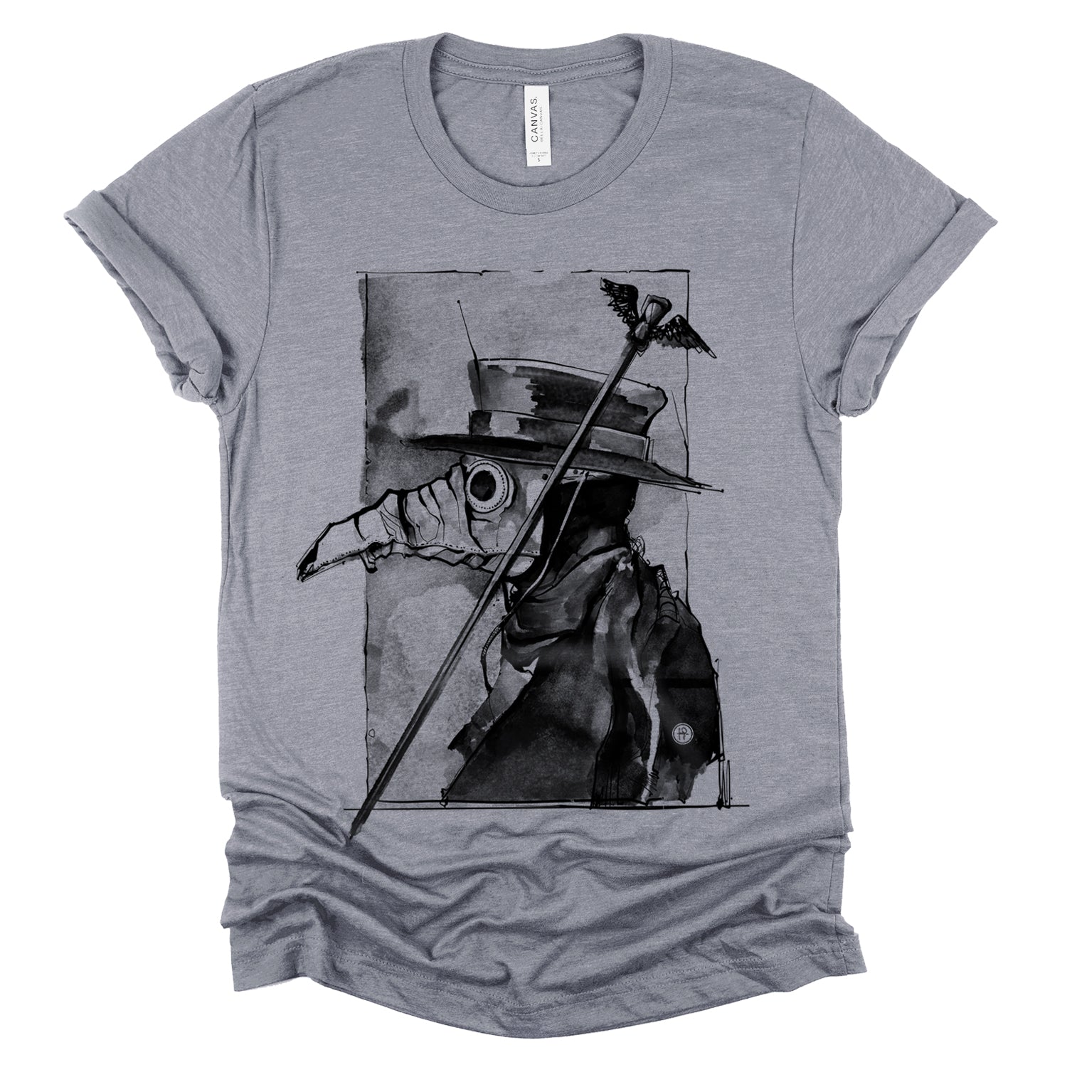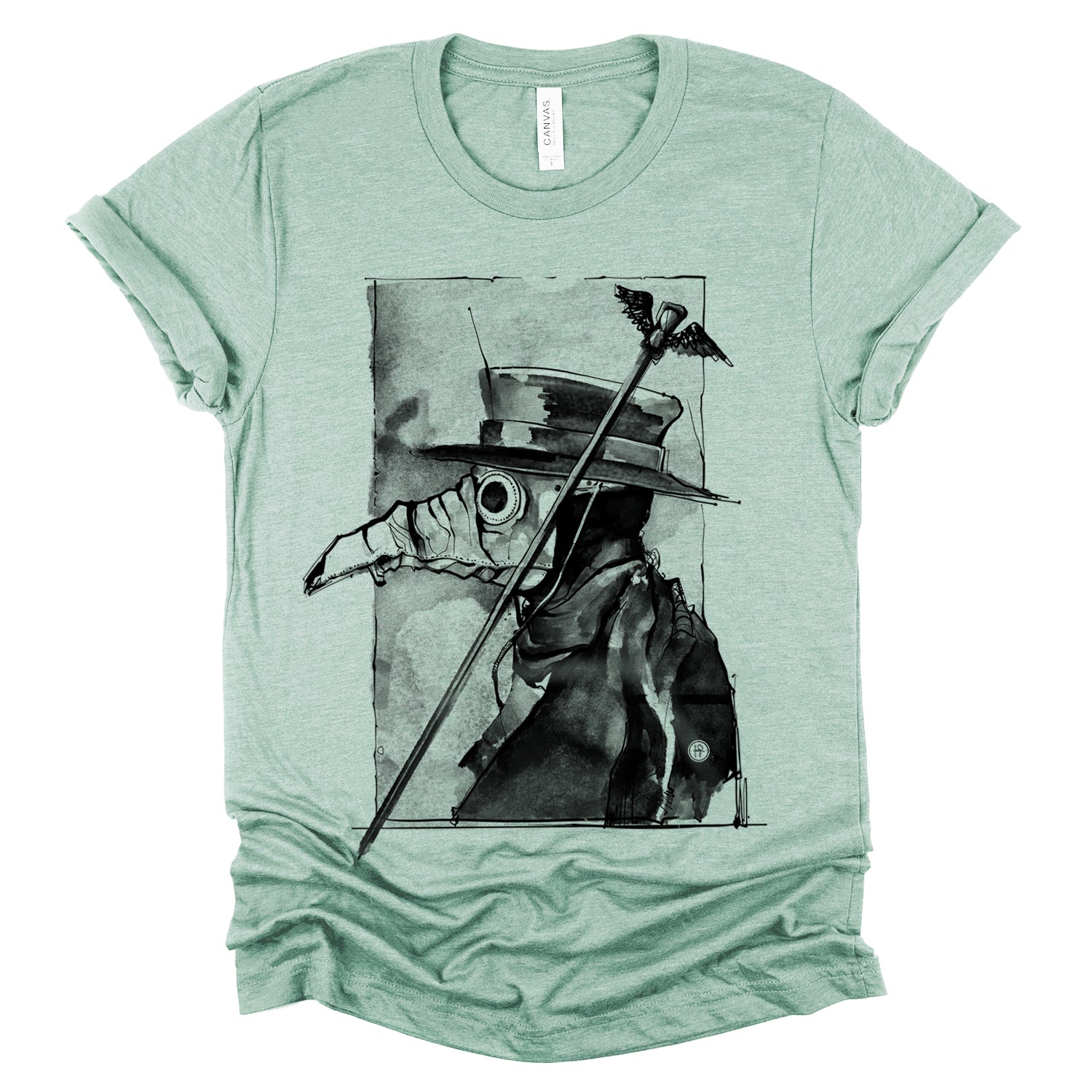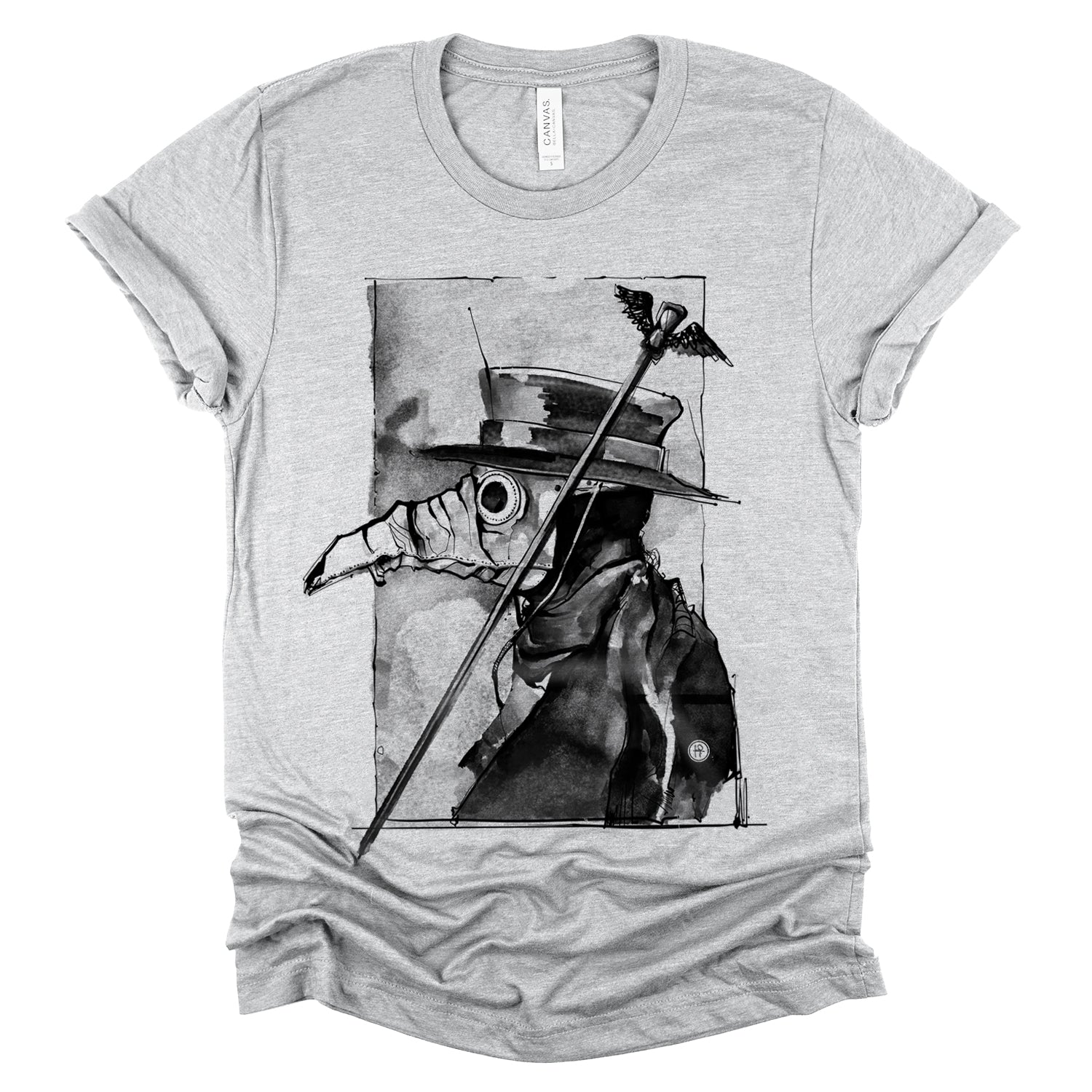 Step into the mysterious world of the "Plague Doctor: Beaked Healer" print. This haunting design pays homage to the enigmatic healers of the past, featuring the iconic beaked mask and flowing robes. The piece exudes a lifeless, almost non-human aura. Fab purposely incorporated noticeable diagonal lines in the half tones, creating an etched, dark ages-like artwork that evokes the eerie atmosphere of medieval times.
