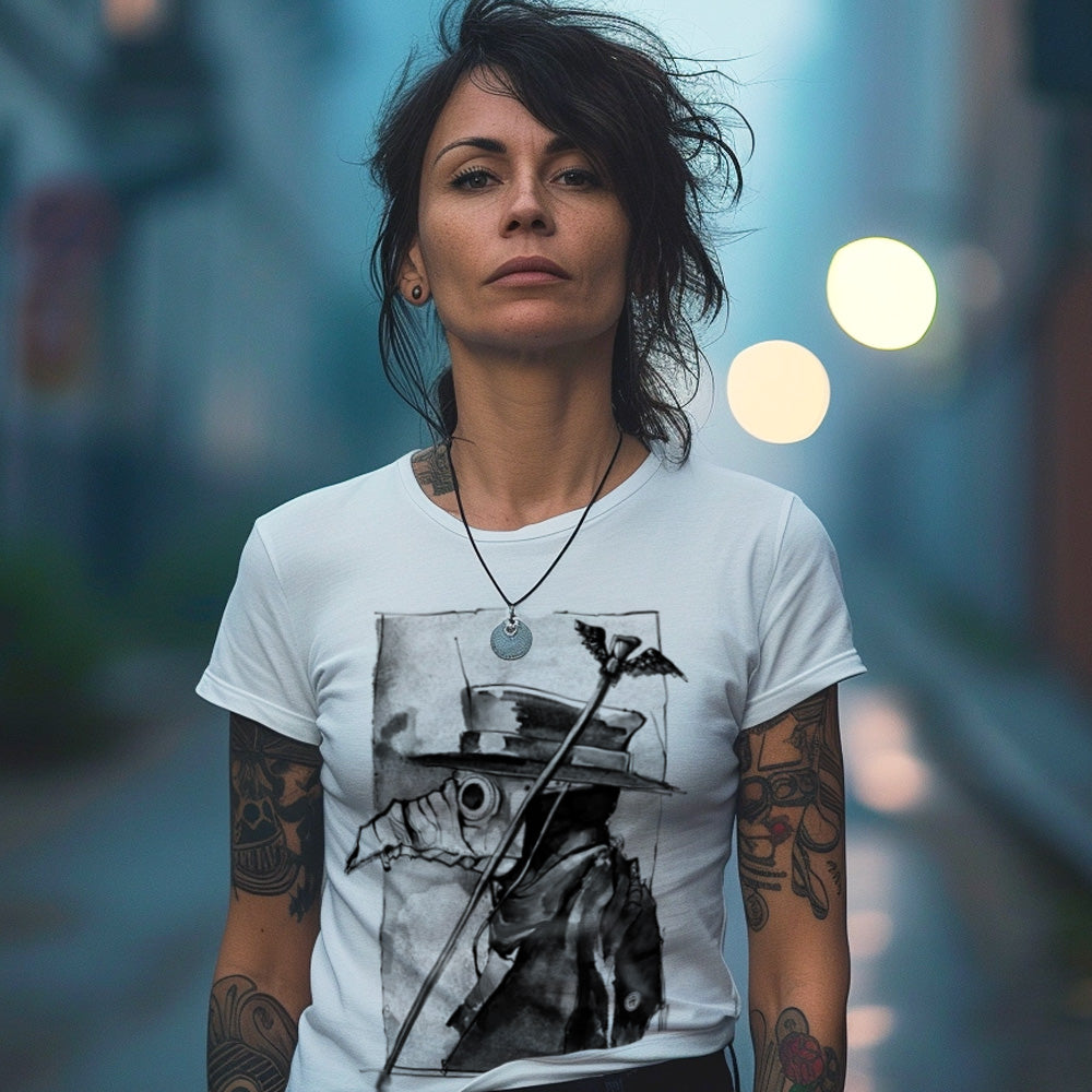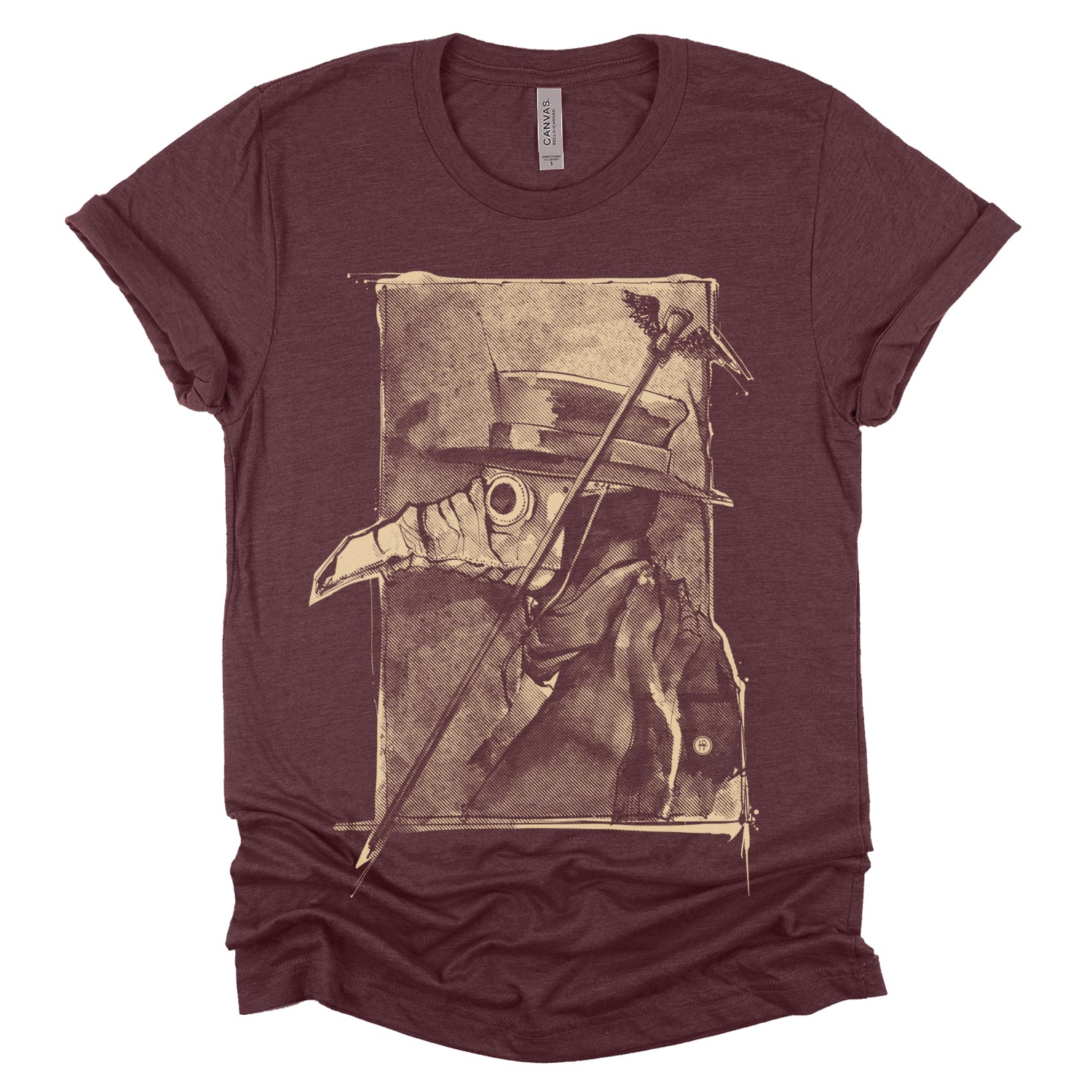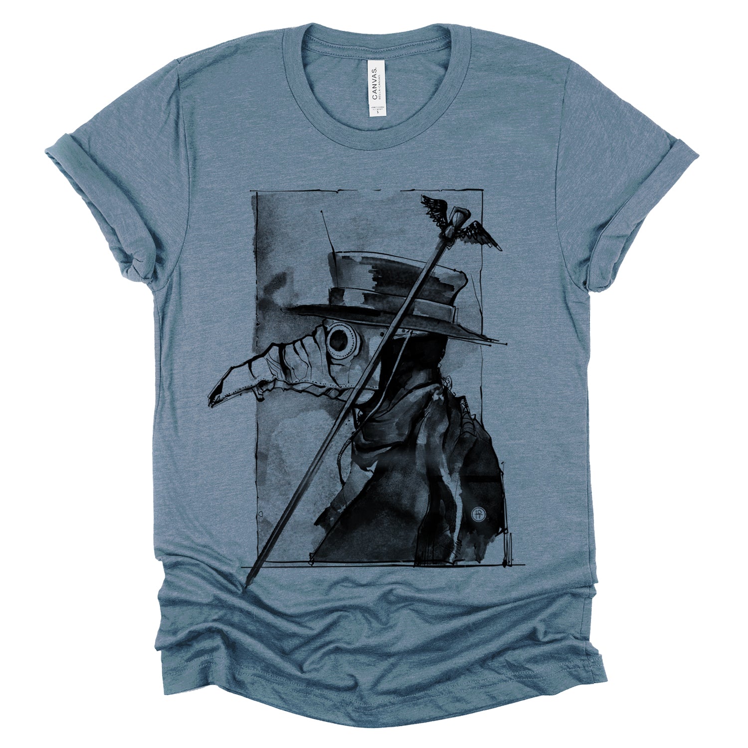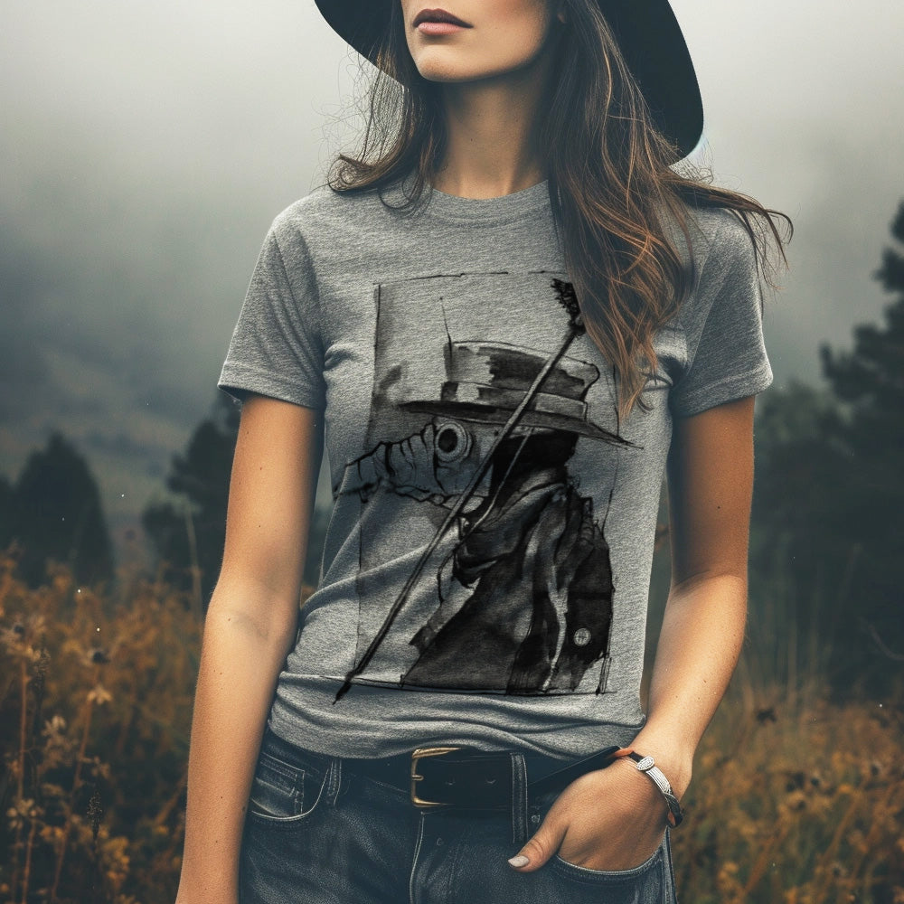 Step into the mysterious world of the "Plague Doctor: Beaked Healer" print. This haunting design pays homage to the enigmatic healers of the past, featuring the iconic beaked mask and flowing robes. The piece exudes a lifeless, almost non-human aura. Fab purposely incorporated noticeable diagonal lines in the half tones, creating an etched, dark ages-like artwork that evokes the eerie atmosphere of medieval times.
