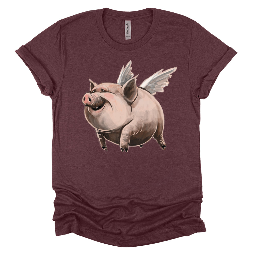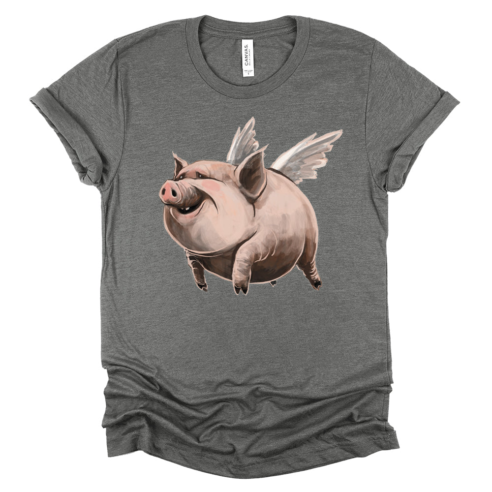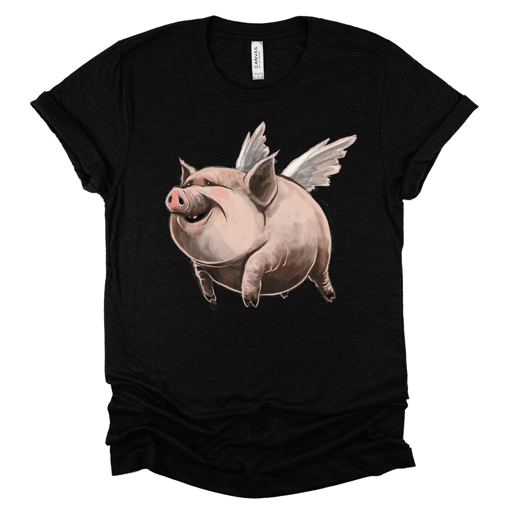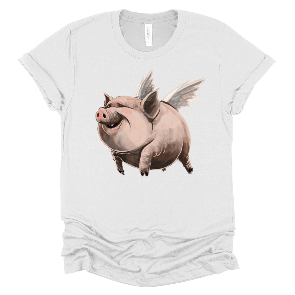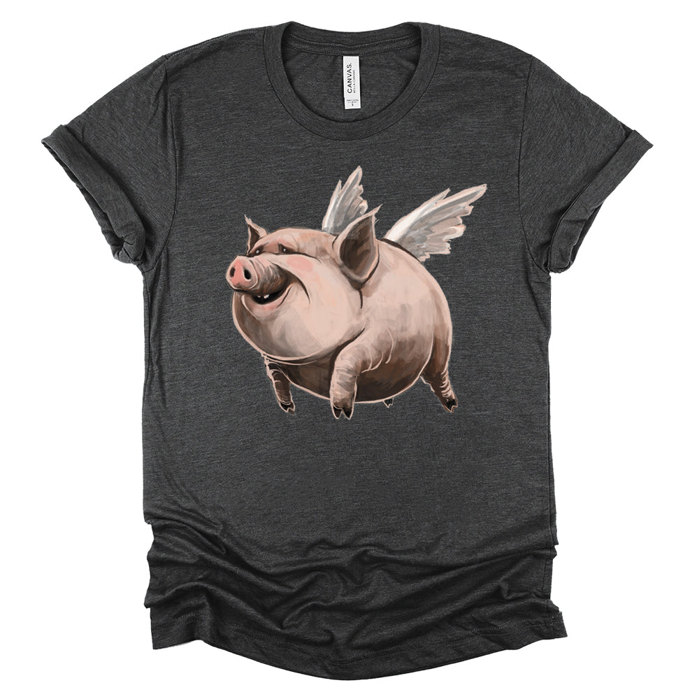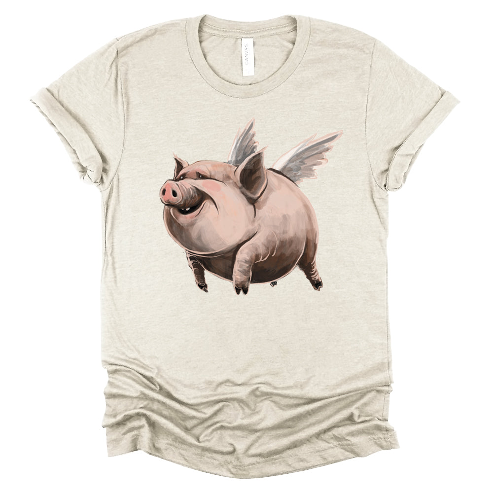 A whimsical, chubby flying pig defying gravity with tiny, determined wings! This full-color DTG design bursts with charm, featuring soft, painterly textures and a playful expression that says, "Yeah, I can fly... kinda." With a hint of mischief and a whole lot of belly, this airborne porker brings humor and magic to your wardrobe. Perfect for dreamers, bacon lovers, and anyone who believes in the impossible! 🐷✨☁️