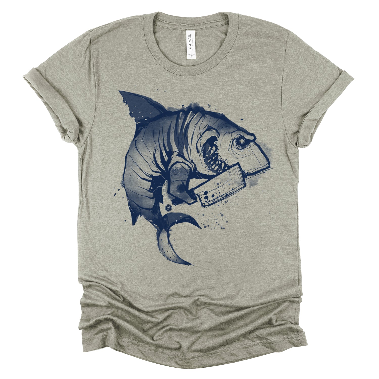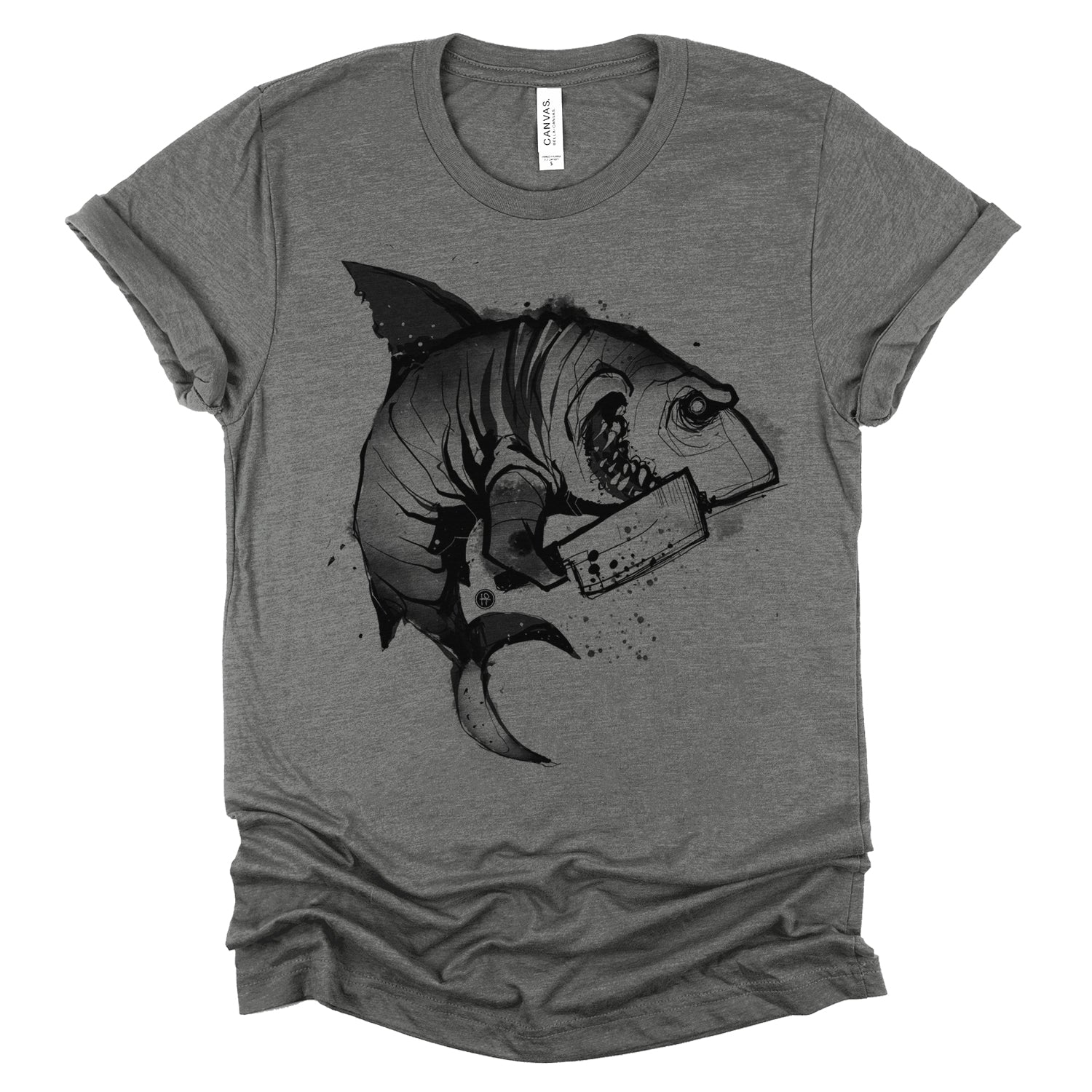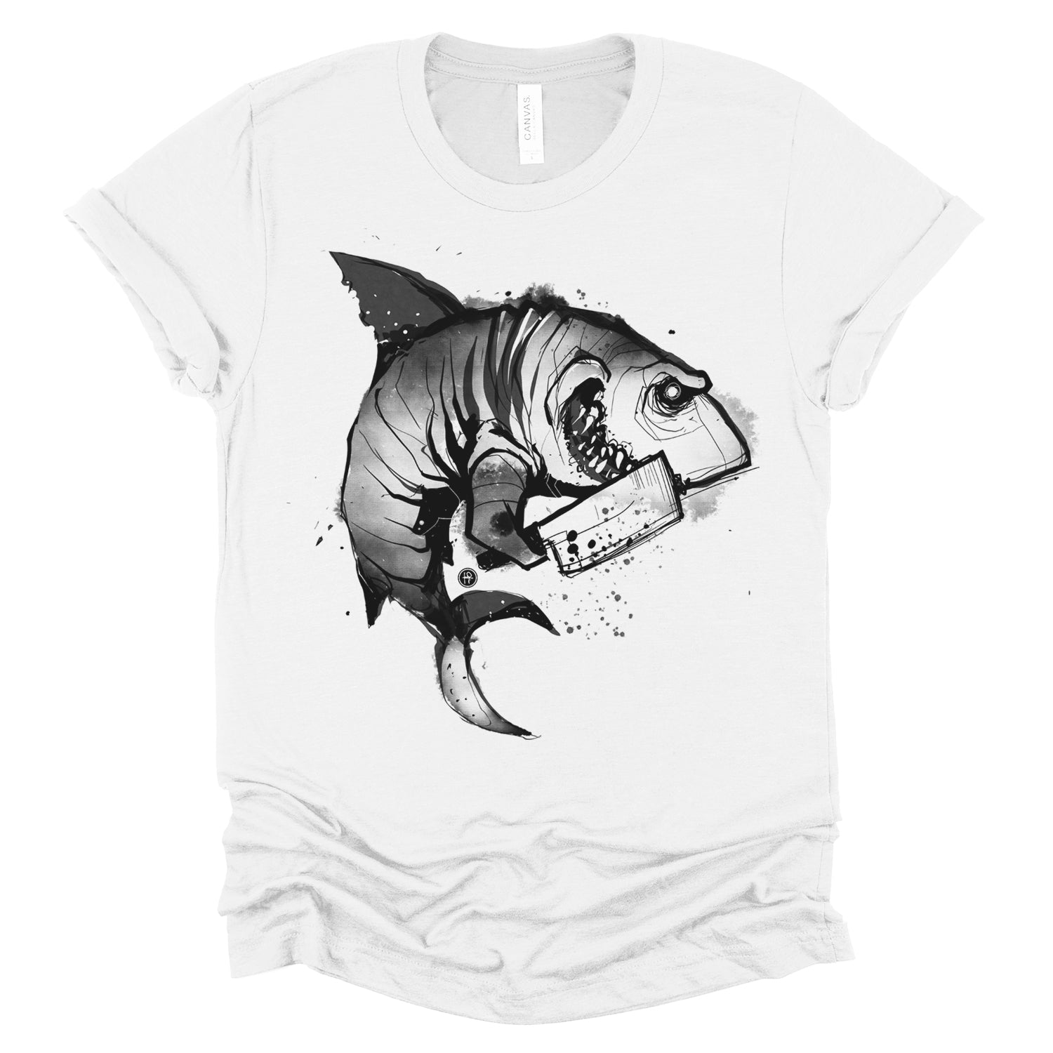 Enter the realm of aquatic horror with our "Psycho Shark: Unleash the Terror" print where the depths of the ocean meet the edge of madness. This gripping design features a psycho shark brandishing a menacing machete, ready to strike fear into the hearts of all who dare to cross its path. Fab employed extreme contrast in line work, ranging from 1-inch thick lines to sharp marks, alongside exaggerated big round halftones for shading—creating a messy, energetic cartoon style.