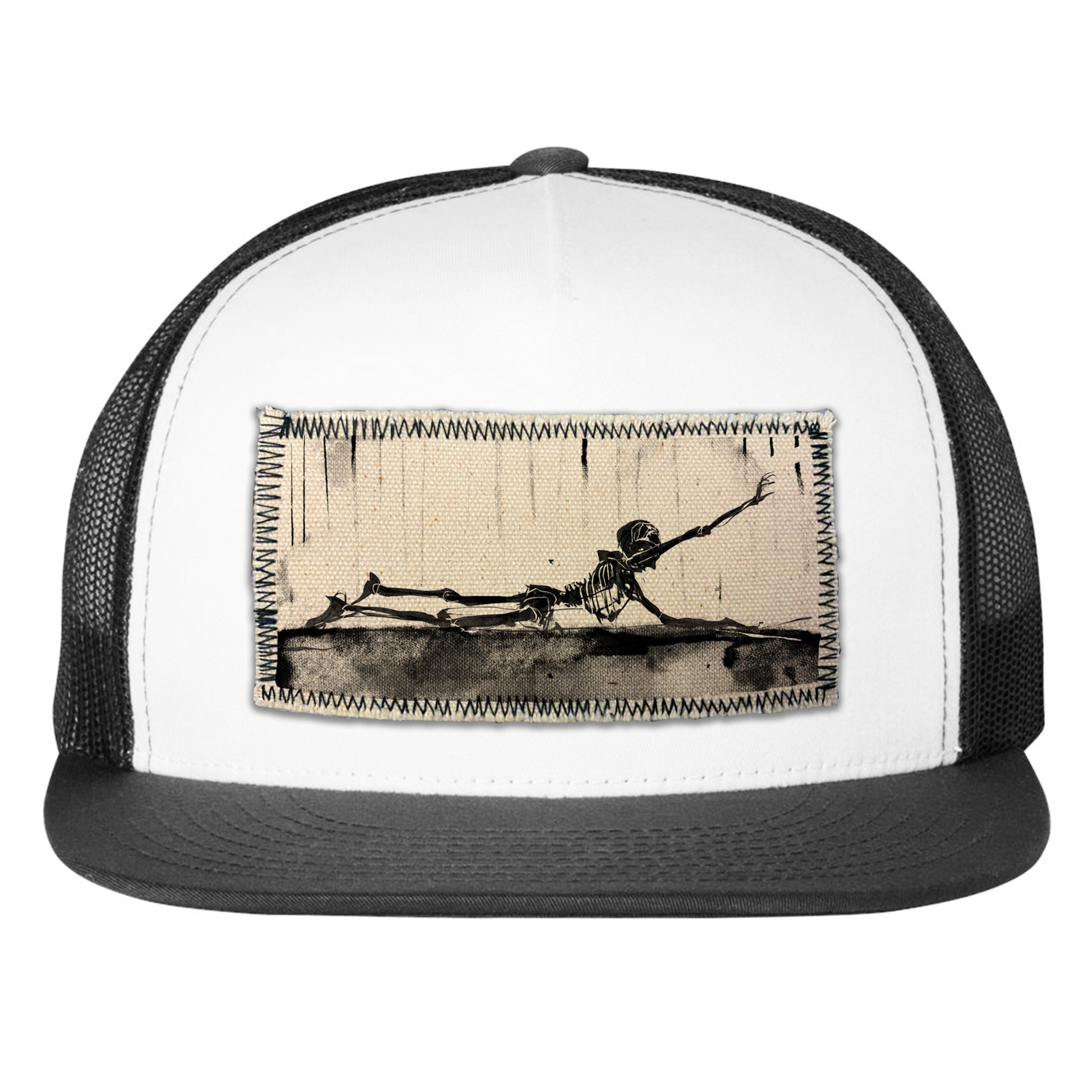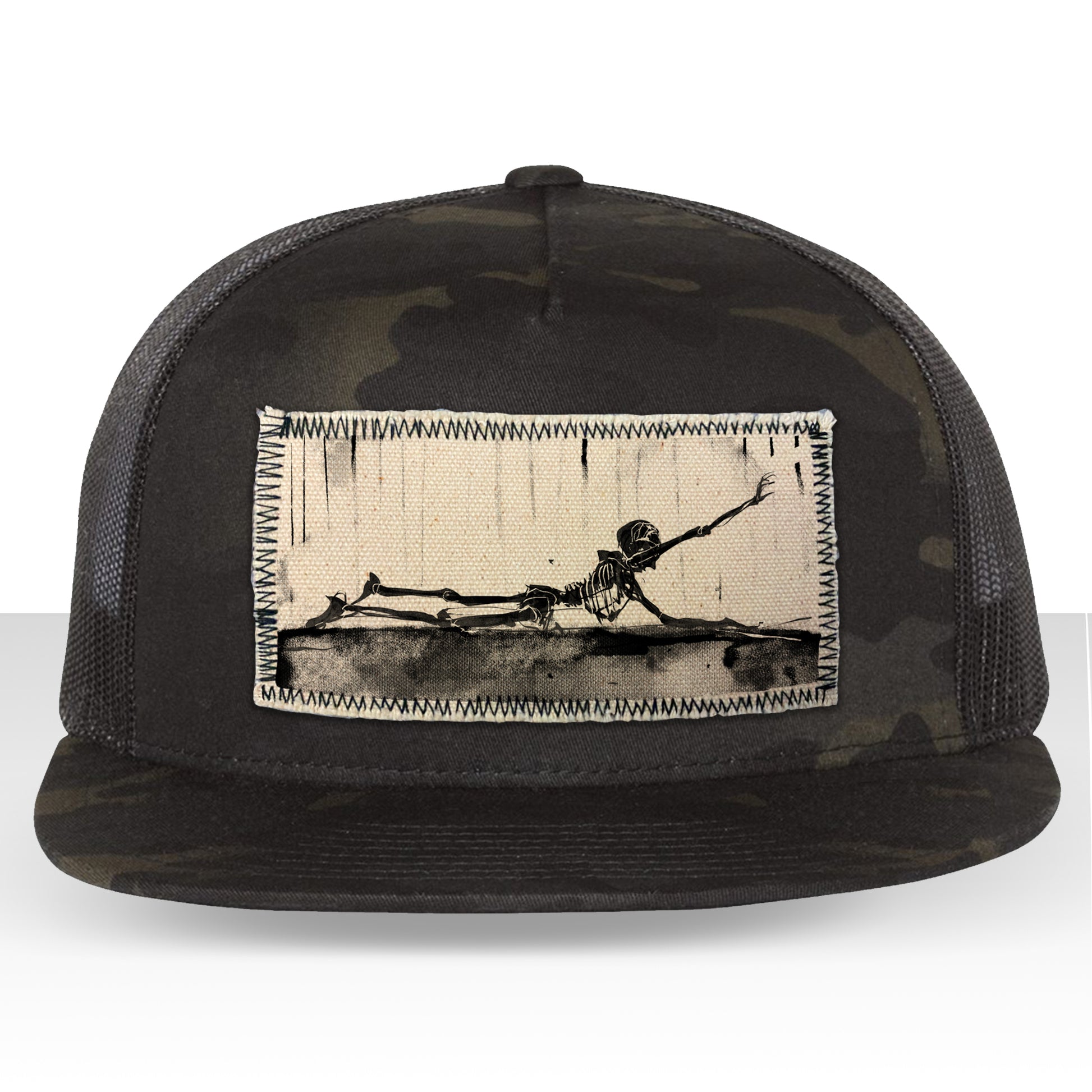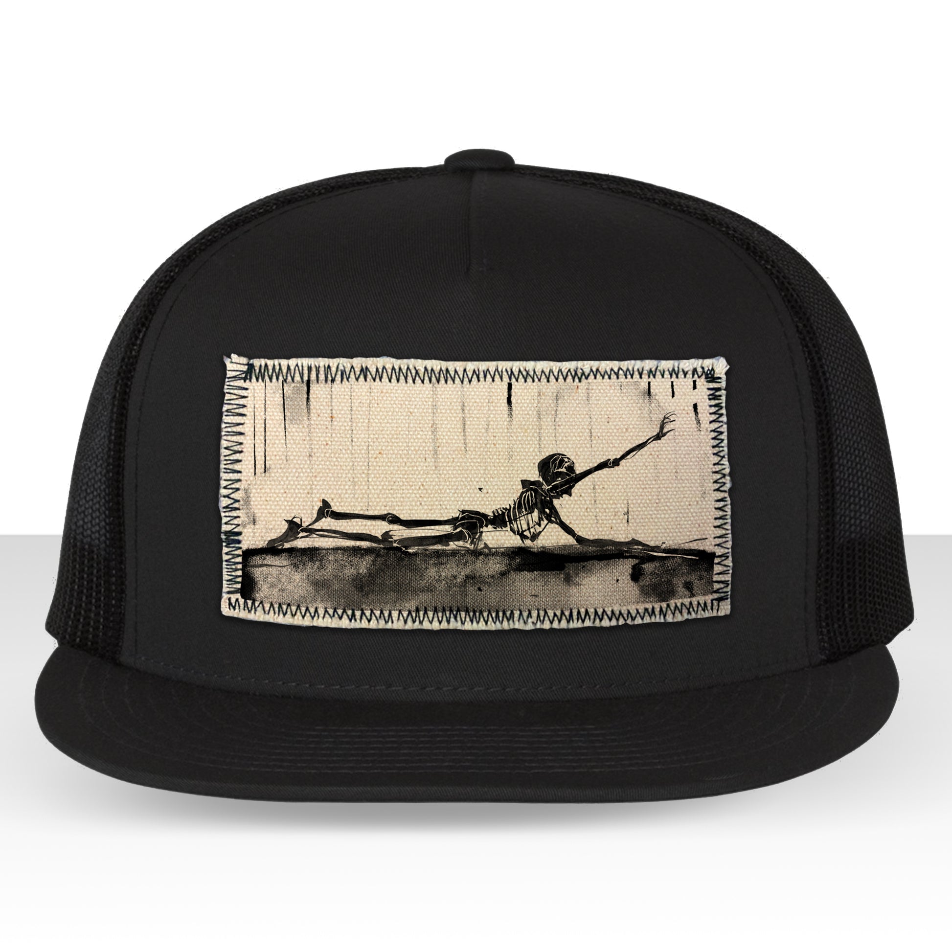 We meticulously hand-cut and stitch each patch before screen printing with water-based inks. For our hats, we use YP Classics - Five-Panel Classic Trucker for flat bills with a high profile, and YP Classics - Six-Panel Trucker Cap for curved bills with a mid profile. Both styles feature a 65/35 polyester/cotton blend, a mesh back, and a snapback closure. These trucker hats showcase FabCreates' signature gritty, imperfect style.
