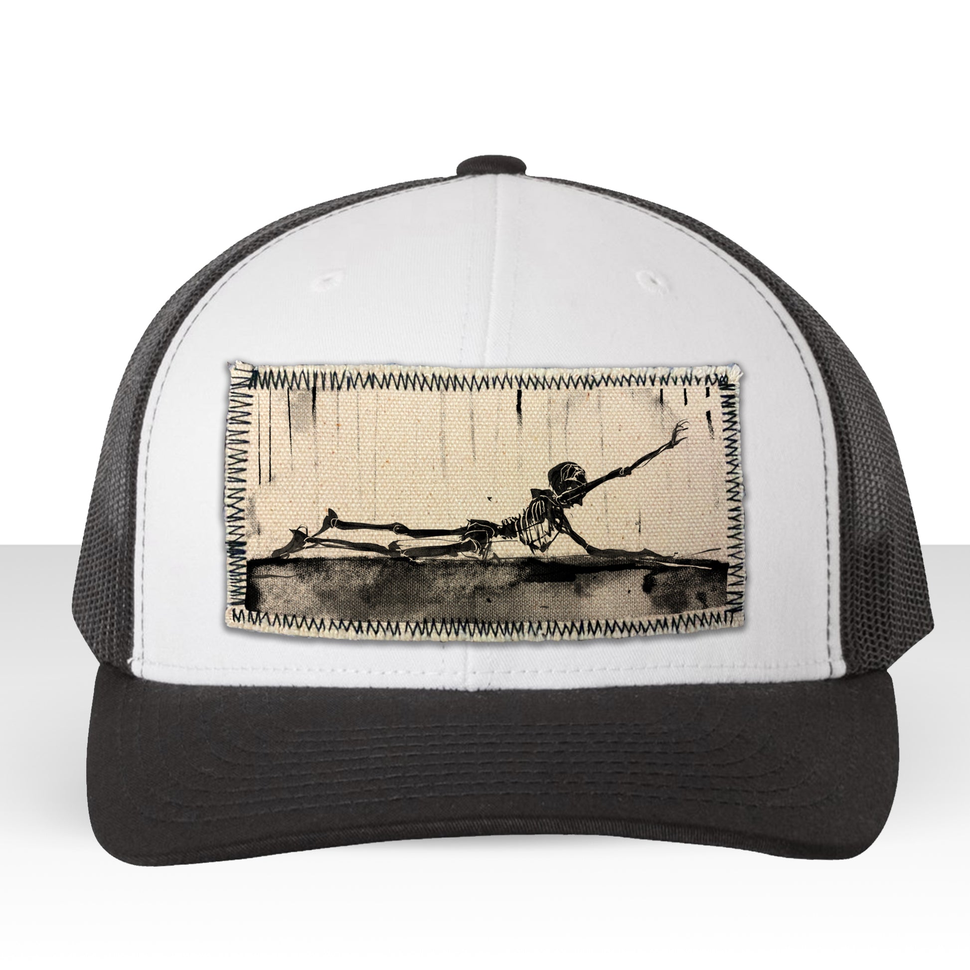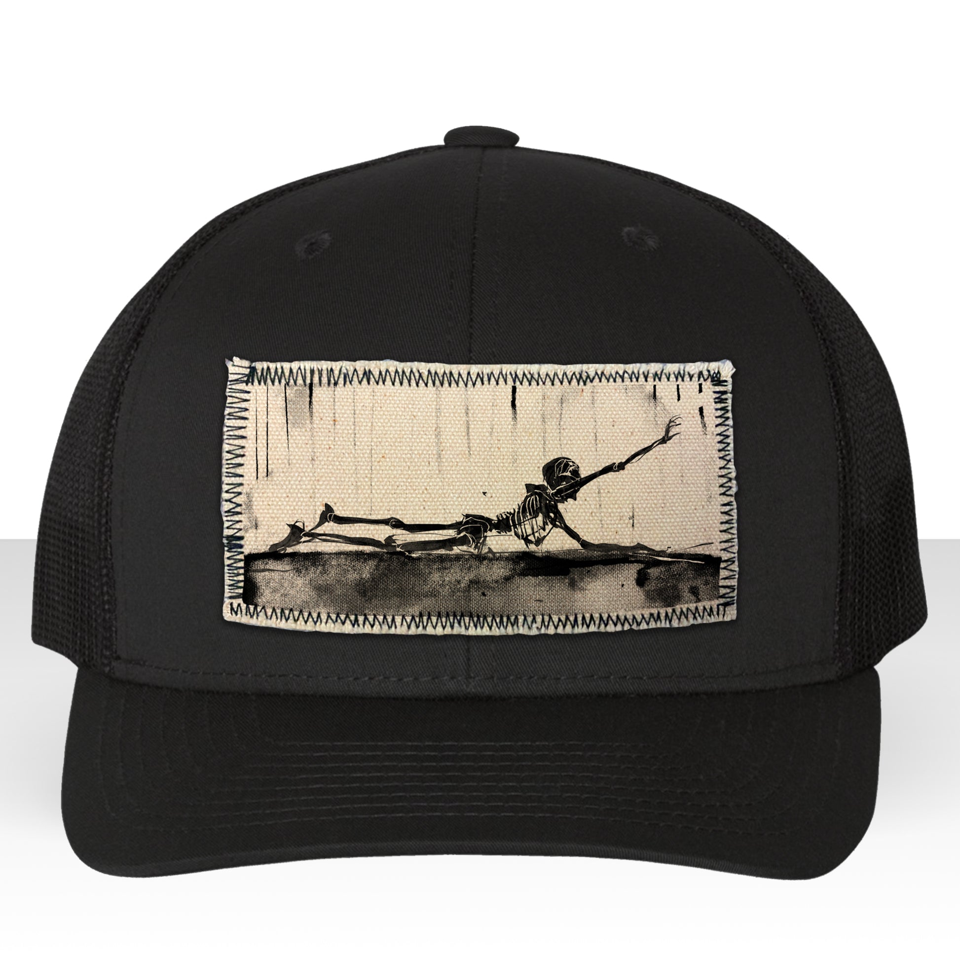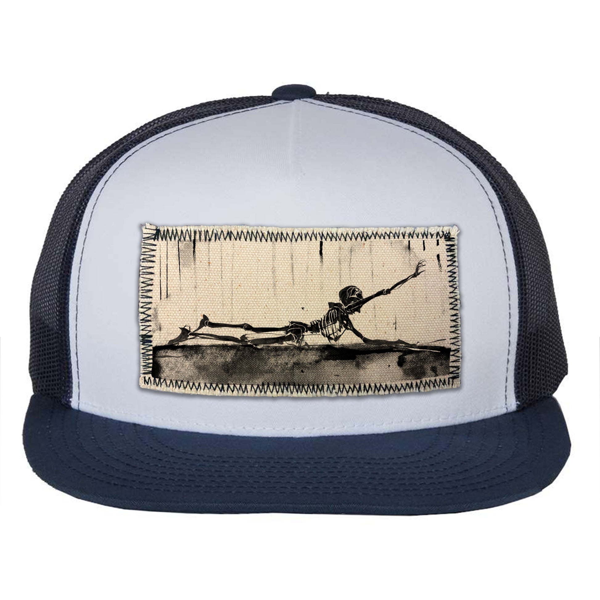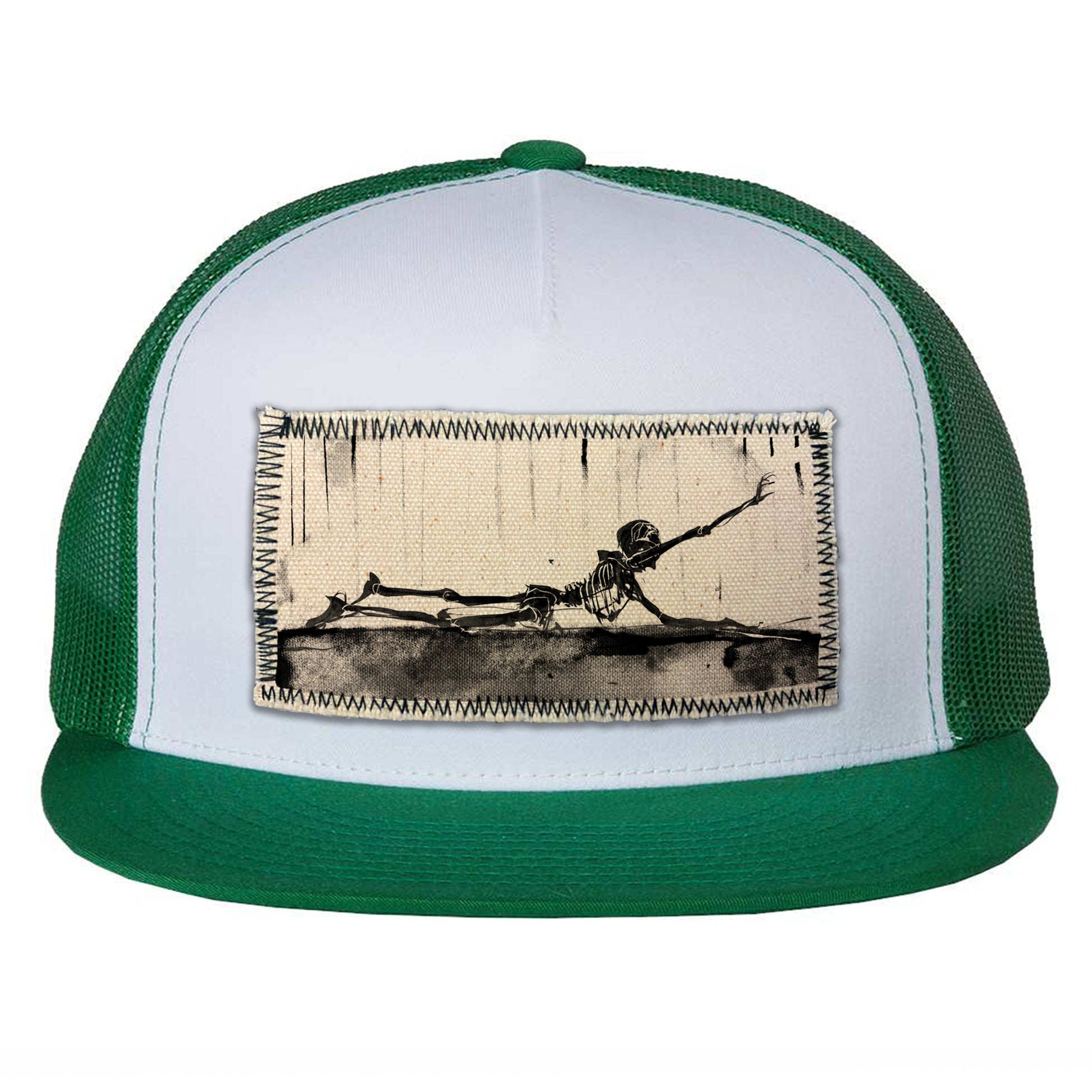 We meticulously hand-cut and stitch each patch before screen printing with water-based inks. For our hats, we use YP Classics - Five-Panel Classic Trucker for flat bills with a high profile, and YP Classics - Six-Panel Trucker Cap for curved bills with a mid profile. Both styles feature a 65/35 polyester/cotton blend, a mesh back, and a snapback closure. These trucker hats showcase FabCreates' signature gritty, imperfect style.