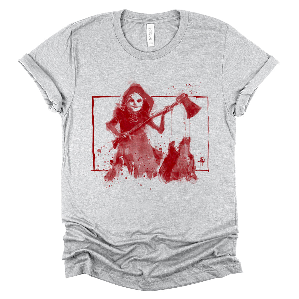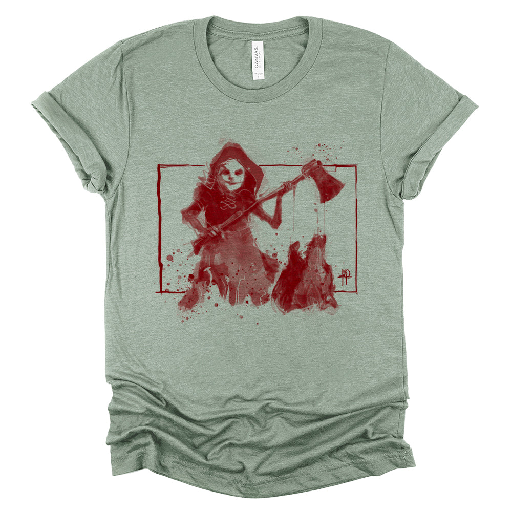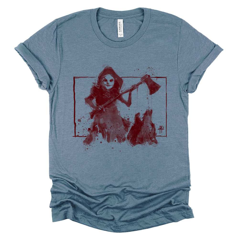 This isn’t the fairy tale you remember. Red Revenge reimagines Little Red Riding Hood as the true predator, standing victorious as she holds the wolf’s severed head, dripping in crimson proof of her vengeance. With her cloak tattered and axe still wet, this design blends gritty horror with dark storytelling, proving that sometimes, the hunted becomes the hunter.