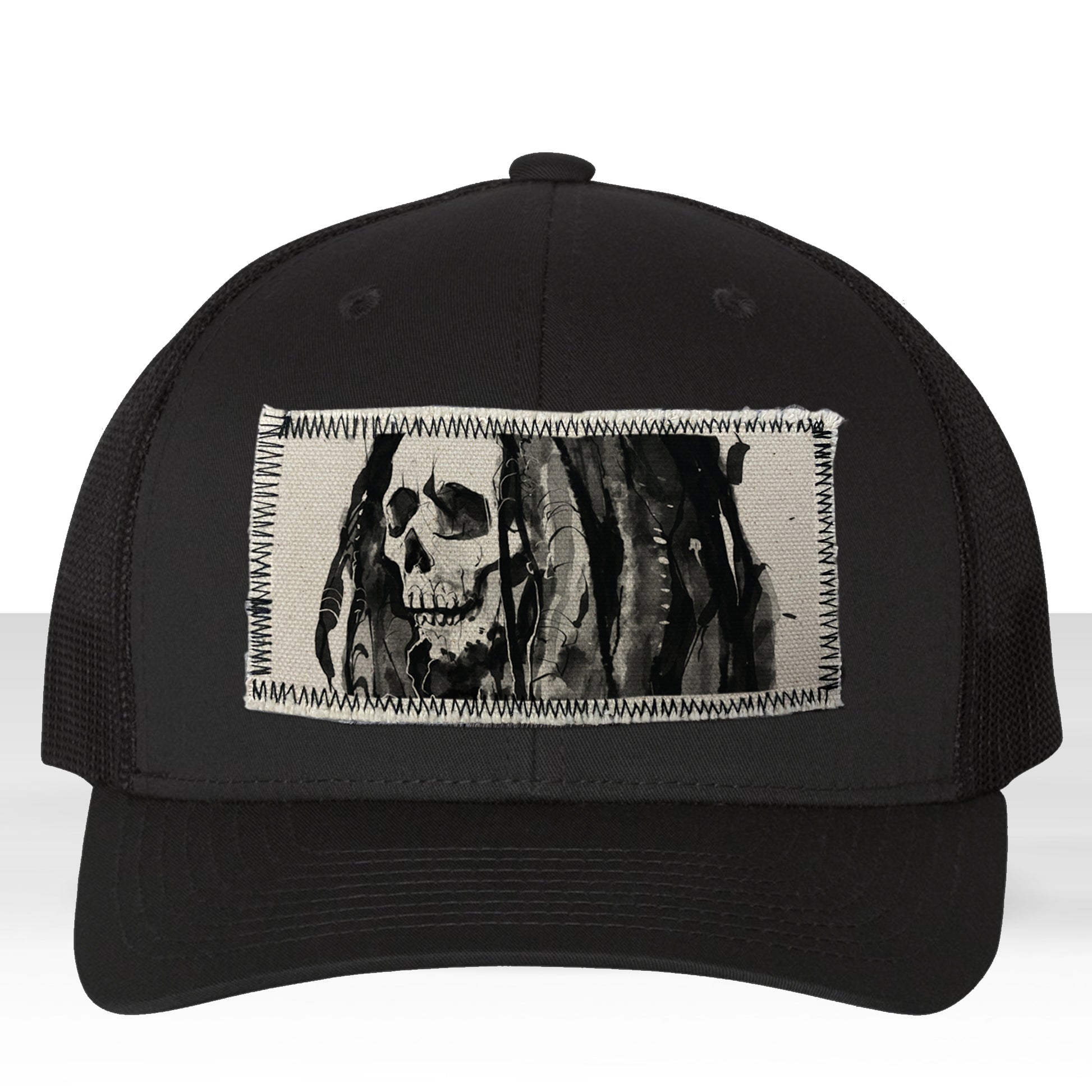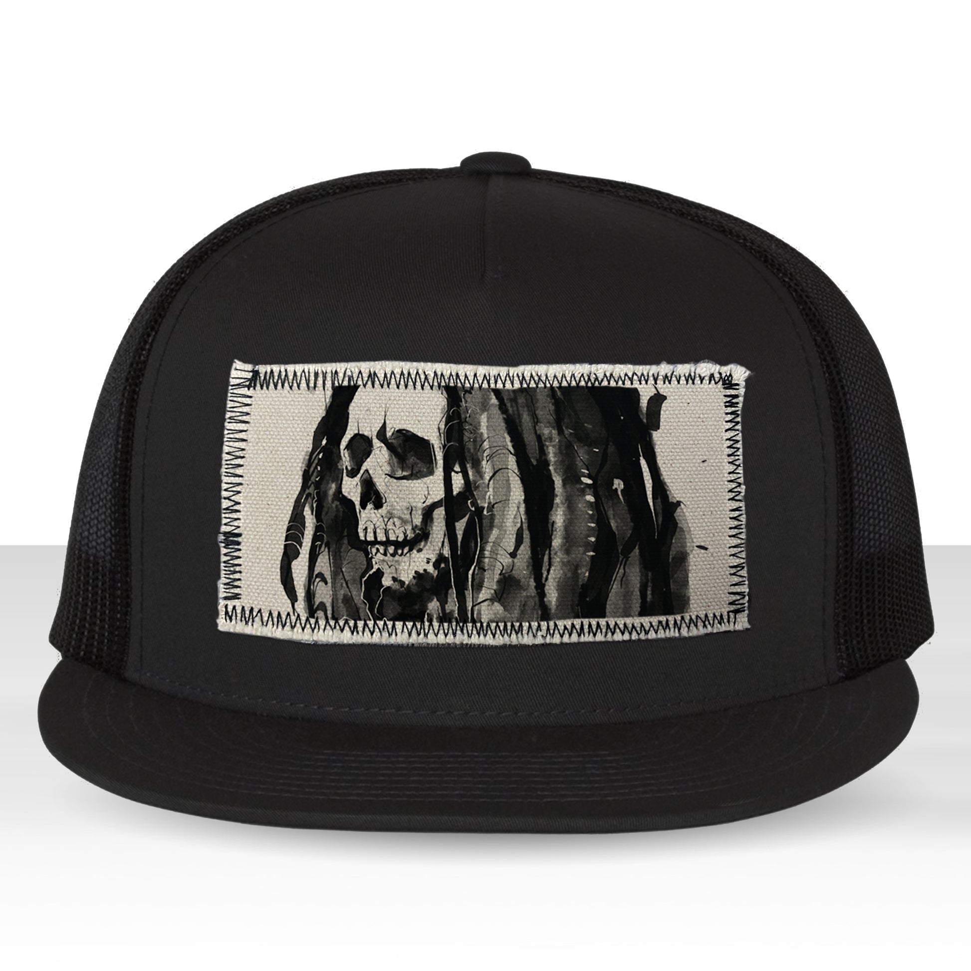 We meticulously hand-cut and stitch each patch before screen printing with water-based inks. For our hats, we use YP Classics - Five-Panel Classic Trucker for flat bills with a high profile, and YP Classics - Six-Panel Trucker Cap for curved bills with a mid profile. Both styles feature a 65/35 polyester/cotton blend, a mesh back, and a snapback closure. These trucker hats showcase FabCreates' signature gritty, imperfect style.