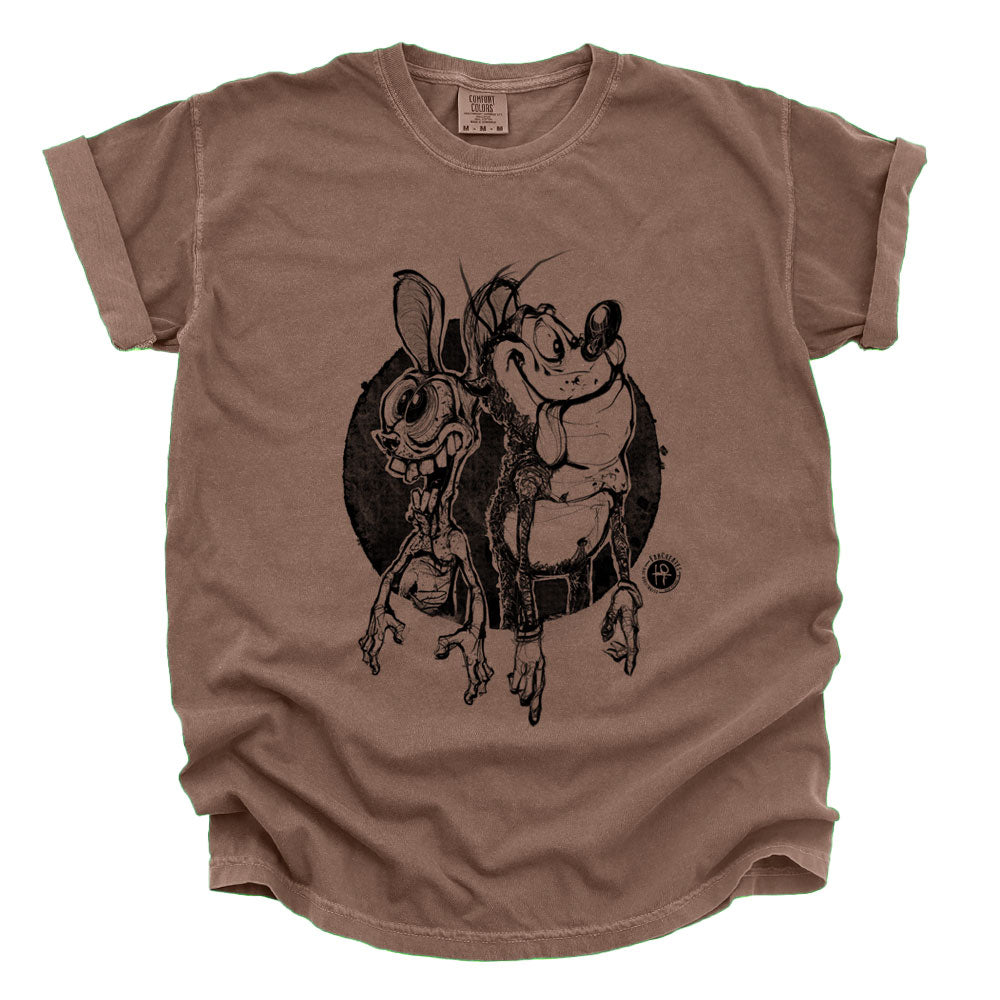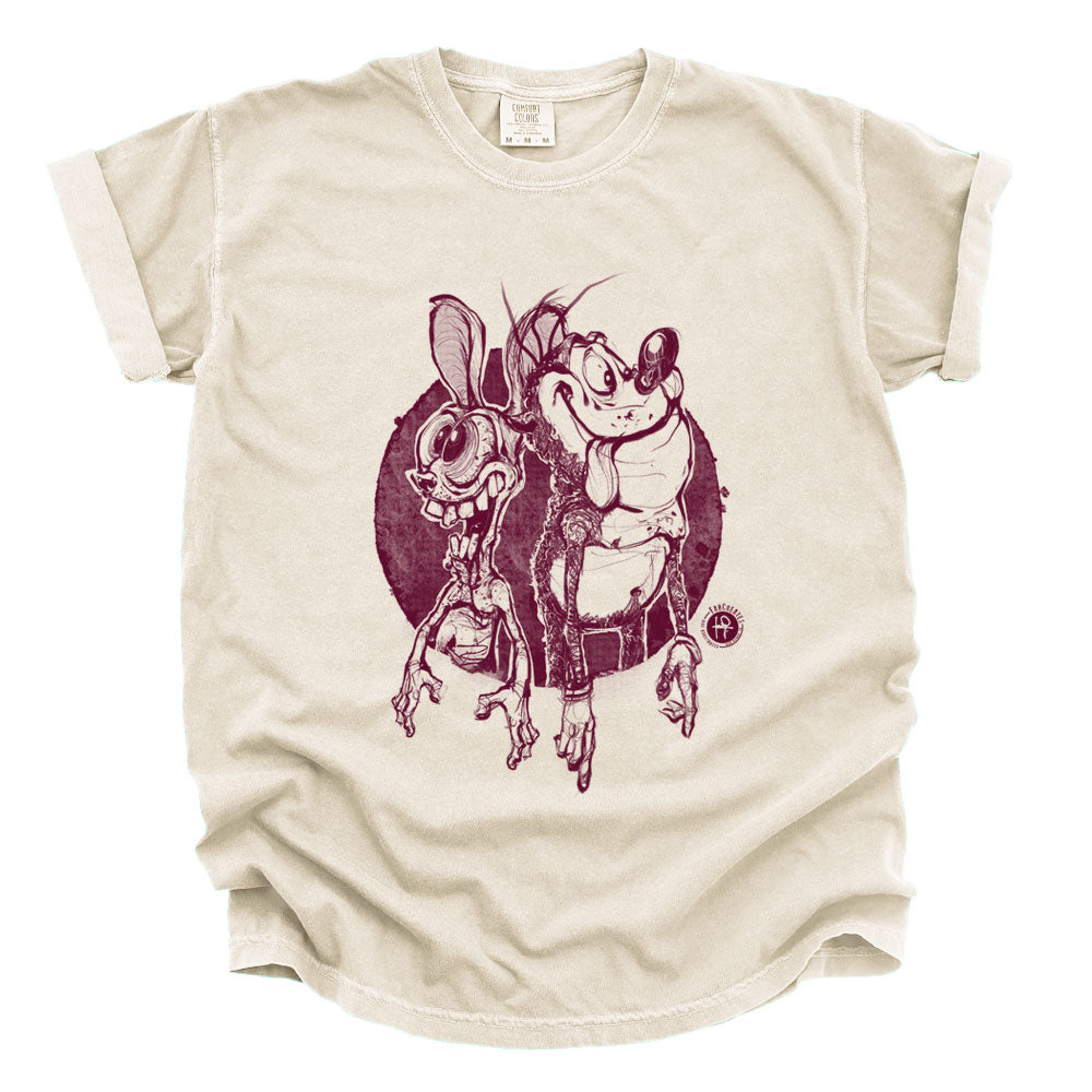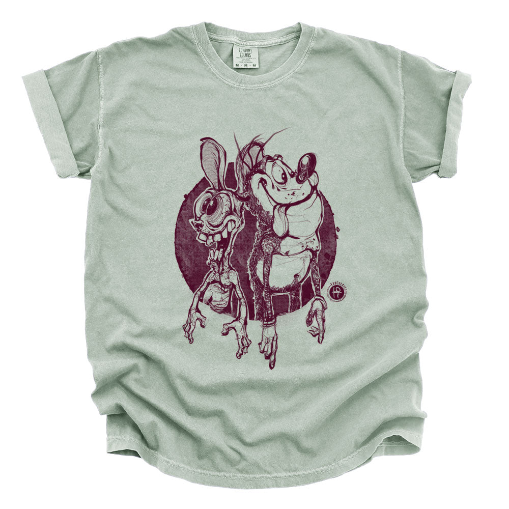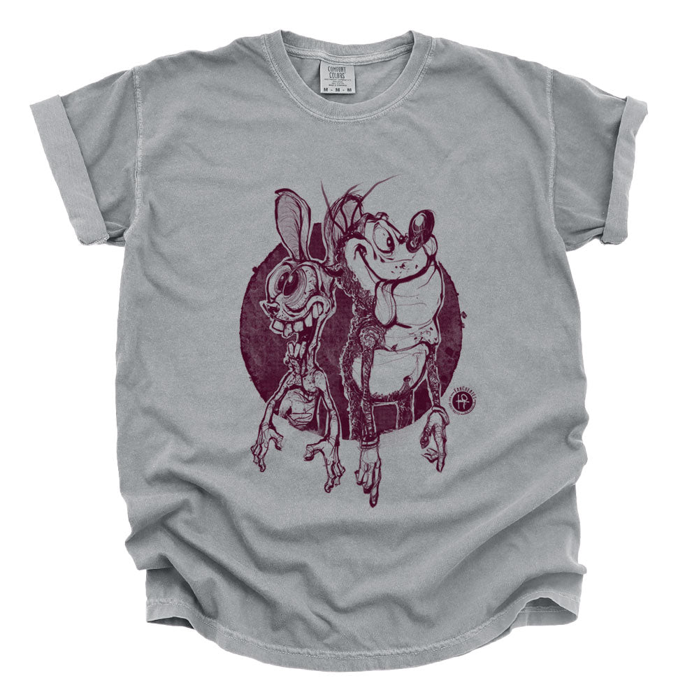 Relive the zany antics with our "Ren & Stimpy: Obscene Nostalgia" print, featuring the iconic duo in all their animated glory. This is undoubtedly Fab's favorite cartoon growing up, with its unique blend of gross-out humor and outlandish antics shaping his creative style. This design captures the whimsical charm of the beloved cartoon, bringing back fond memories of laughter and mischief.