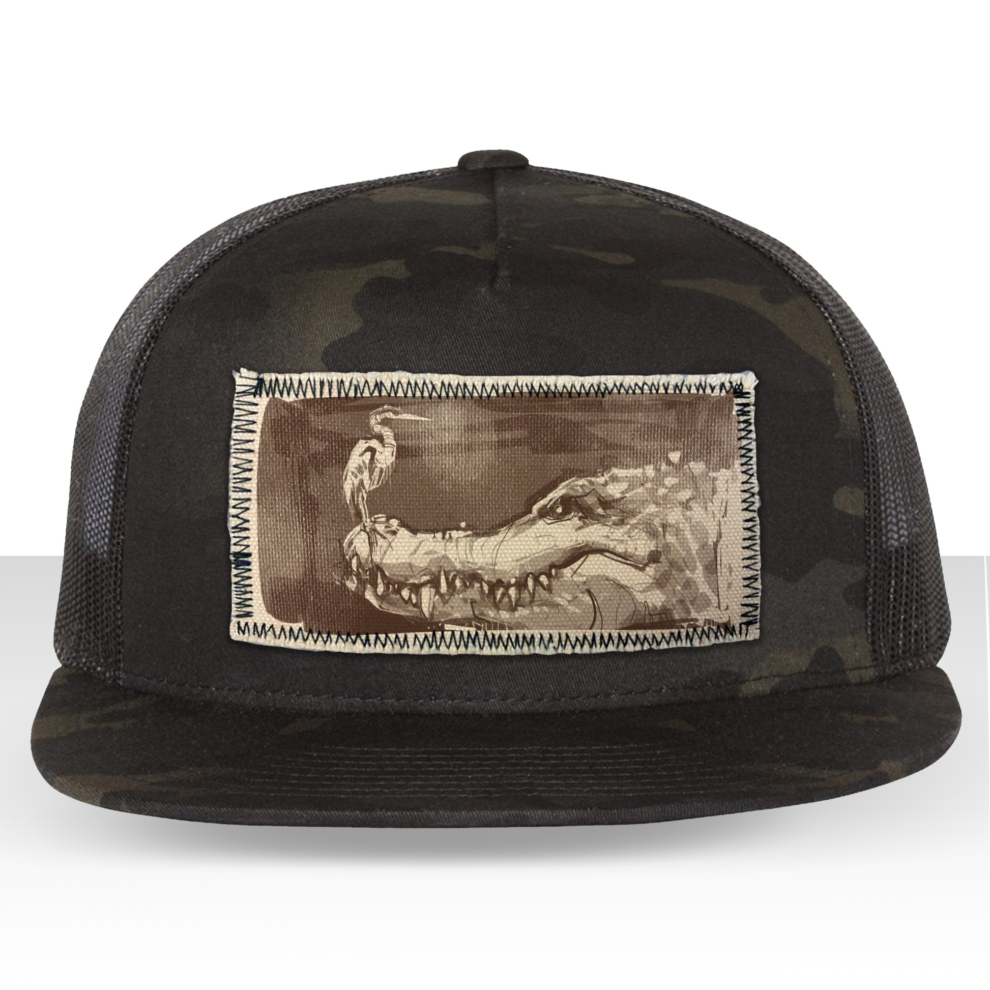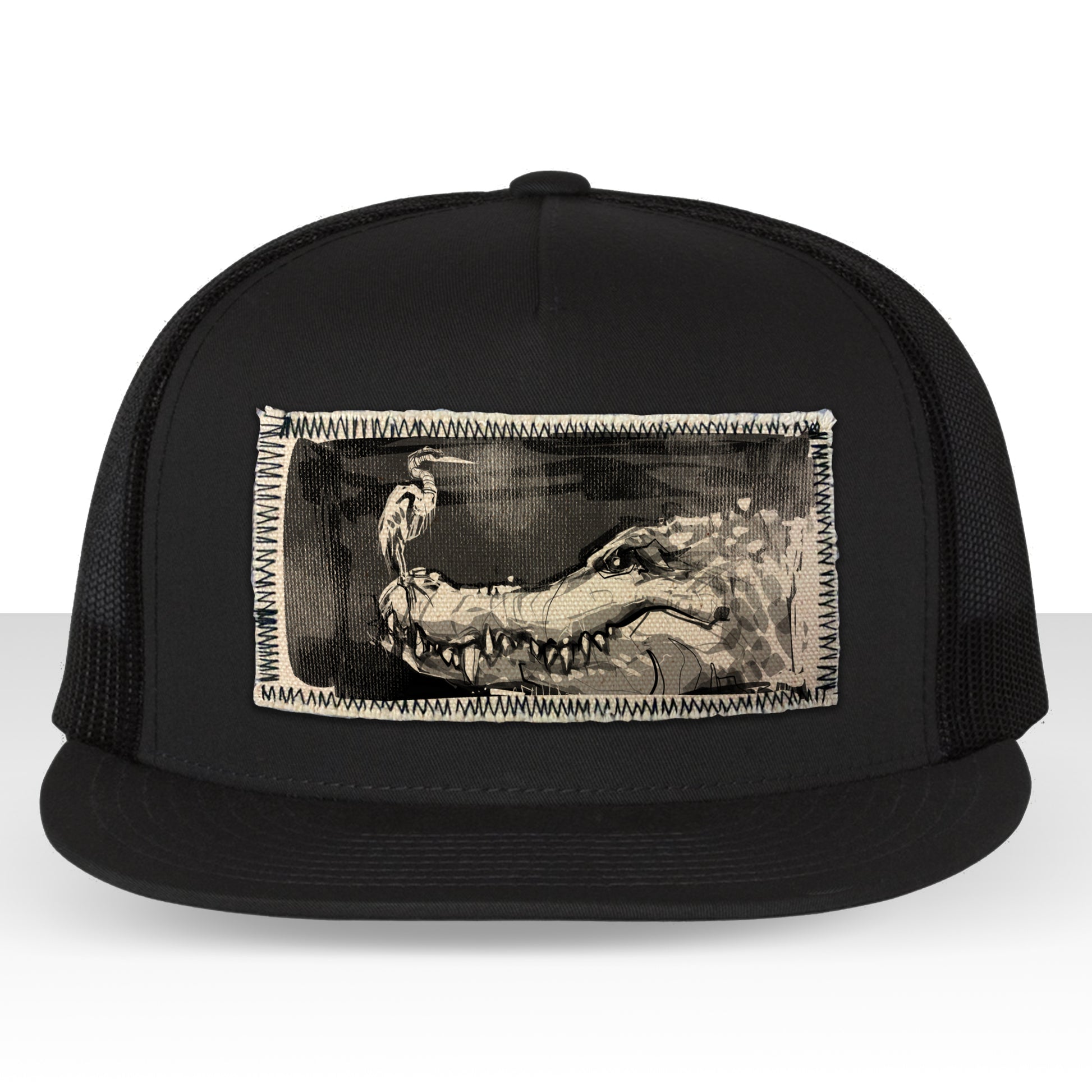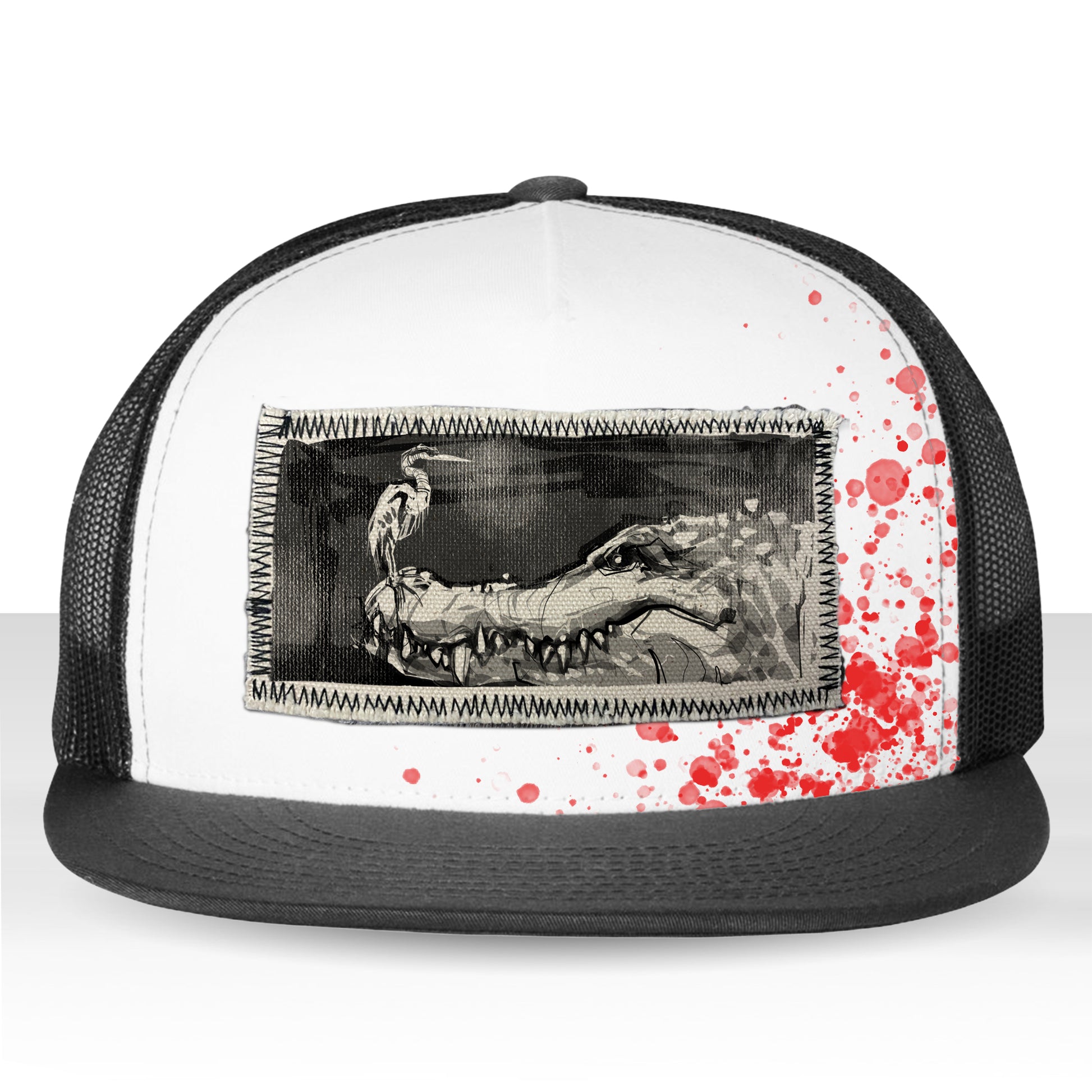 We meticulously hand-cut and stitch each patch before screen printing with water-based inks. For our hats, we use YP Classics - Five-Panel Classic Trucker for flat bills with a high profile, and YP Classics - Six-Panel Trucker Cap for curved bills with a mid profile. Both styles feature a 65/35 polyester/cotton blend, a mesh back, and a snapback closure. These trucker hats showcase FabCreates' signature gritty, imperfect style.